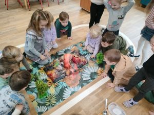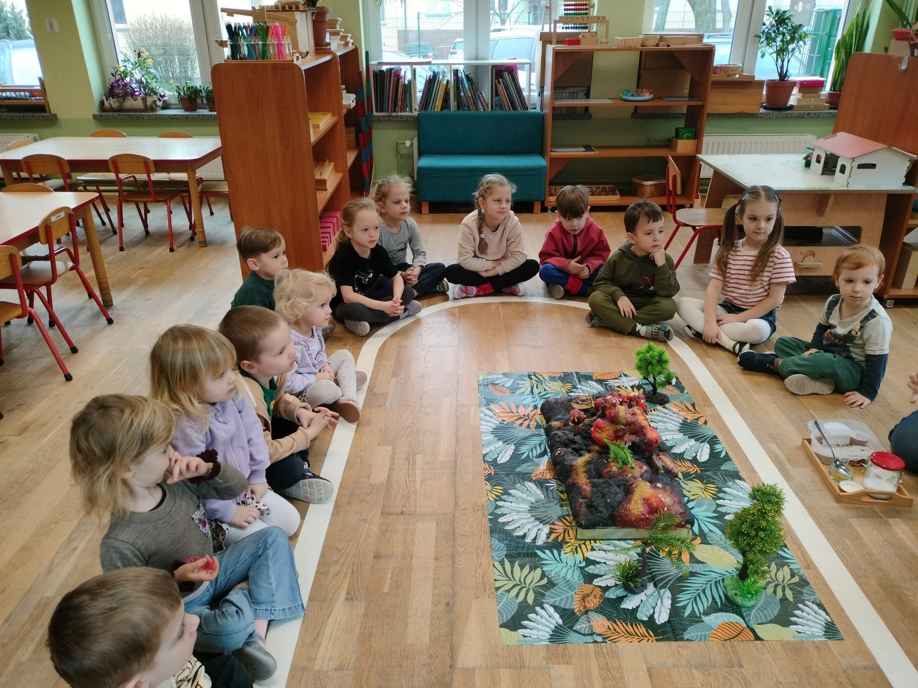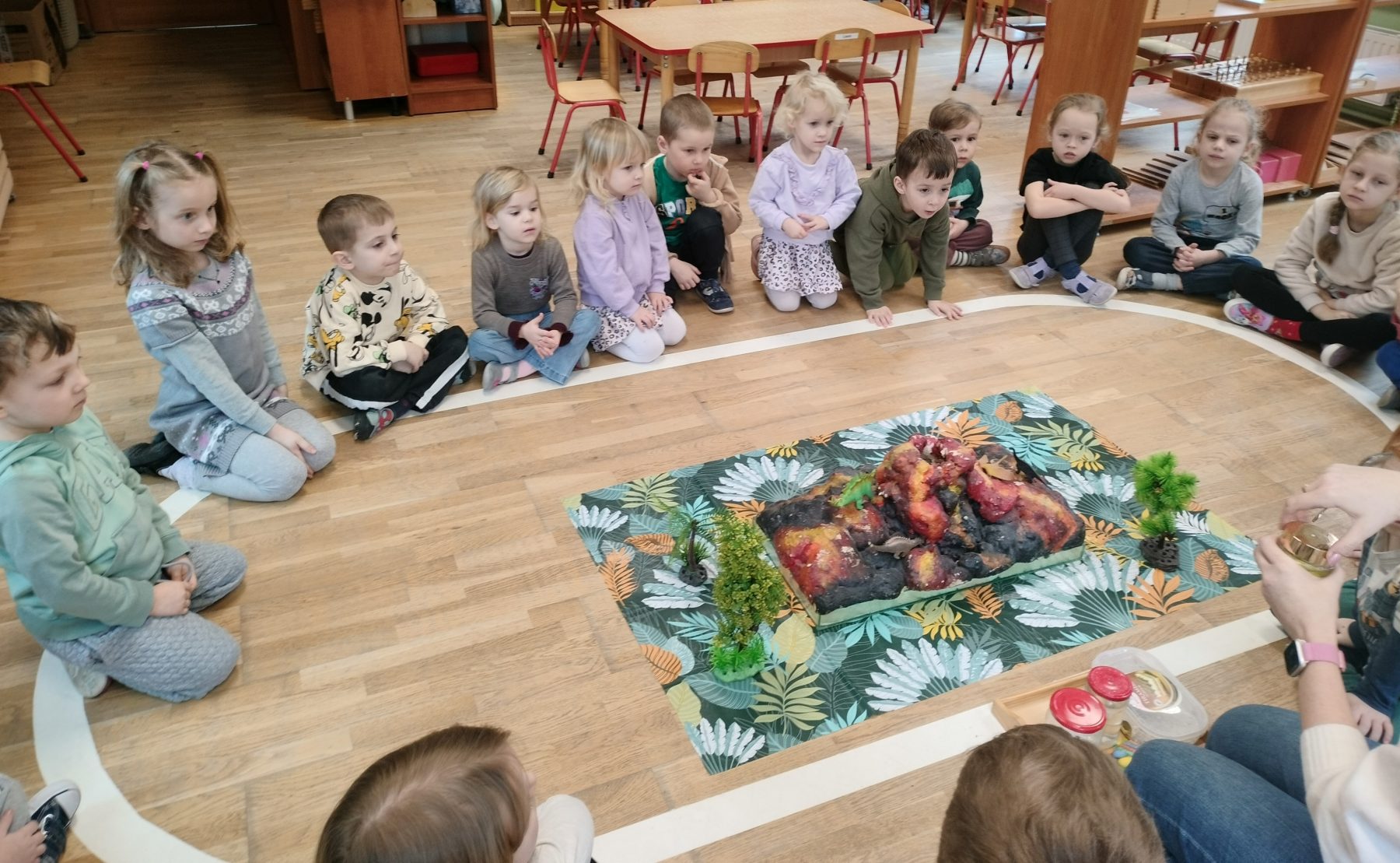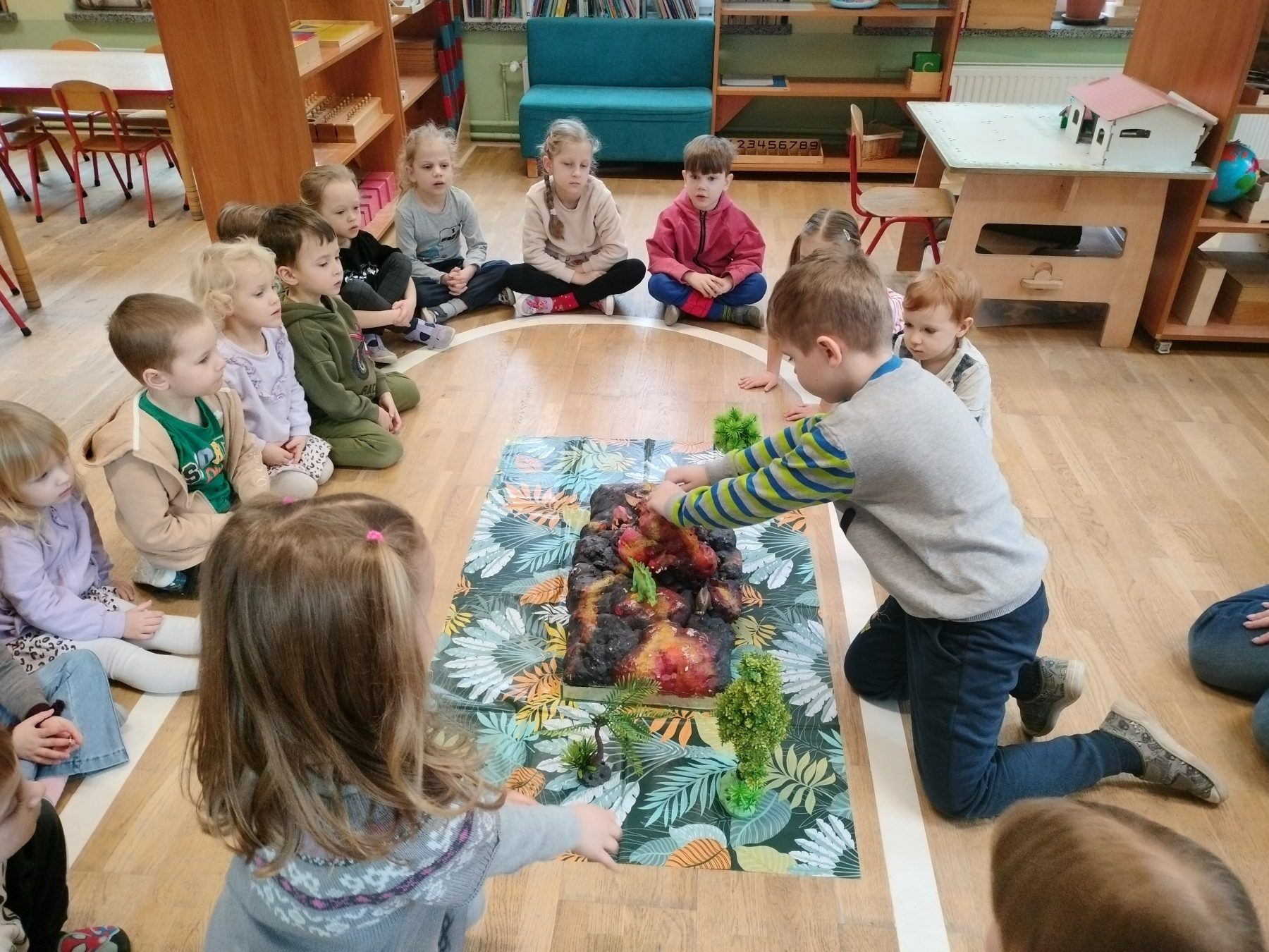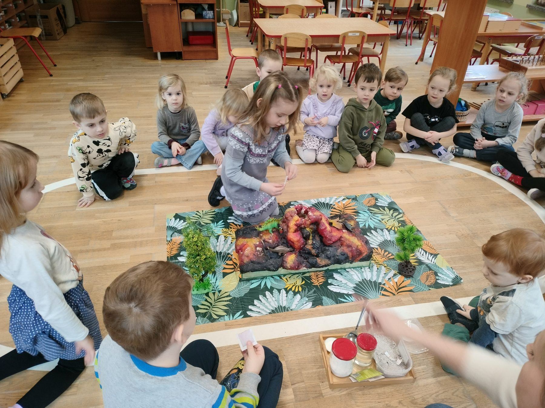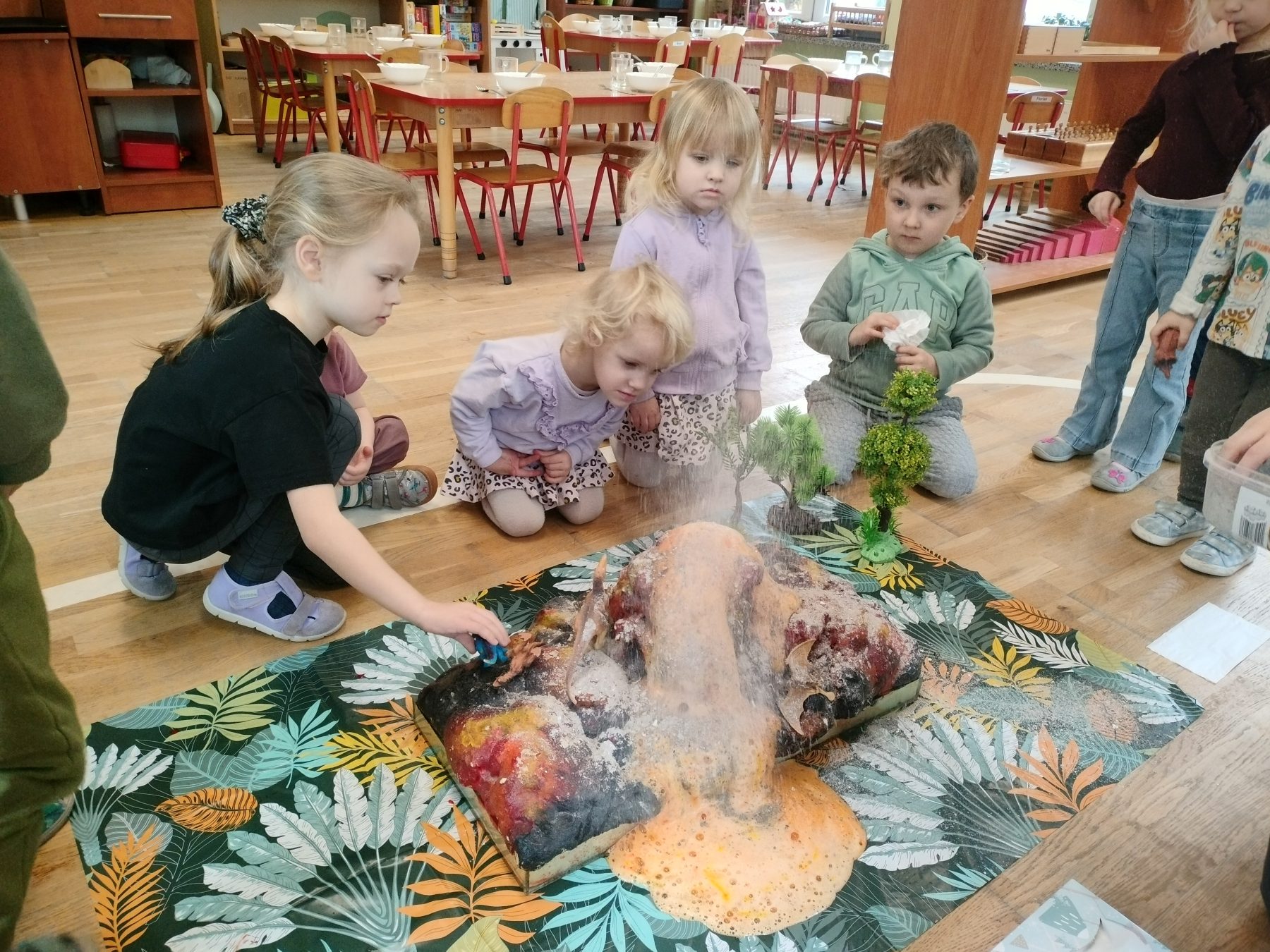 Dzieci zamieniły się w małych naukowców i samodzielnie inicjowały wybuch wulkanu, dodając potrzebne składniki.