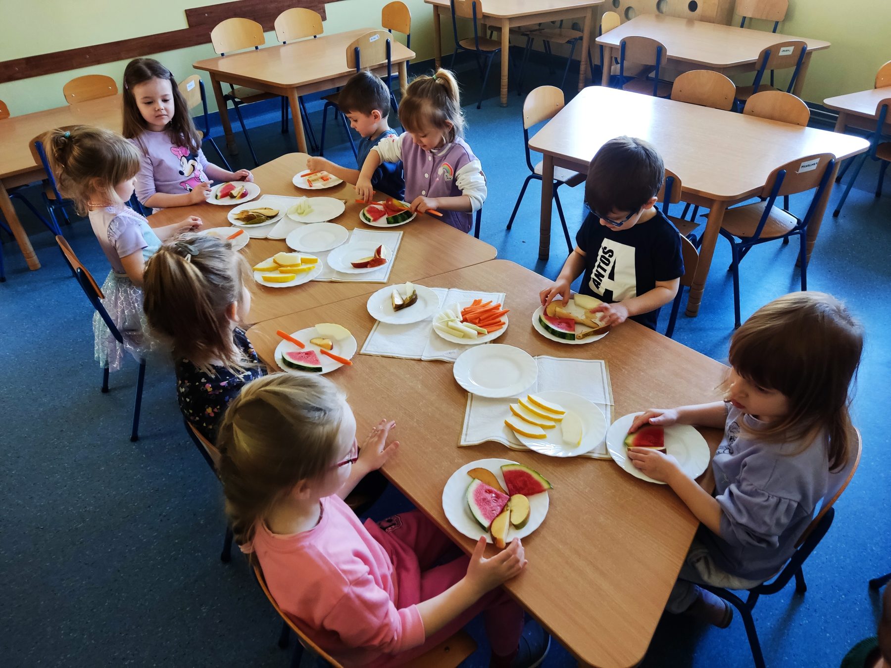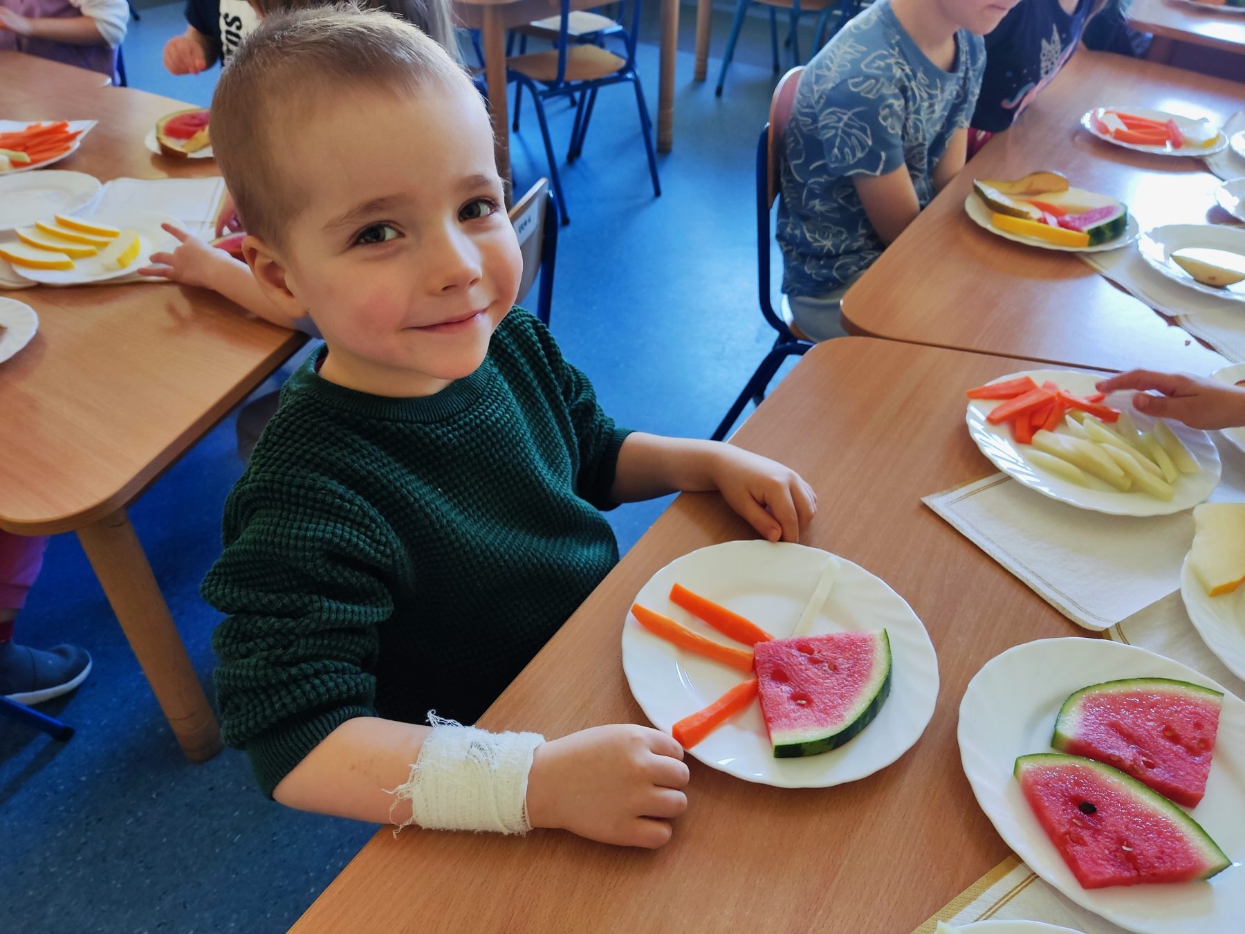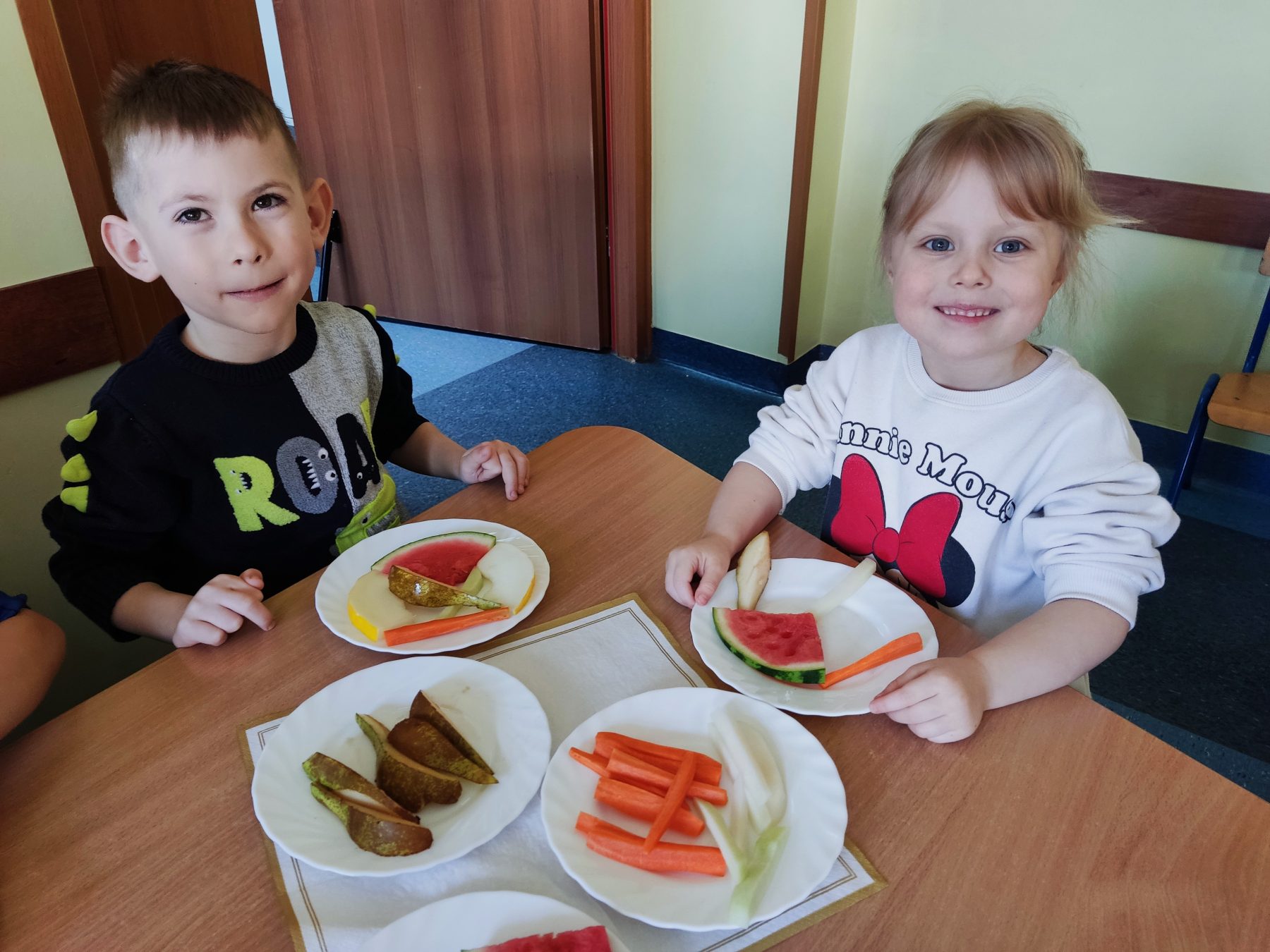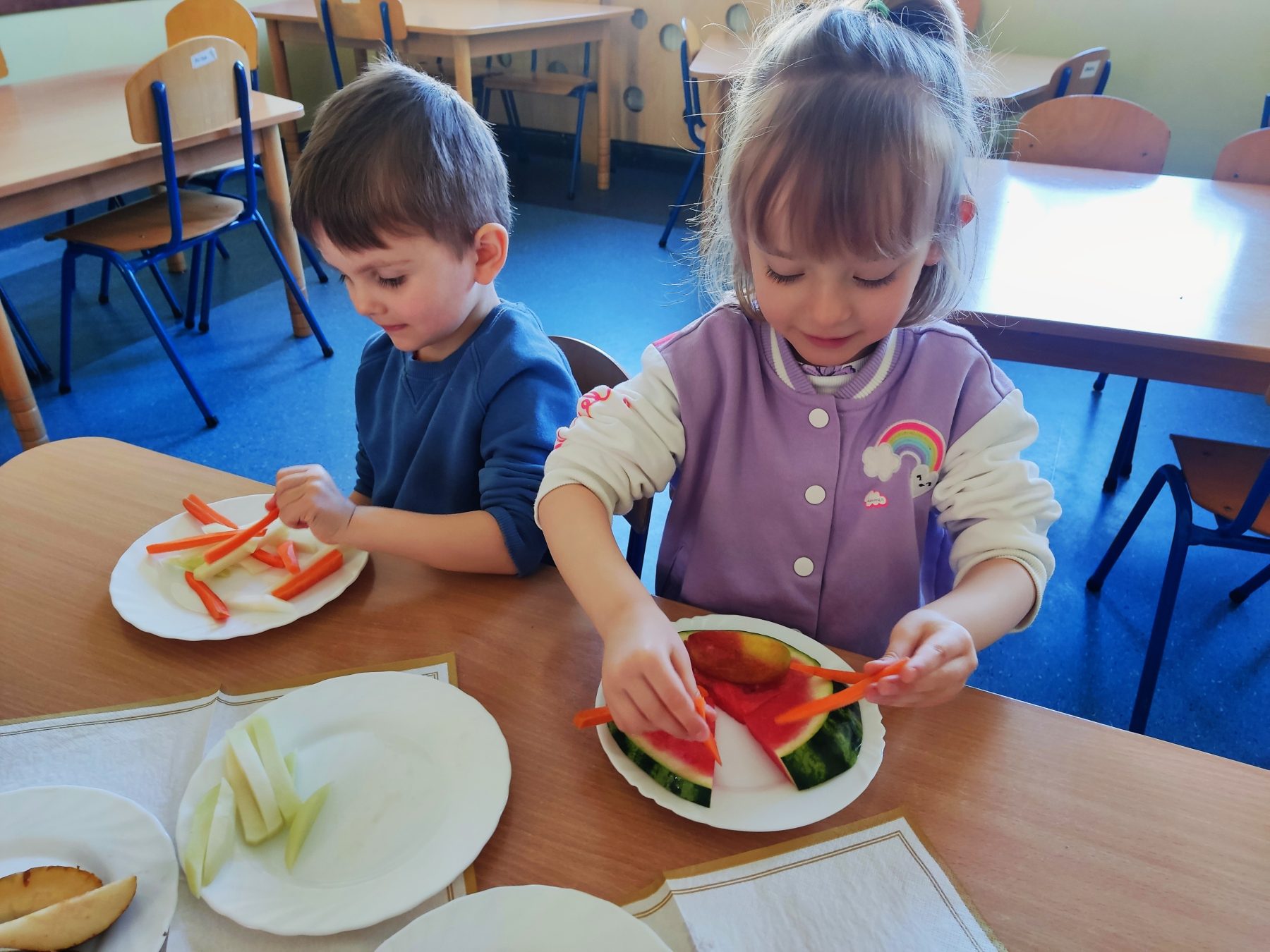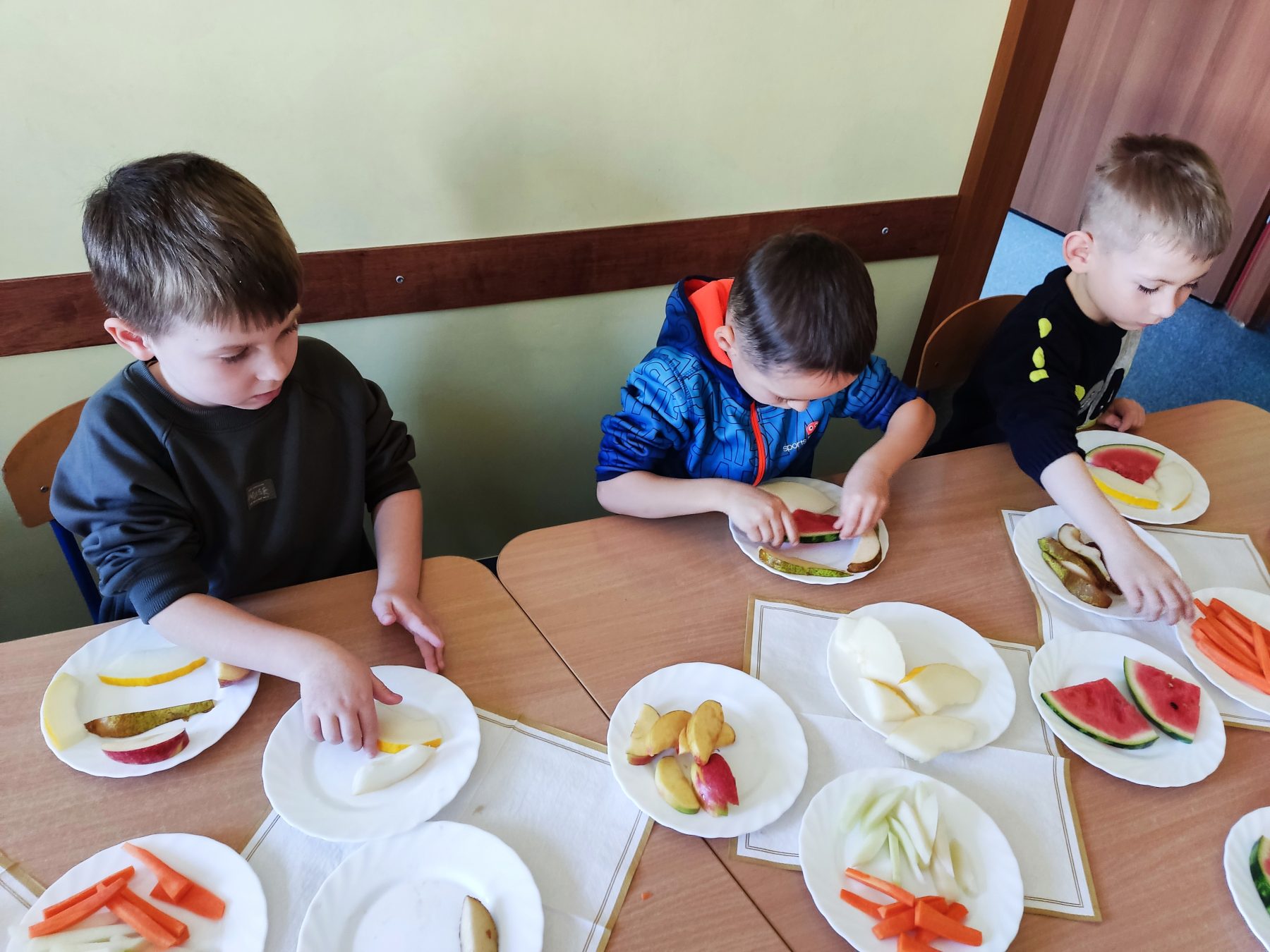 W ramach tygodniowej tematyki „Jem zdrowo” w naszej grupie odbyły się zajęcia kulinarne. Dzieci dowiedziały się, jak ważne są witaminy dla zdrowia oraz dlaczego warto je jeść. Przedszkolaki umyły i pokroiły świeże owoce oraz warzywa z których tworzyły kompozycje na talerzach. Następnie z apetytem degustowały kolorowe przysmaki. To była świetna zabawa i doskonała okazja, aby zrozumieć, jak istotne jest zdrowe odżywianie.