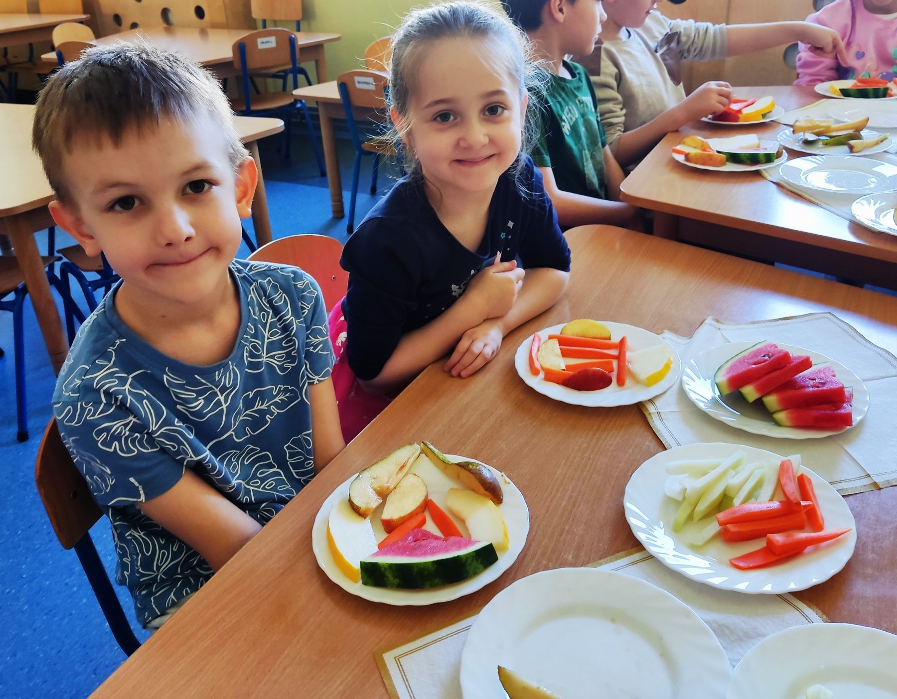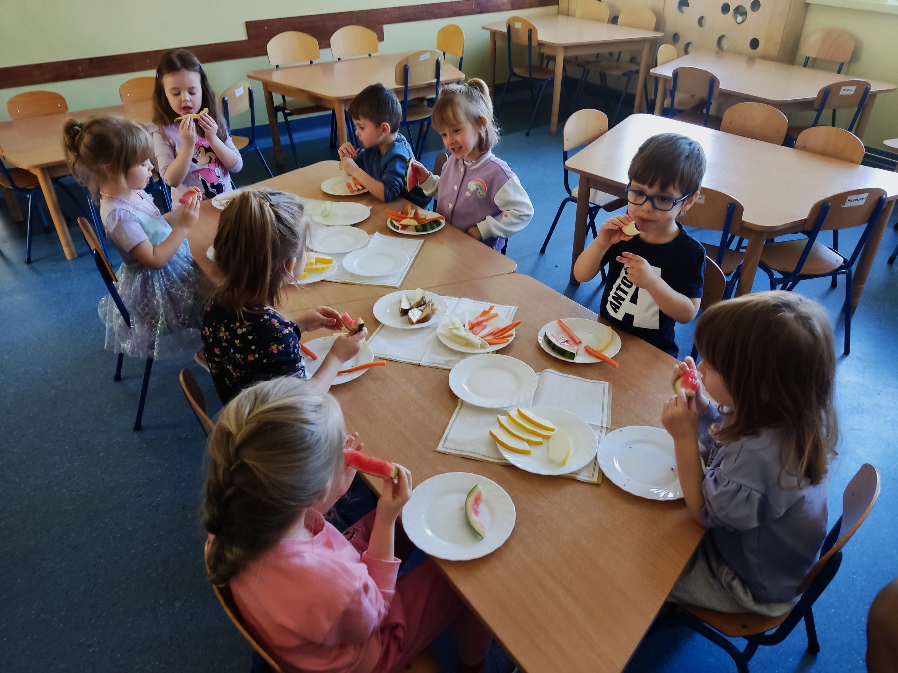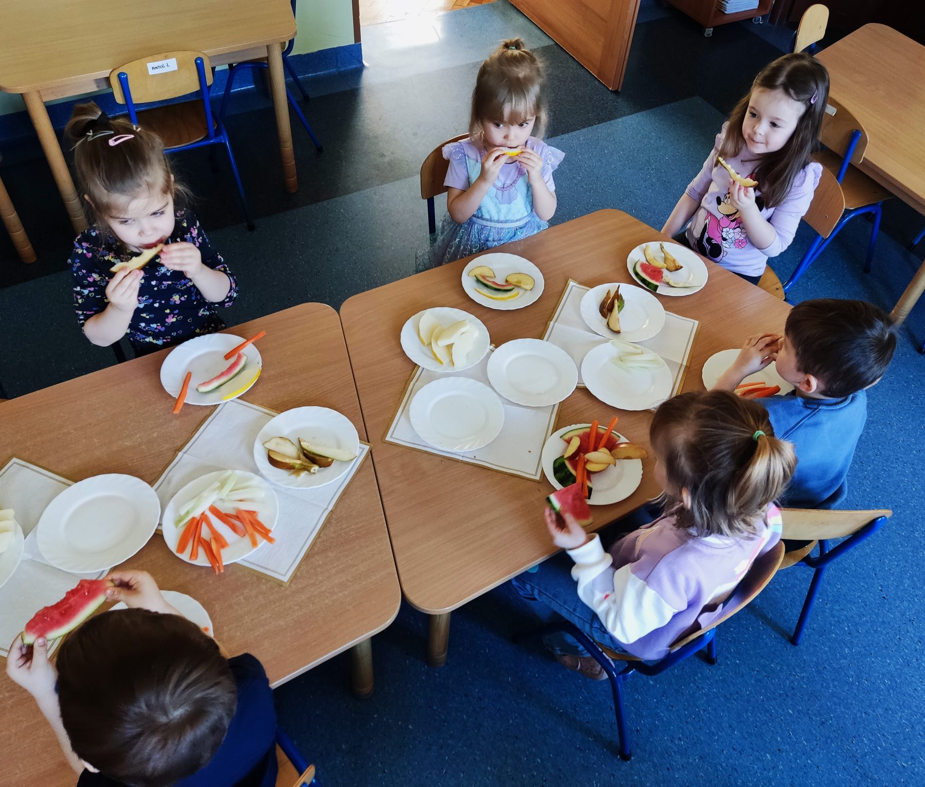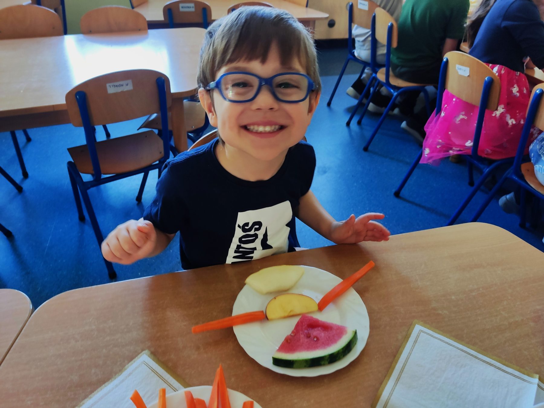 W ramach tygodniowej tematyki „Jem zdrowo” w naszej grupie odbyły się zajęcia kulinarne. Dzieci dowiedziały się, jak ważne są witaminy dla zdrowia oraz dlaczego warto je jeść. Przedszkolaki umyły i pokroiły świeże owoce oraz warzywa z których tworzyły kompozycje na talerzach. Następnie z apetytem degustowały kolorowe przysmaki. To była świetna zabawa i doskonała okazja, aby zrozumieć, jak istotne jest zdrowe odżywianie.