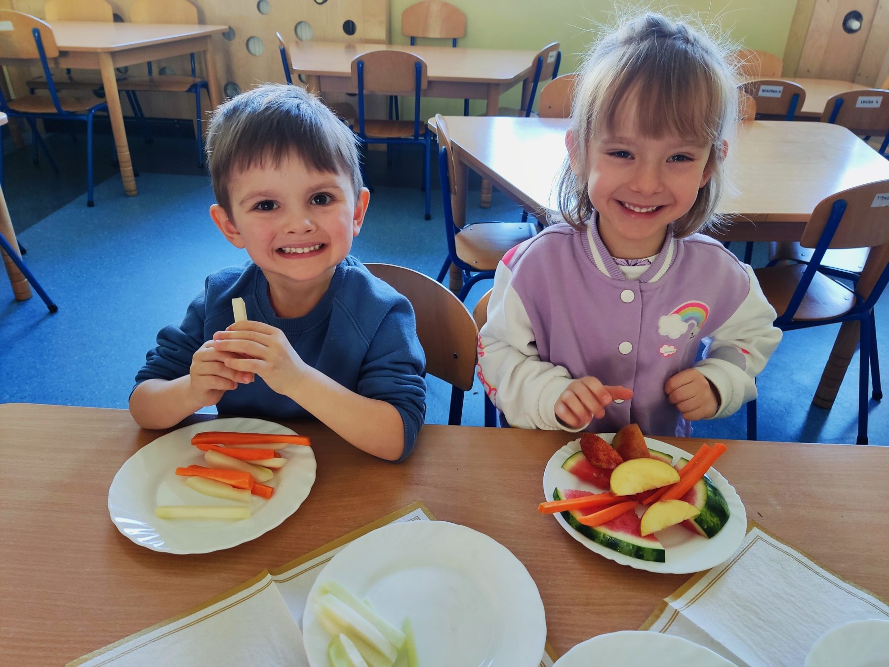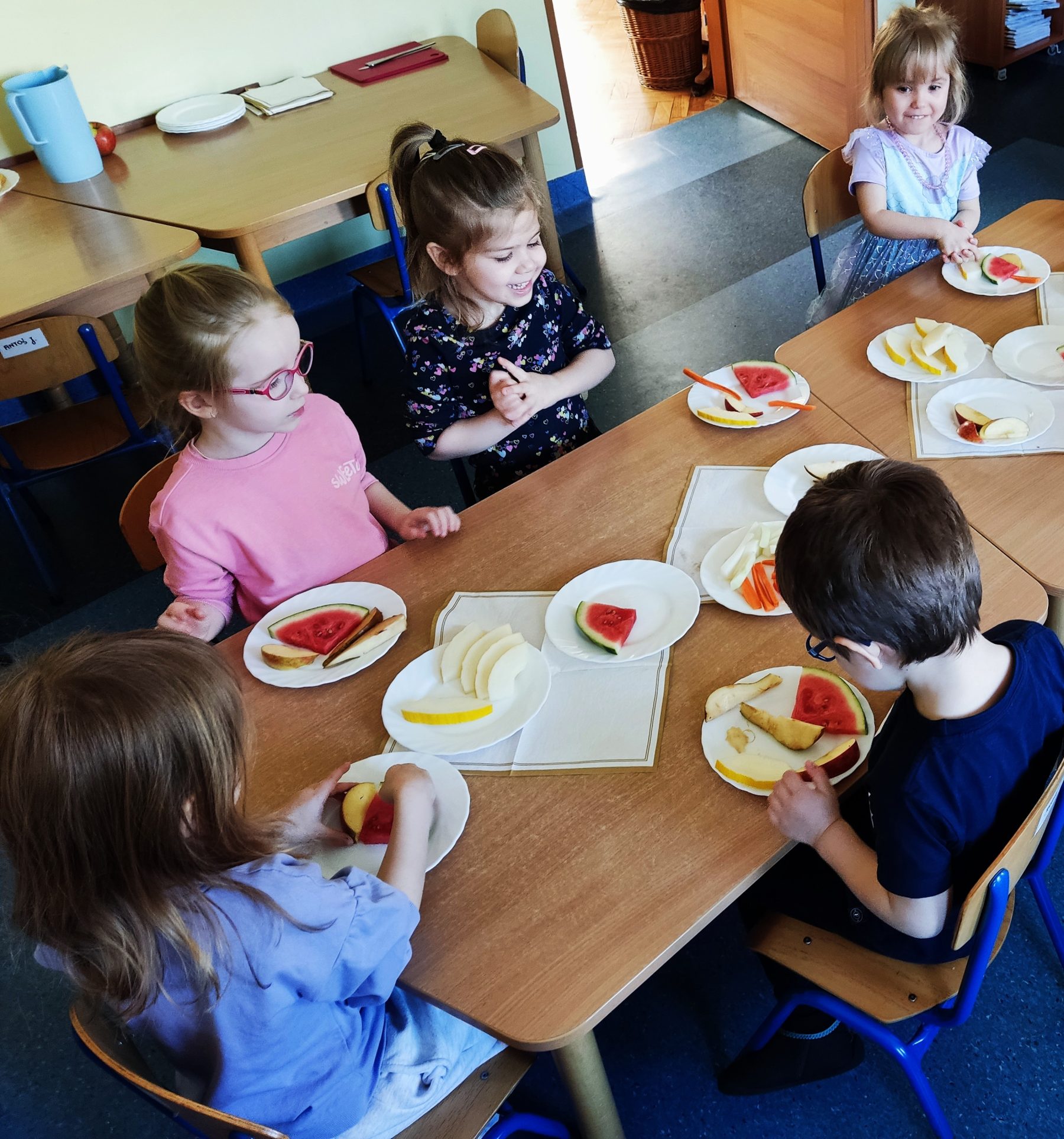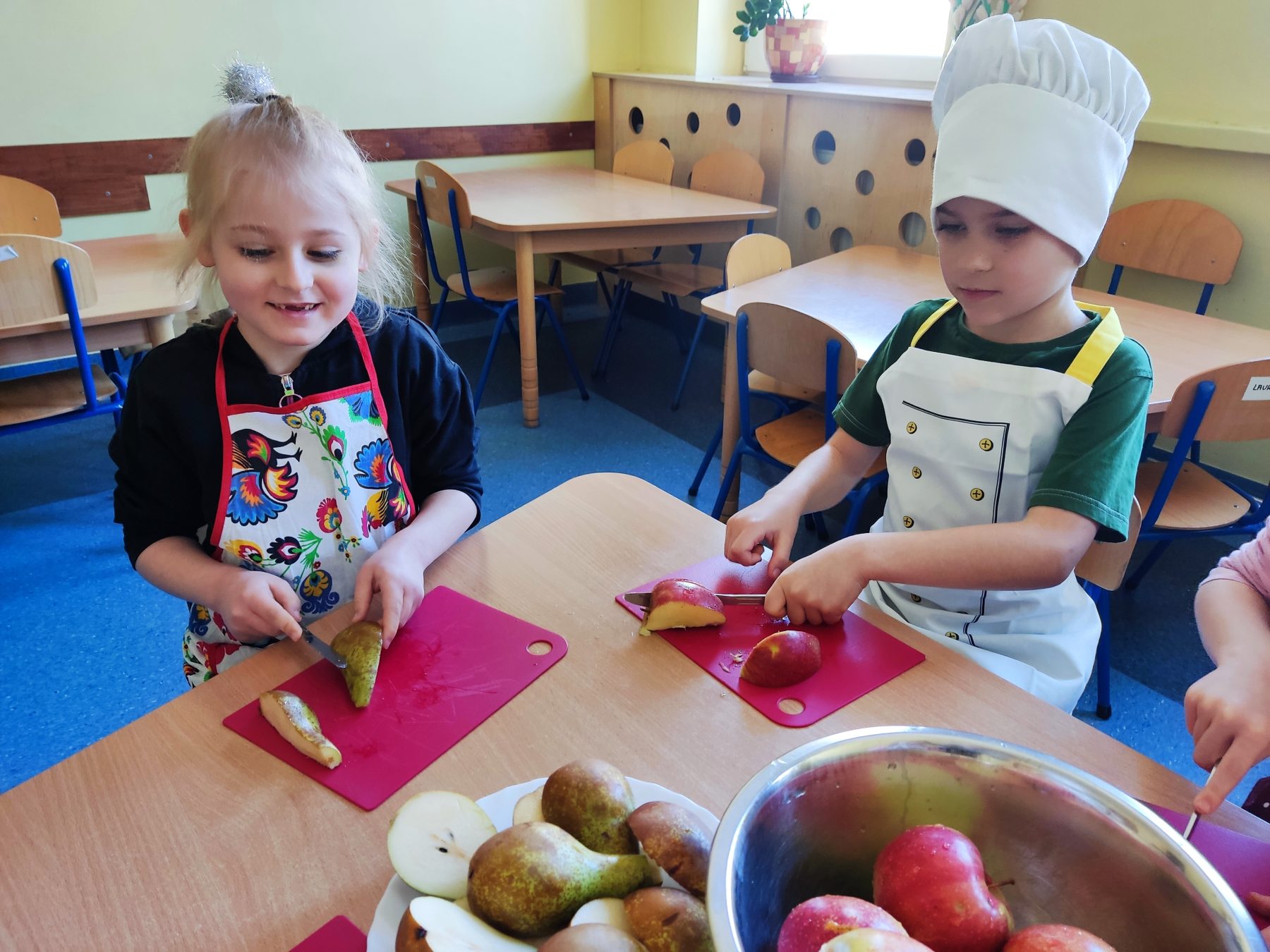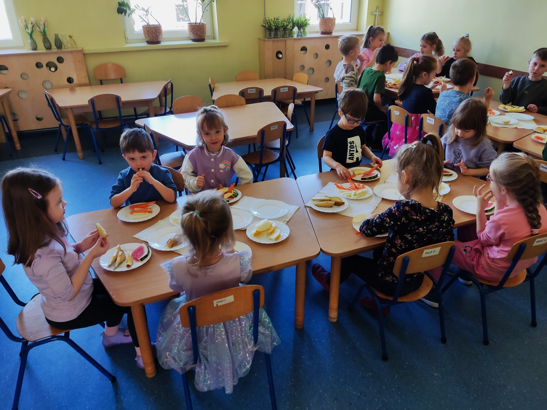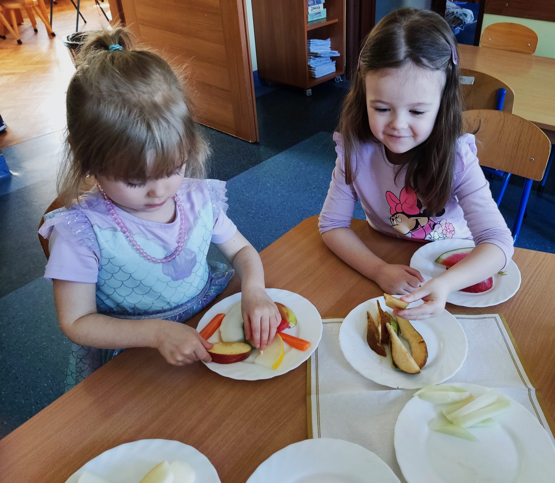 W ramach tygodniowej tematyki „Jem zdrowo” w naszej grupie odbyły się zajęcia kulinarne. Dzieci dowiedziały się, jak ważne są witaminy dla zdrowia oraz dlaczego warto je jeść. Przedszkolaki umyły i pokroiły świeże owoce oraz warzywa z których tworzyły kompozycje na talerzach. Następnie z apetytem degustowały kolorowe przysmaki. To była świetna zabawa i doskonała okazja, aby zrozumieć, jak istotne jest zdrowe odżywianie.