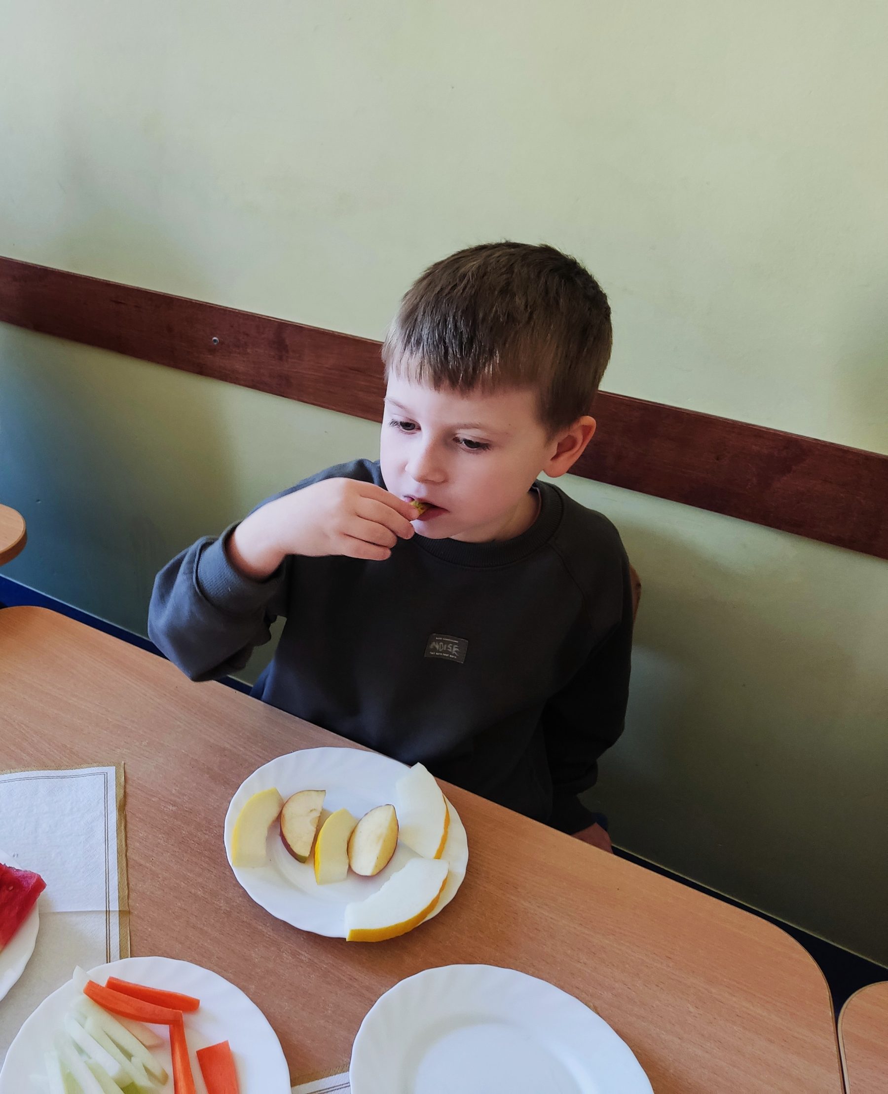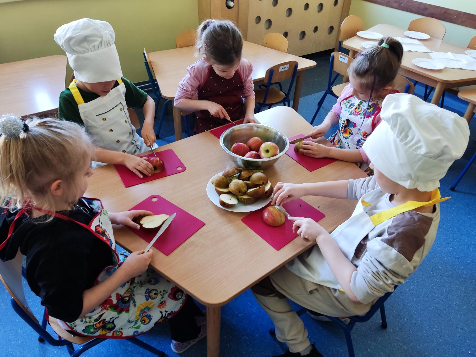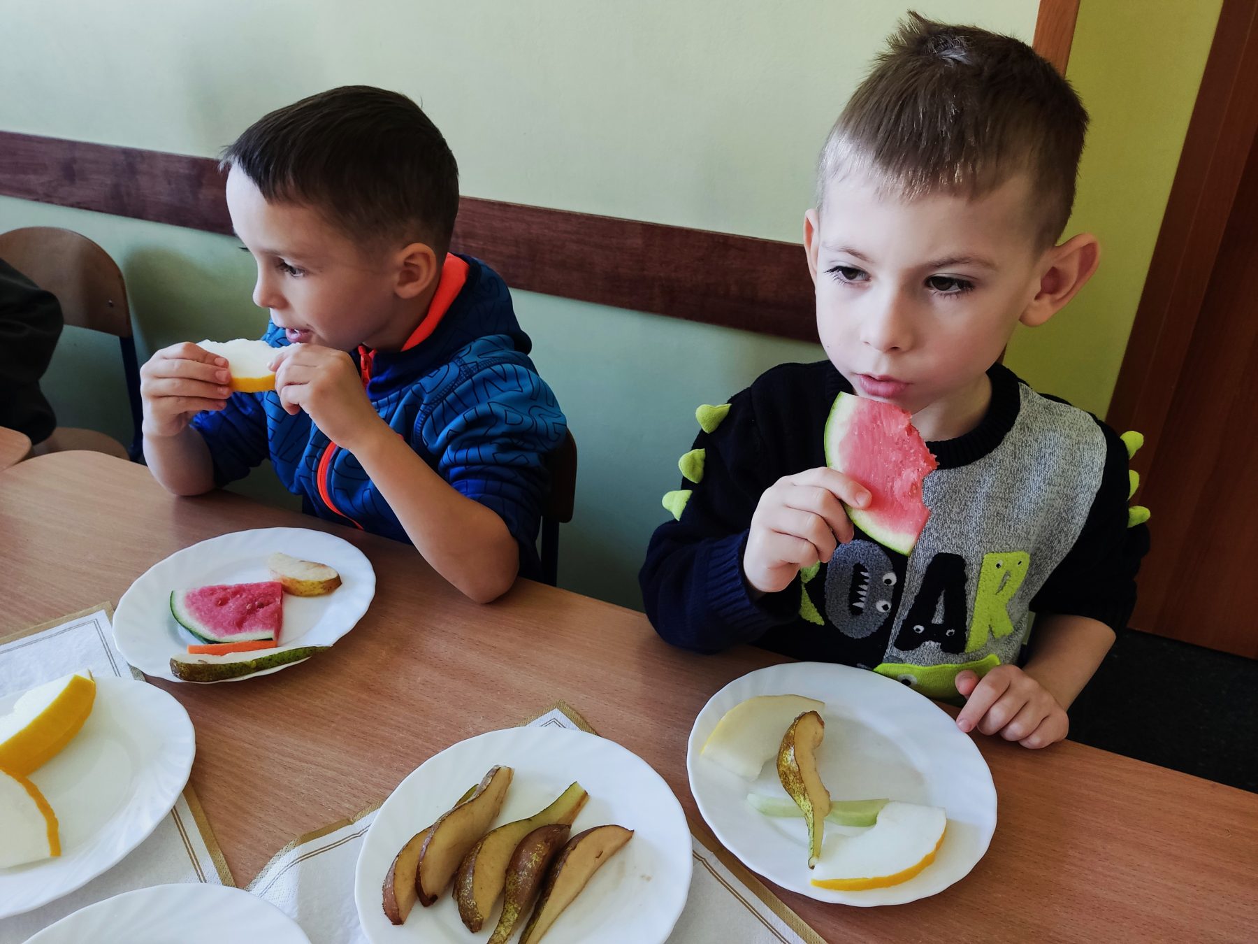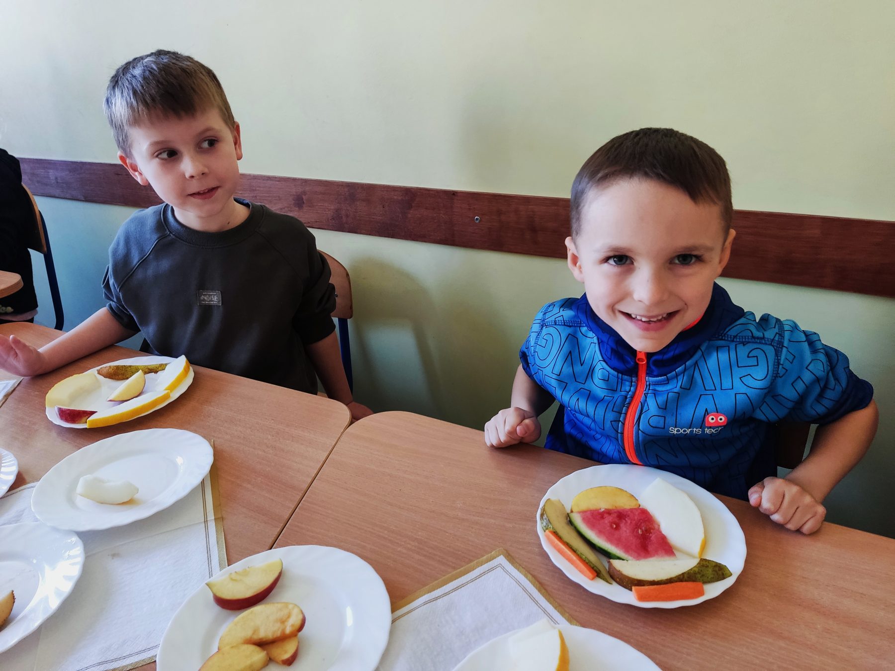 W ramach tygodniowej tematyki „Jem zdrowo” w naszej grupie odbyły się zajęcia kulinarne. Dzieci dowiedziały się, jak ważne są witaminy dla zdrowia oraz dlaczego warto je jeść. Przedszkolaki umyły i pokroiły świeże owoce oraz warzywa z których tworzyły kompozycje na talerzach. Następnie z apetytem degustowały kolorowe przysmaki. To była świetna zabawa i doskonała okazja, aby zrozumieć, jak istotne jest zdrowe odżywianie.