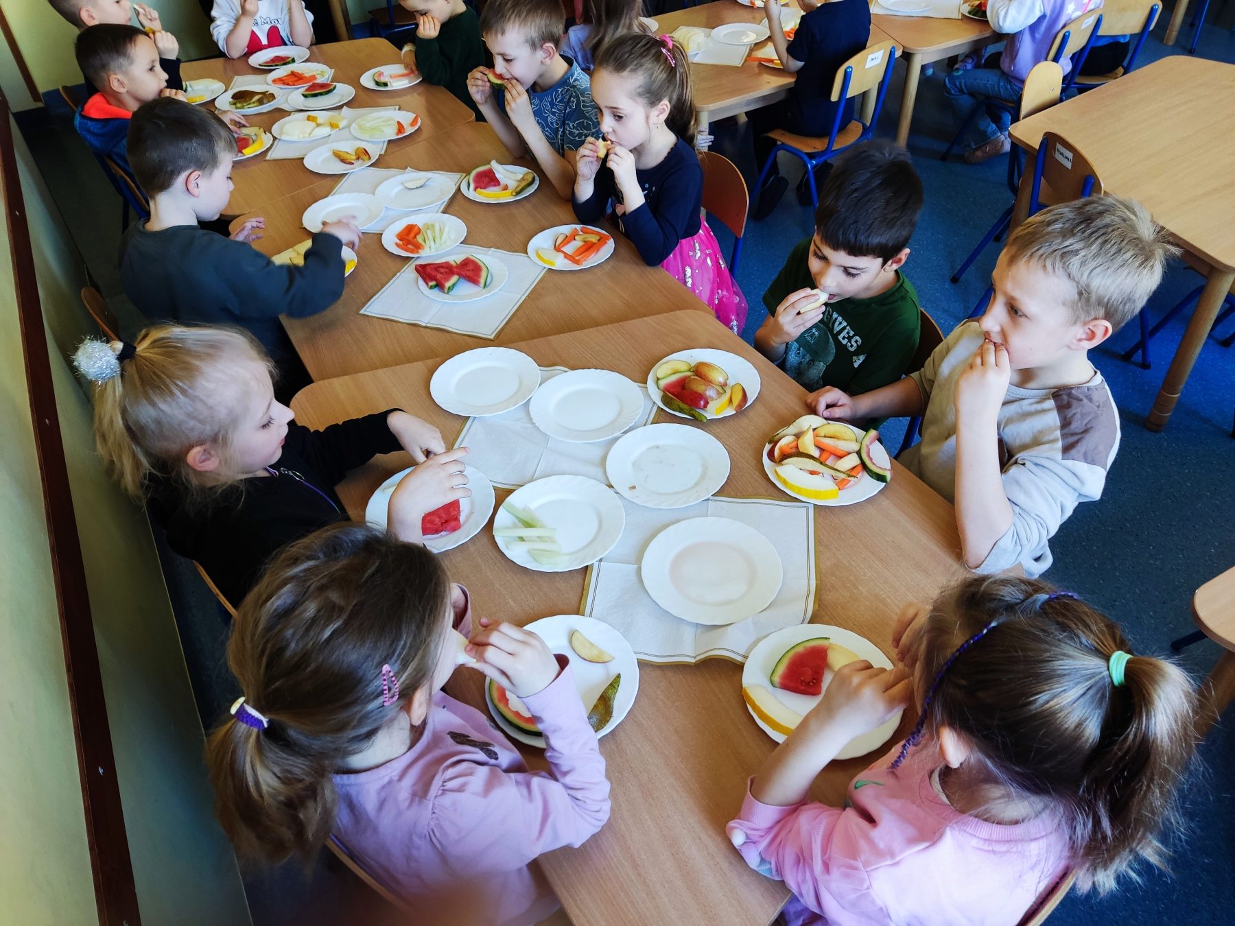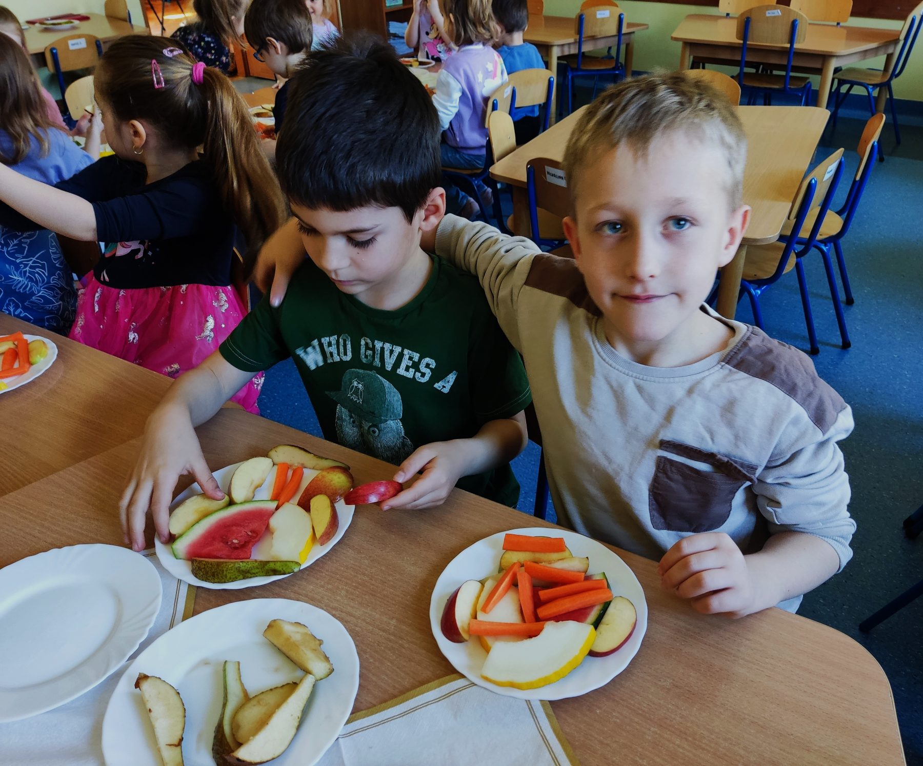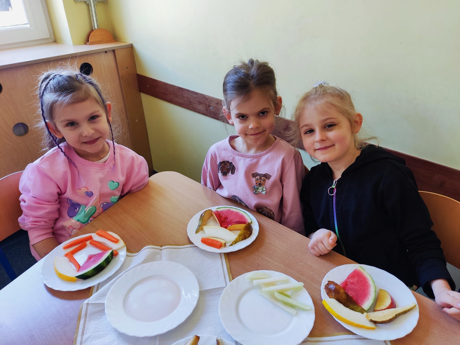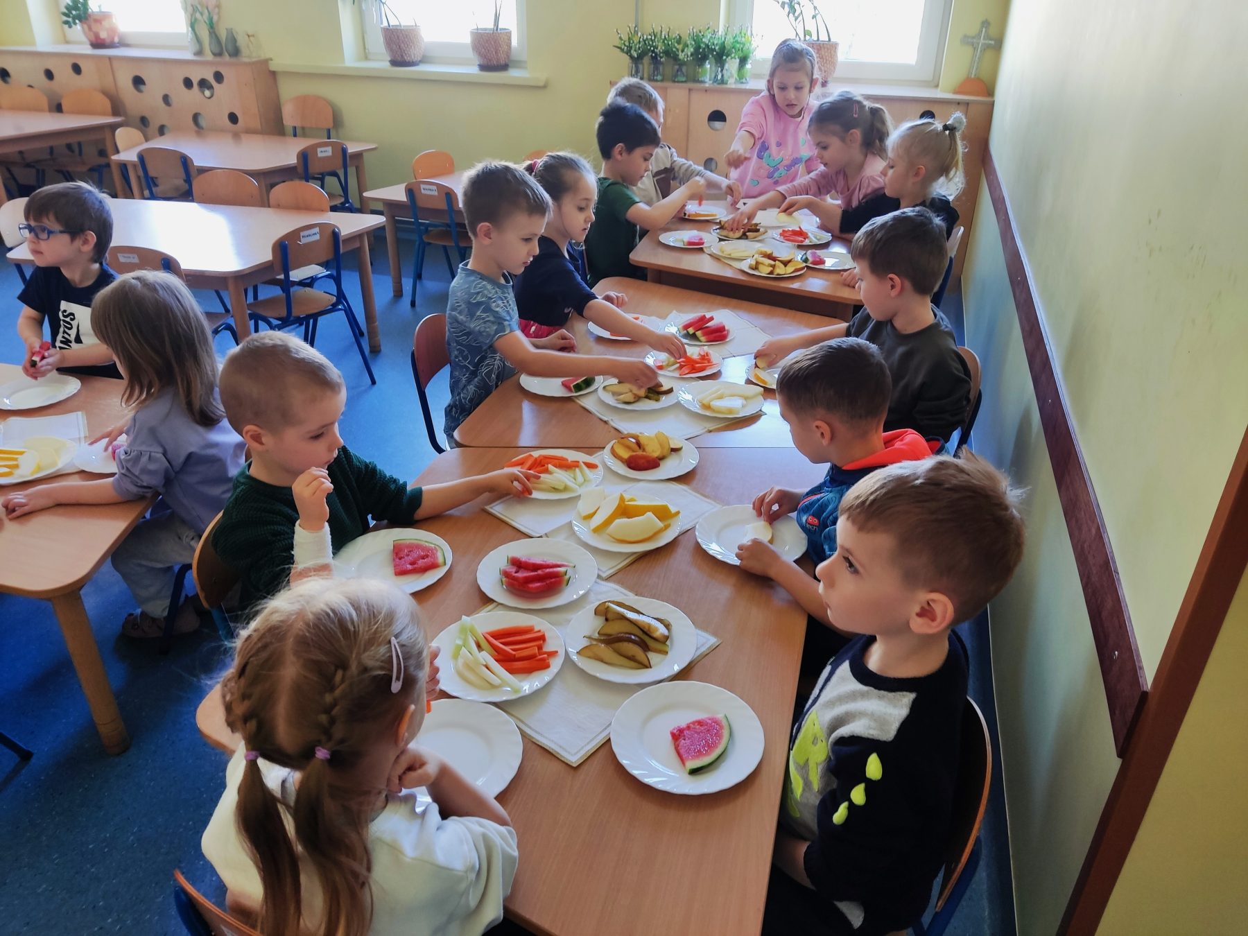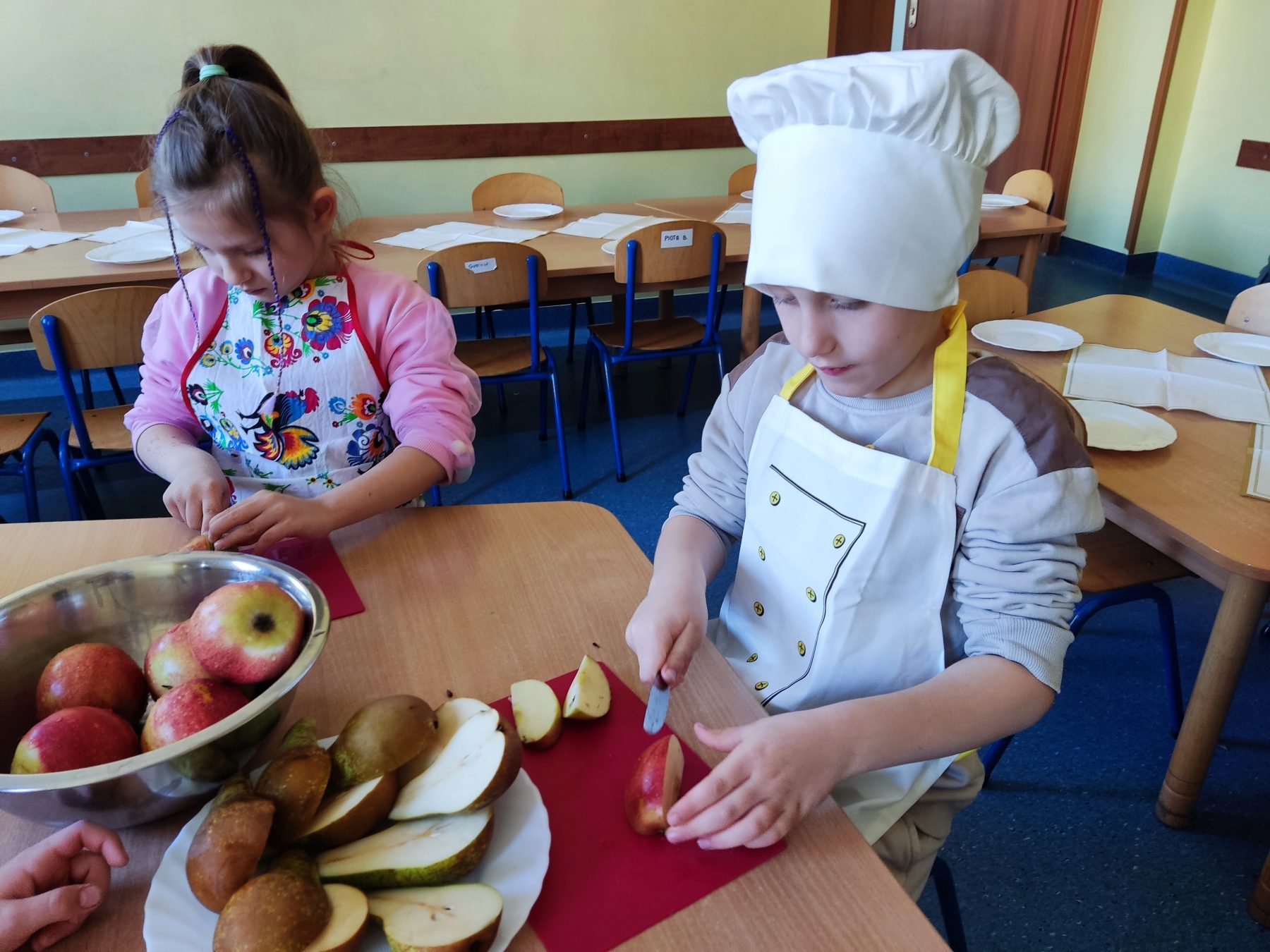 W ramach tygodniowej tematyki „Jem zdrowo” w naszej grupie odbyły się zajęcia kulinarne. Dzieci dowiedziały się, jak ważne są witaminy dla zdrowia oraz dlaczego warto je jeść. Przedszkolaki umyły i pokroiły świeże owoce oraz warzywa z których tworzyły kompozycje na talerzach. Następnie z apetytem degustowały kolorowe przysmaki. To była świetna zabawa i doskonała okazja, aby zrozumieć, jak istotne jest zdrowe odżywianie.