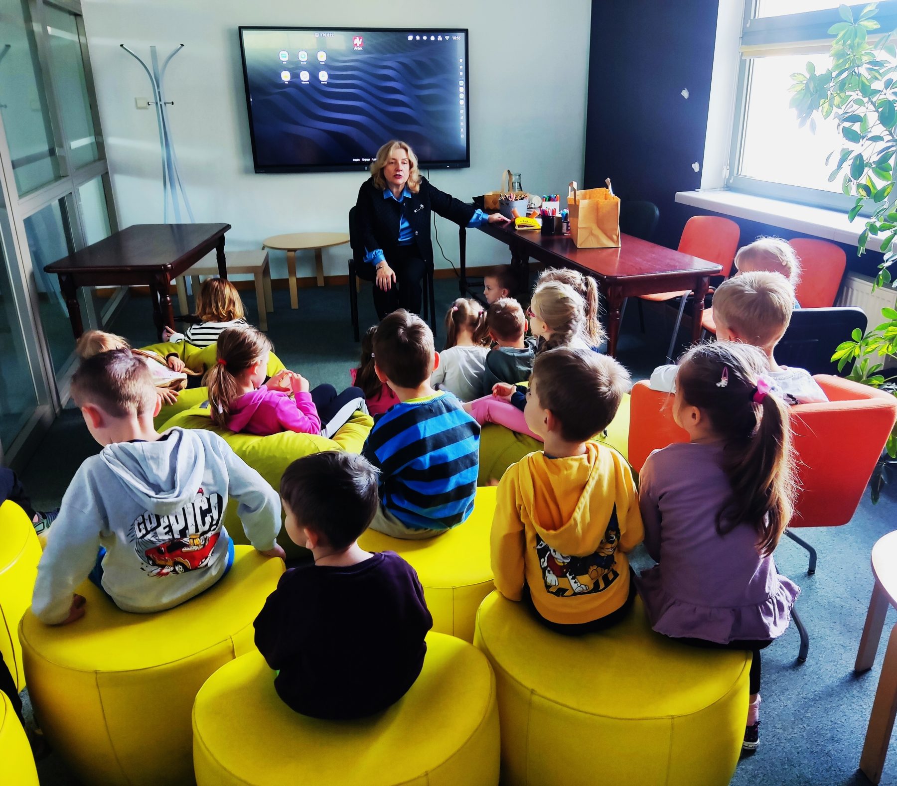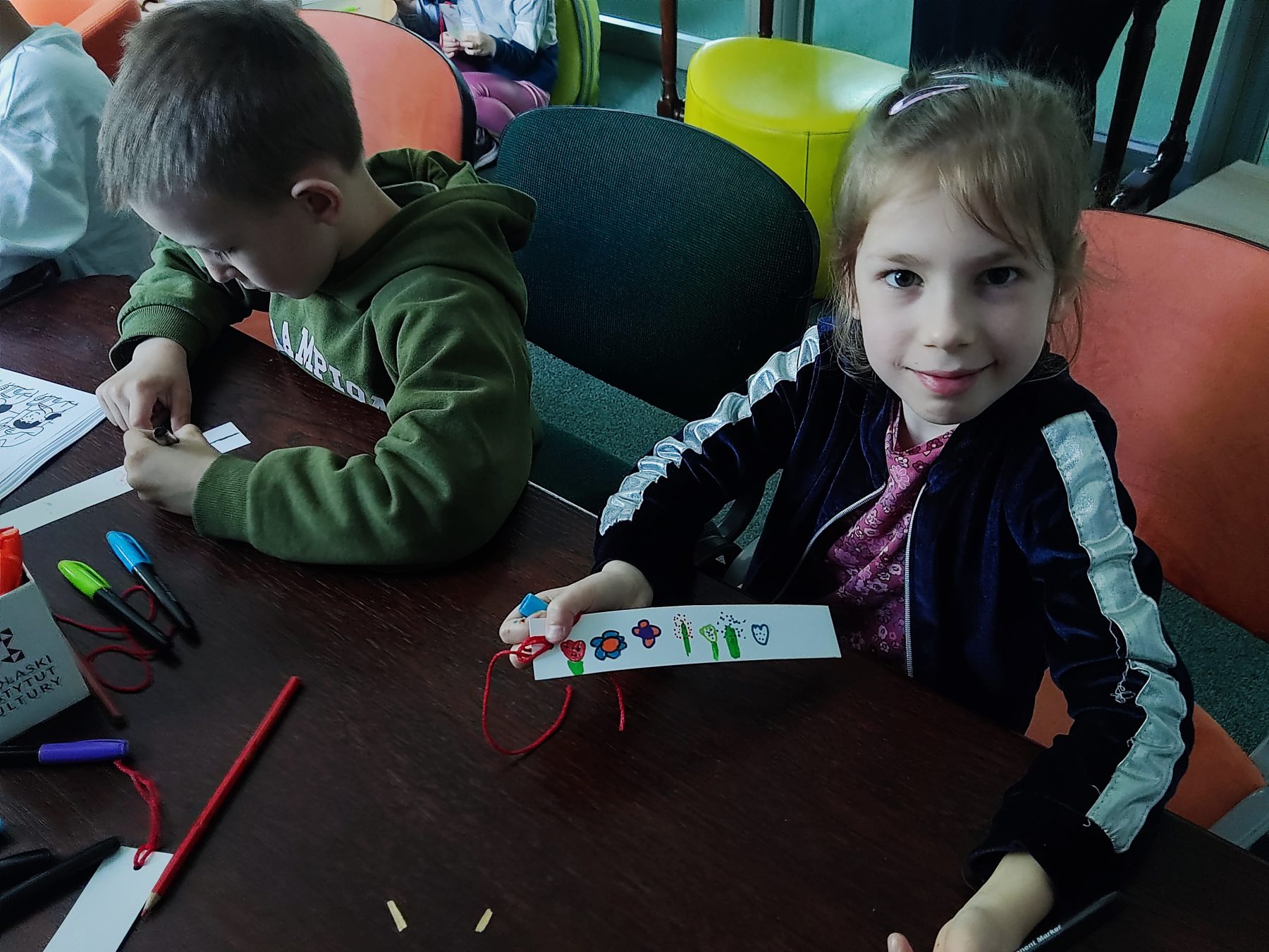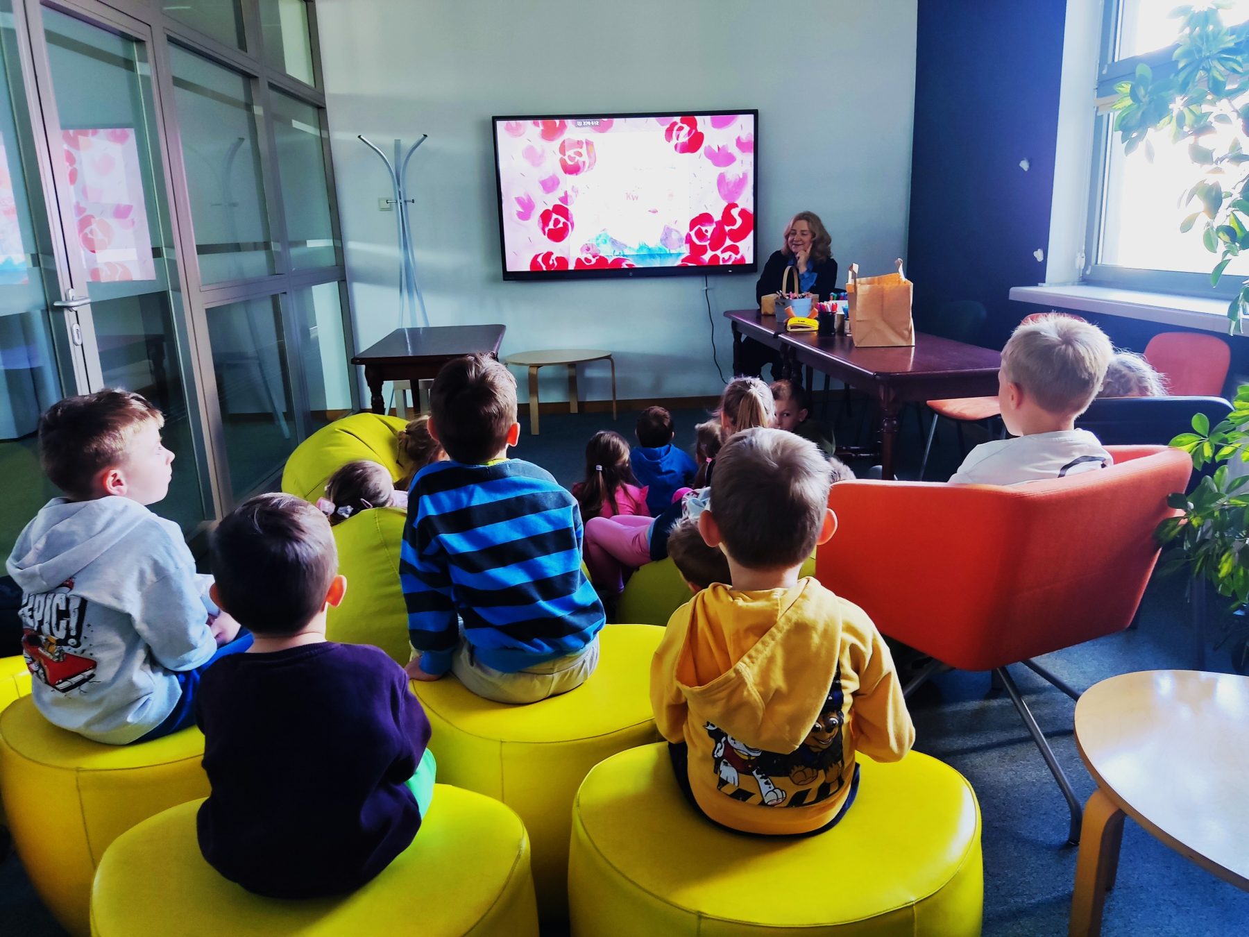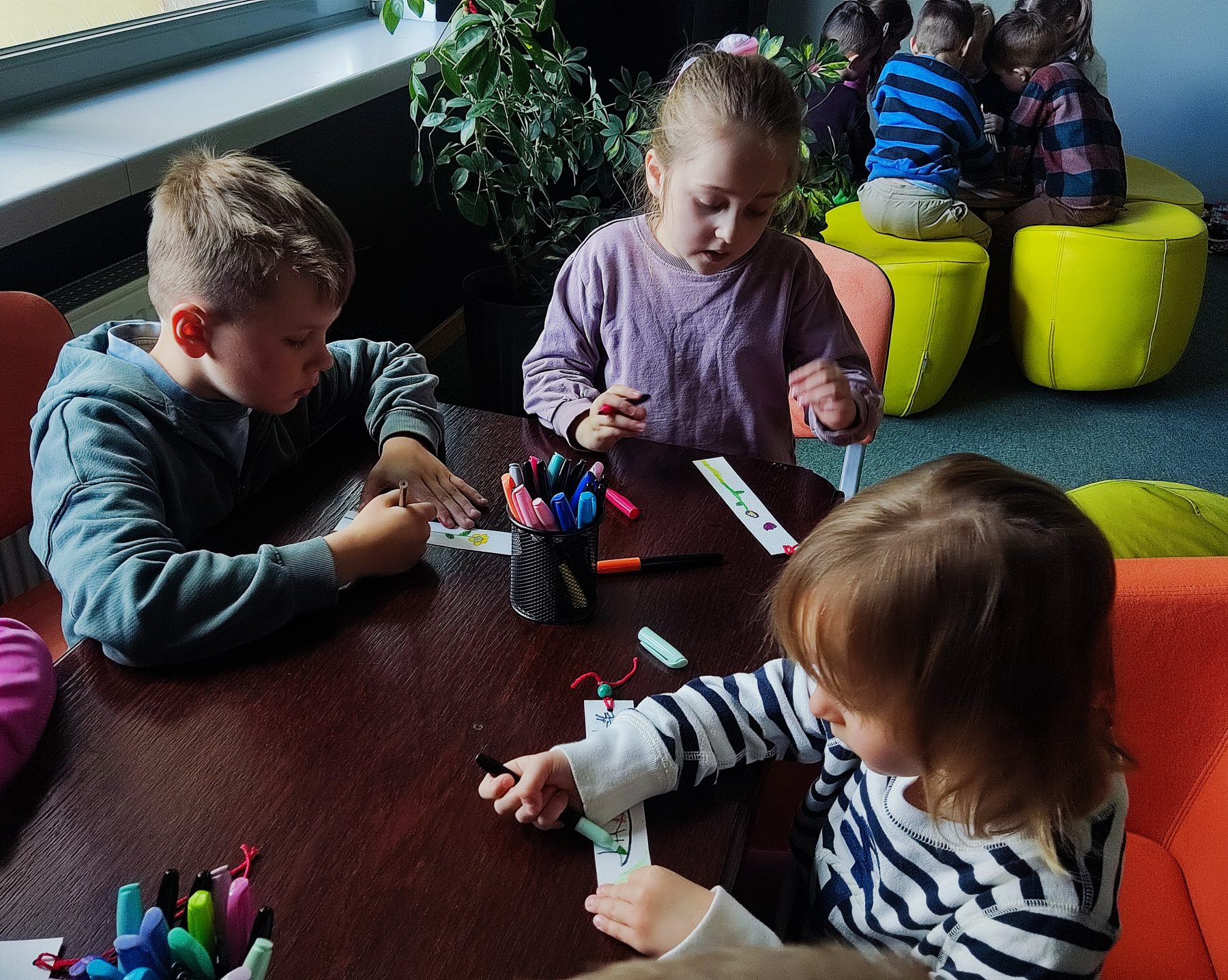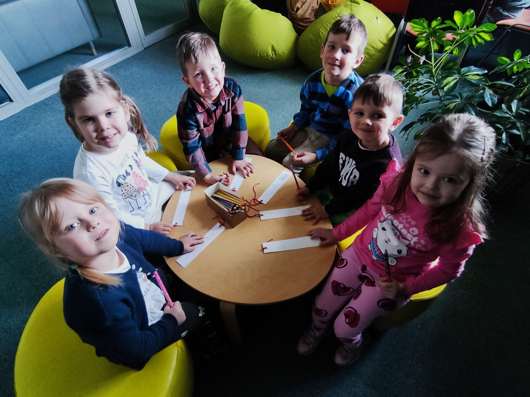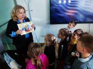 Dzieci z grupy II odbyły wycieczkę do Książnicy Podlaskiej, gdzie uczestniczyły w zajęciach czytelniczych. Na początku spotkania przedszkolaki wysłuchały słuchowiska pt. „Rozalka i kwiaty”, które wzbudziło ich duże zainteresowanie oraz wywołało wiele emocji. Po zakończeniu opowieści dzieci chętnie rozmawiały o jej treści, dzieliły się swoimi przemyśleniami oraz odpowiadały na pytania dotyczące historii Rozalki. Następnie przedszkolaki wykonały zakładki do książek, wykazując się dużą kreatywnością i zaangażowaniem. Serdecznie dziękujemy Pani prowadzącej za miłe spotkanie oraz ciekawe zajęcia czytelnicze.