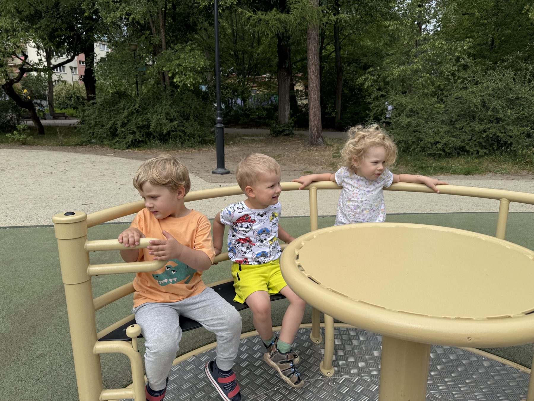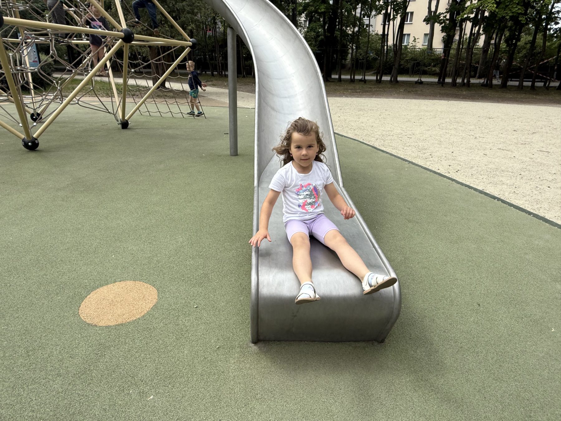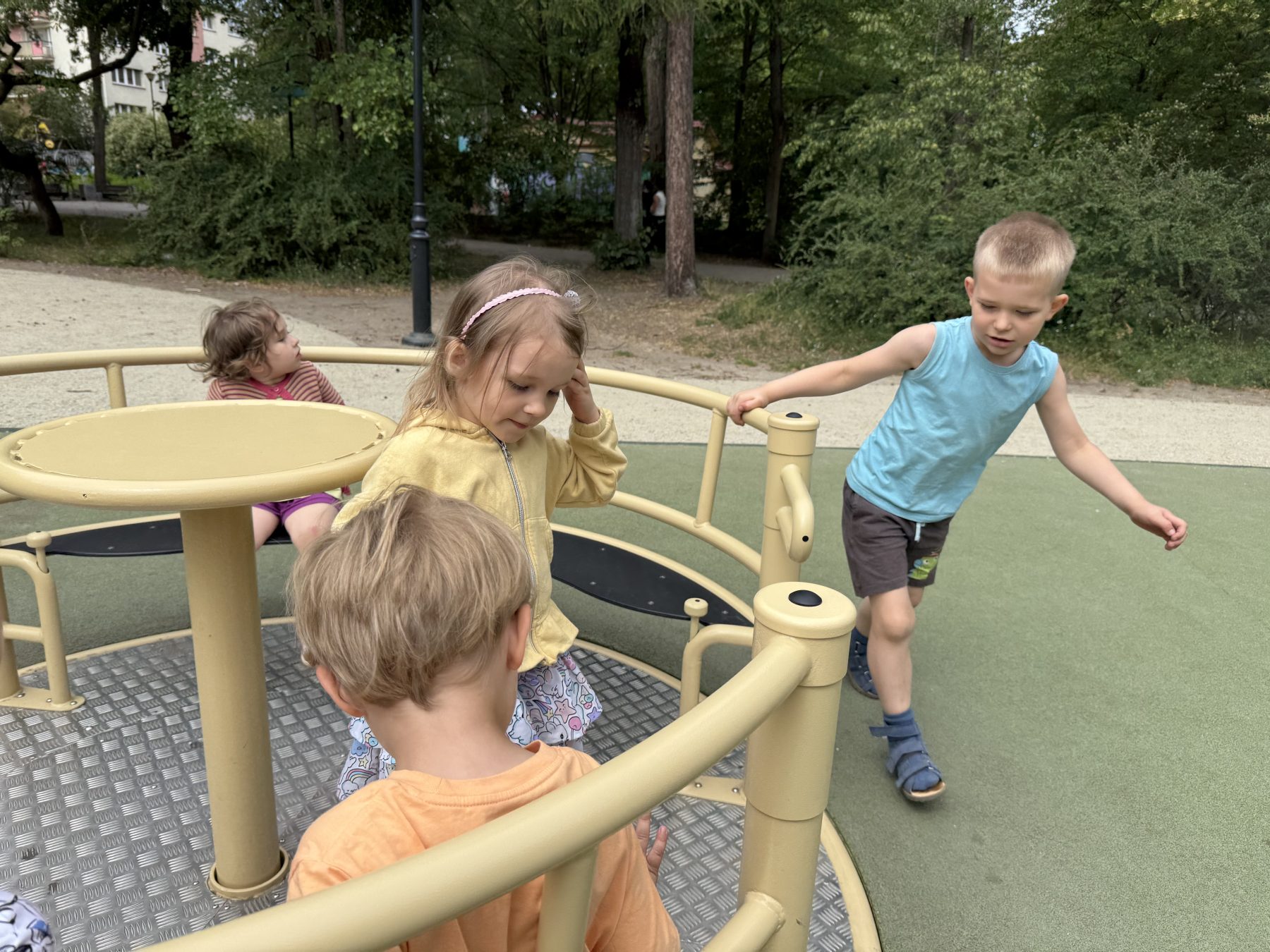 Maluchy z ogromnym entuzjazmem korzystały z atrakcji – zjeżdżalni, huśtawek i kolorowych konstrukcji do wspinaczki. Radości nie było końca! Spacer był także świetną okazją do obserwowania przyrody i rozmów o zasadach bezpiecznego zachowania się w przestrzeni publicznej.