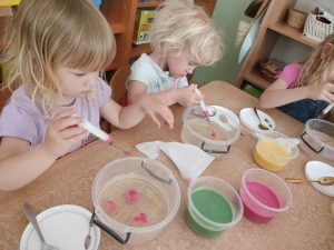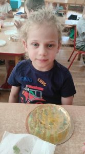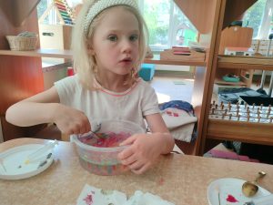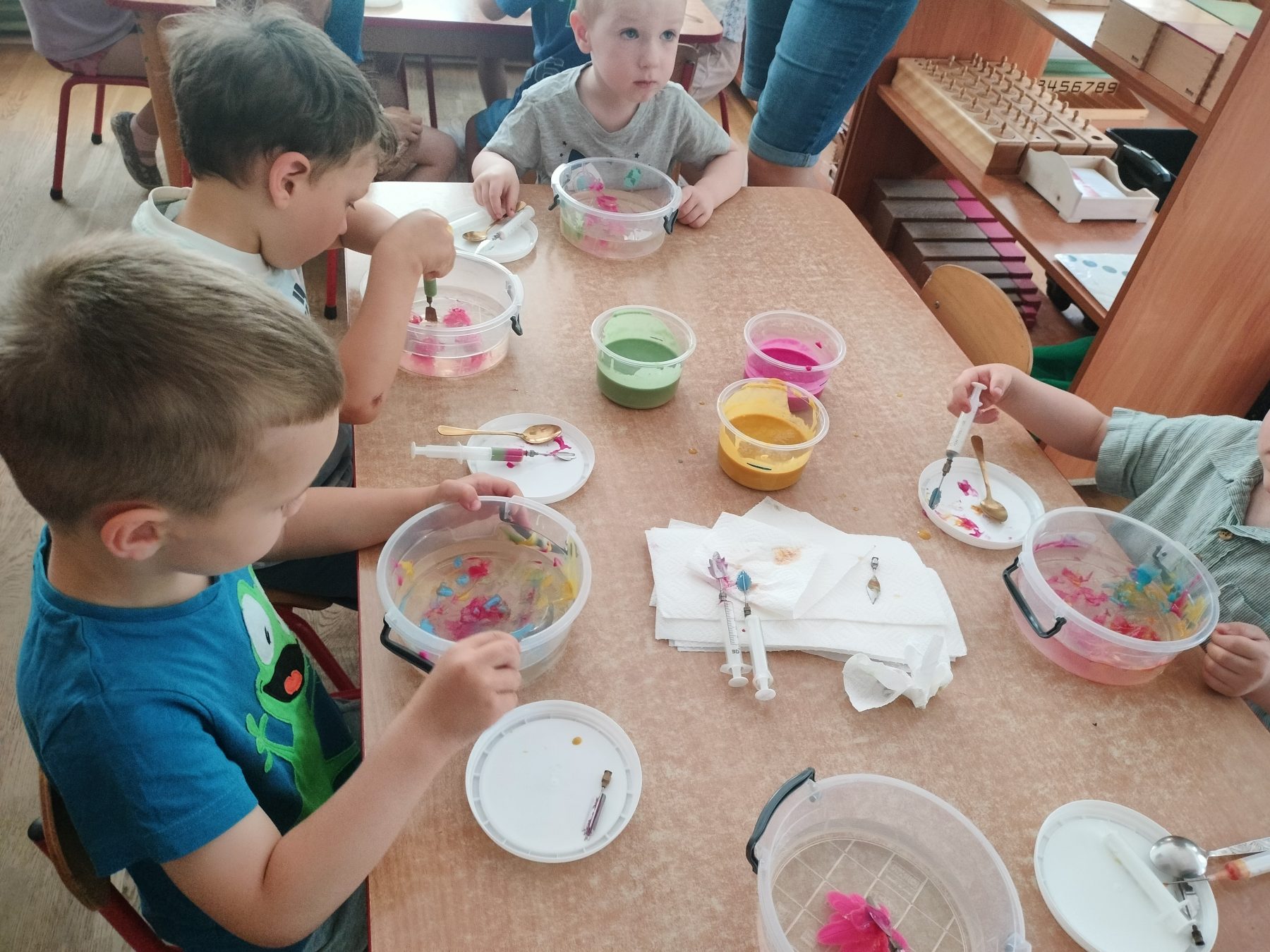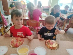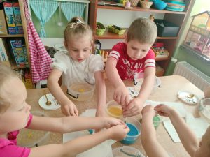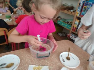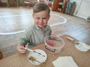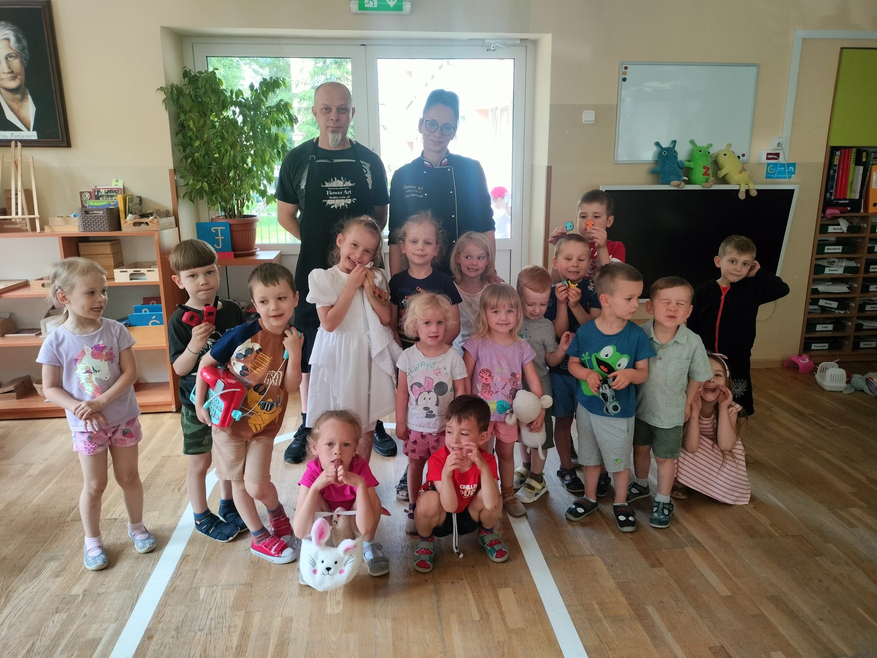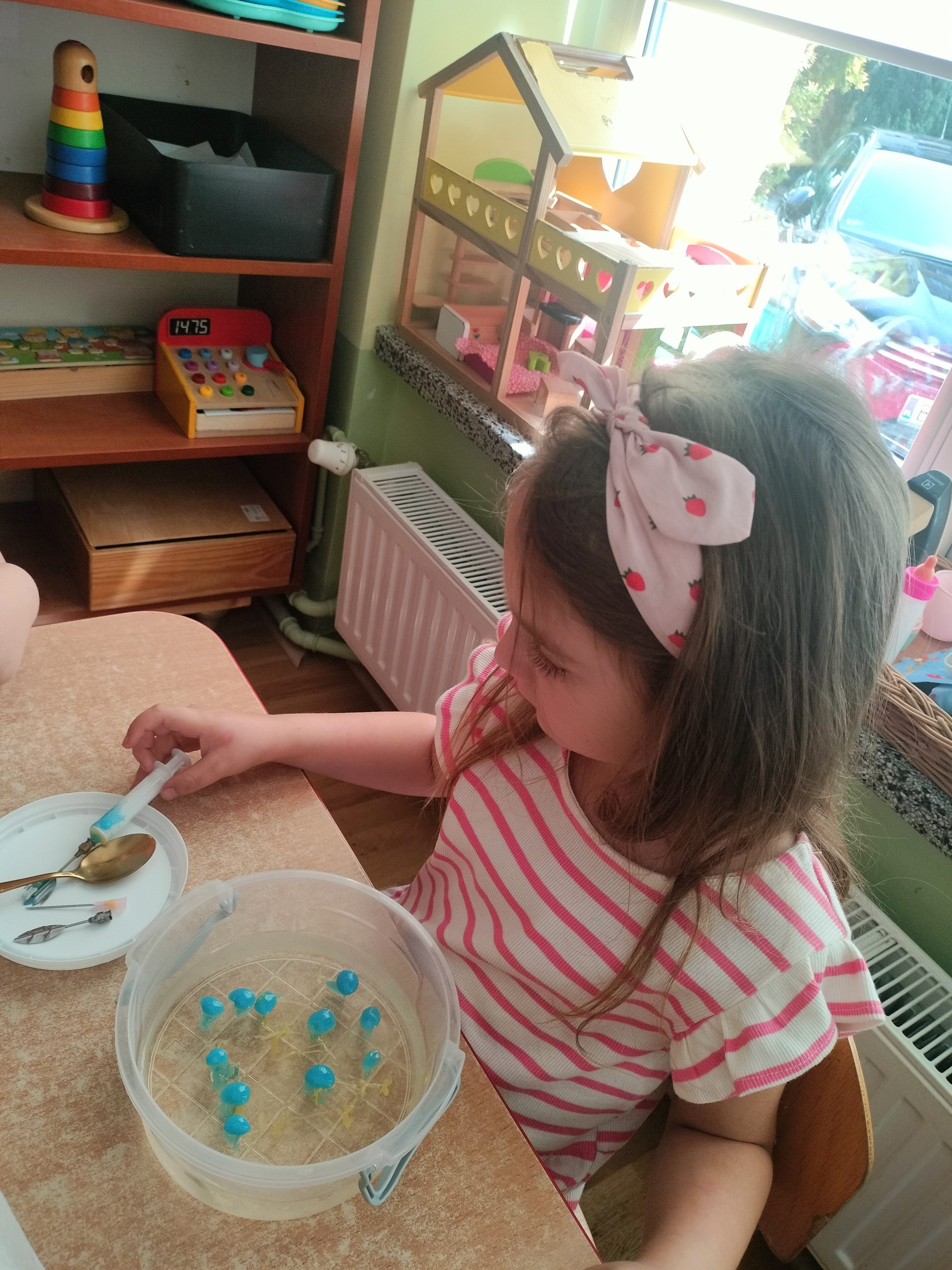 Dzieci z grupy 8 uczestniczyły w fascynujących warsztatach dekorowania galaretek techniką Jelly Art 3D. Dzięki specjalnym strzykawkom tworzyły w przezroczystej galaretce trójwymiarowe kwiaty, liście i inne elementy, które sprawiały wrażenie, jakby unosiły się w środku. To zadanie wymagało precyzji i cierpliwości, a maluchy pod okiem prowadzących z wielkim zaangażowaniem tworzyły realistyczne kompozycje – prawdziwe małe dzieła cukierniczej sztuki.