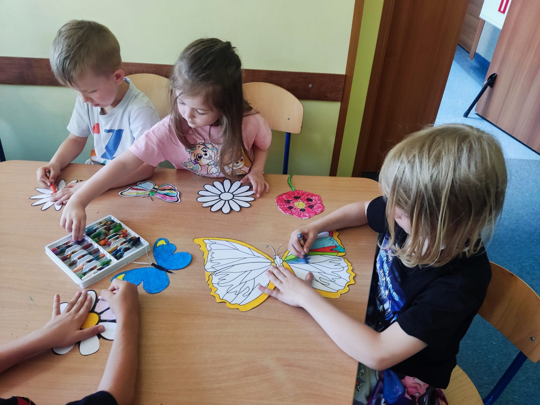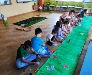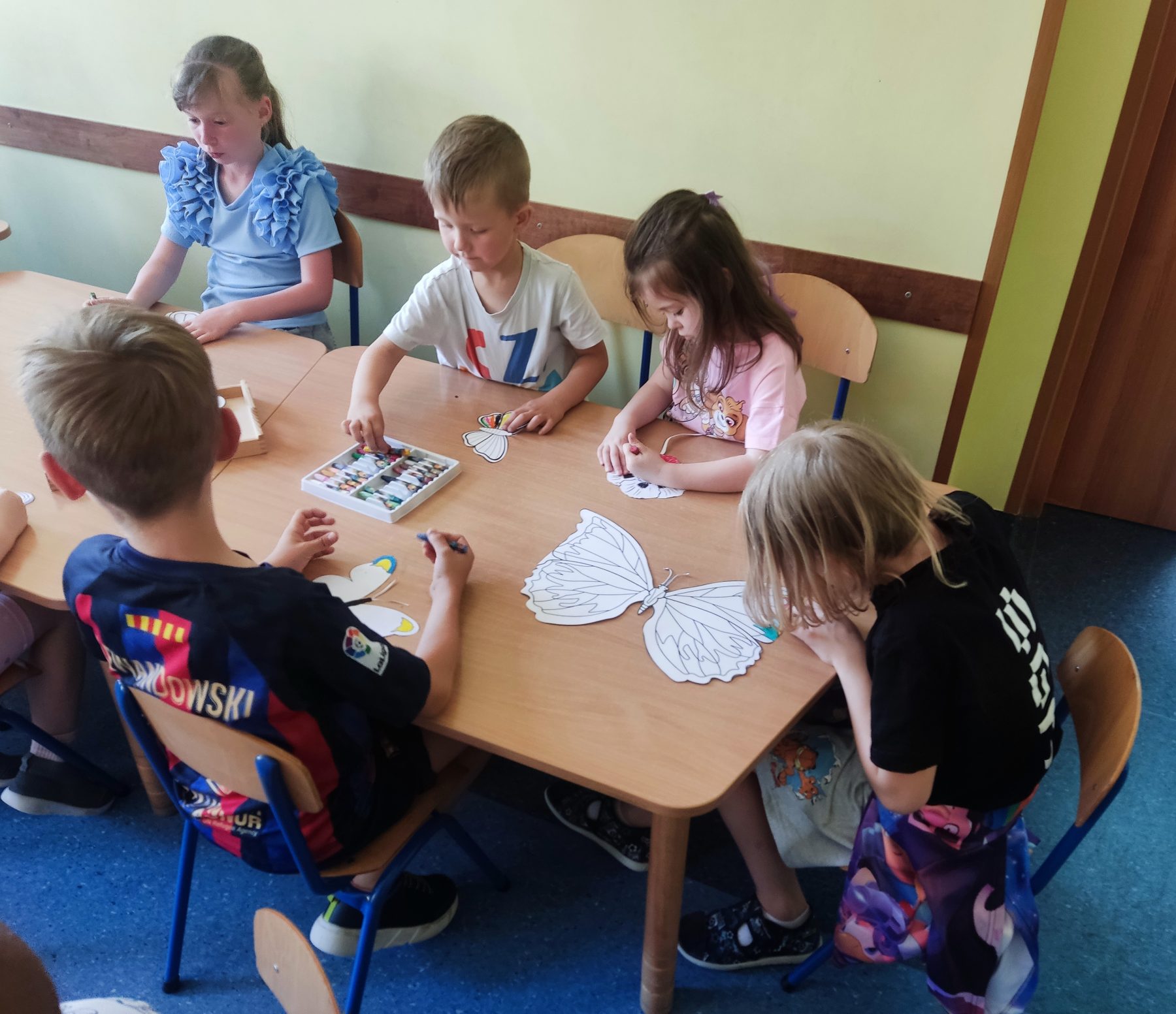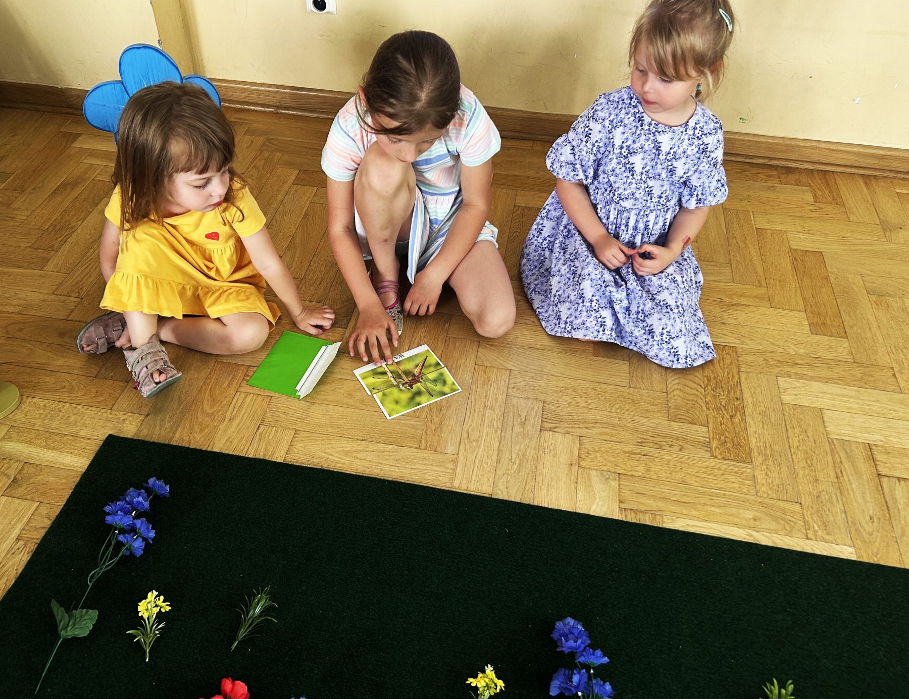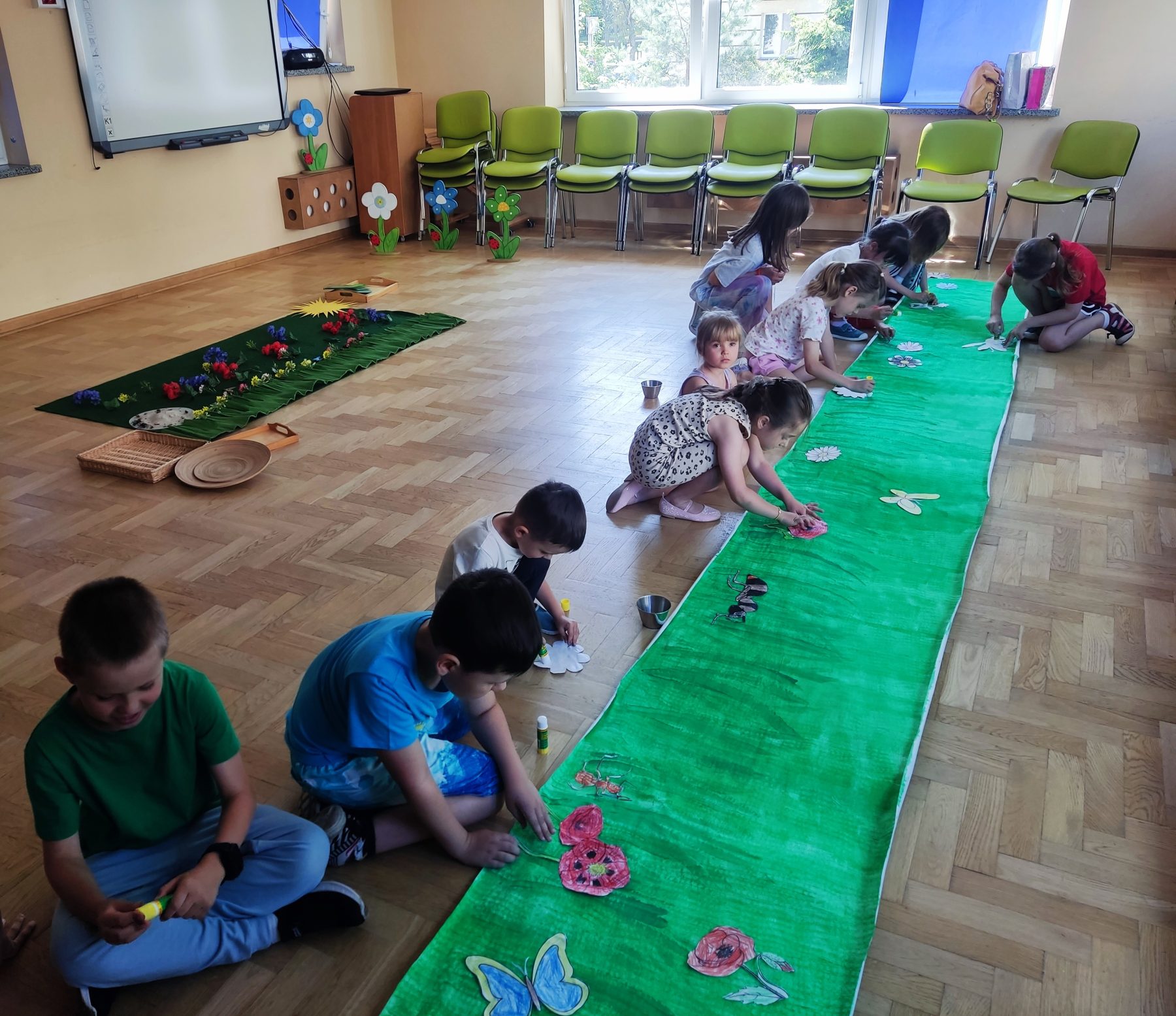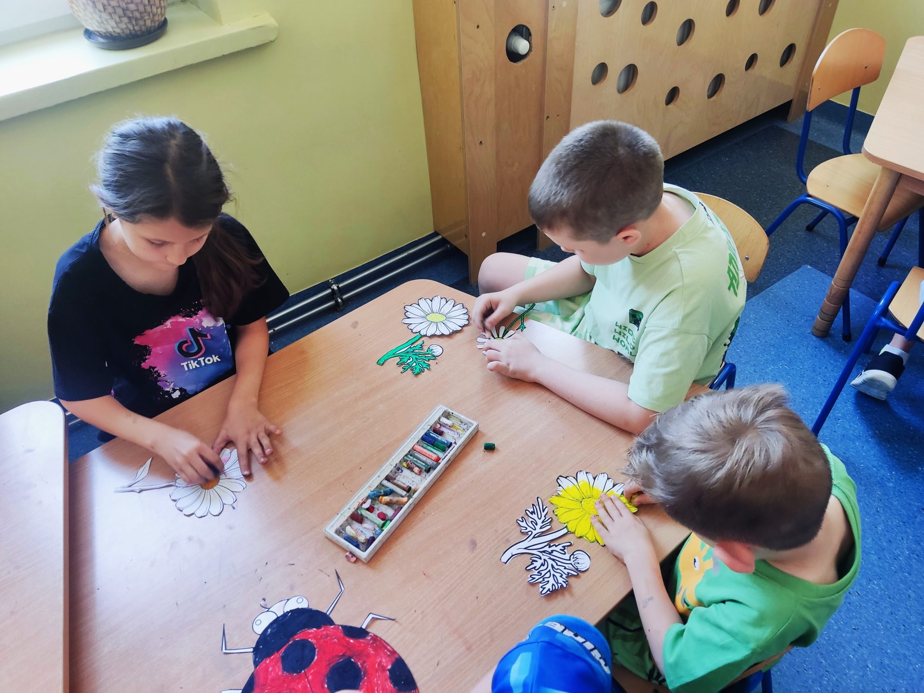 nr 4 im. Sybiraków w Białymstoku. Tematem spotkania było „Życie na łące”. Dzieci pracowały w zespołach, układając puzzle przedstawiające owady, a następnie tworzyły barwne kompozycje plastyczne. Kolorowały kwiaty i owady pastelami oraz wspólnie wyklejały łąkę. Dziękujemy za obecność, zaangażowanie i wspólnie spędzony, pełen radości czas!