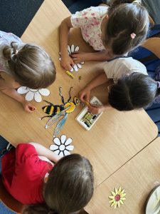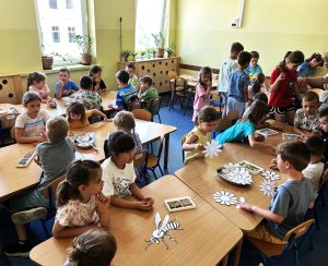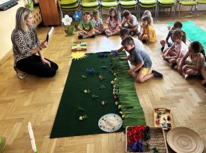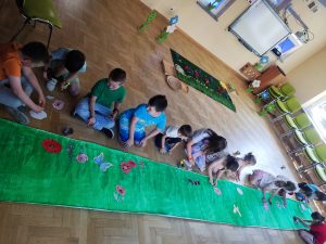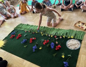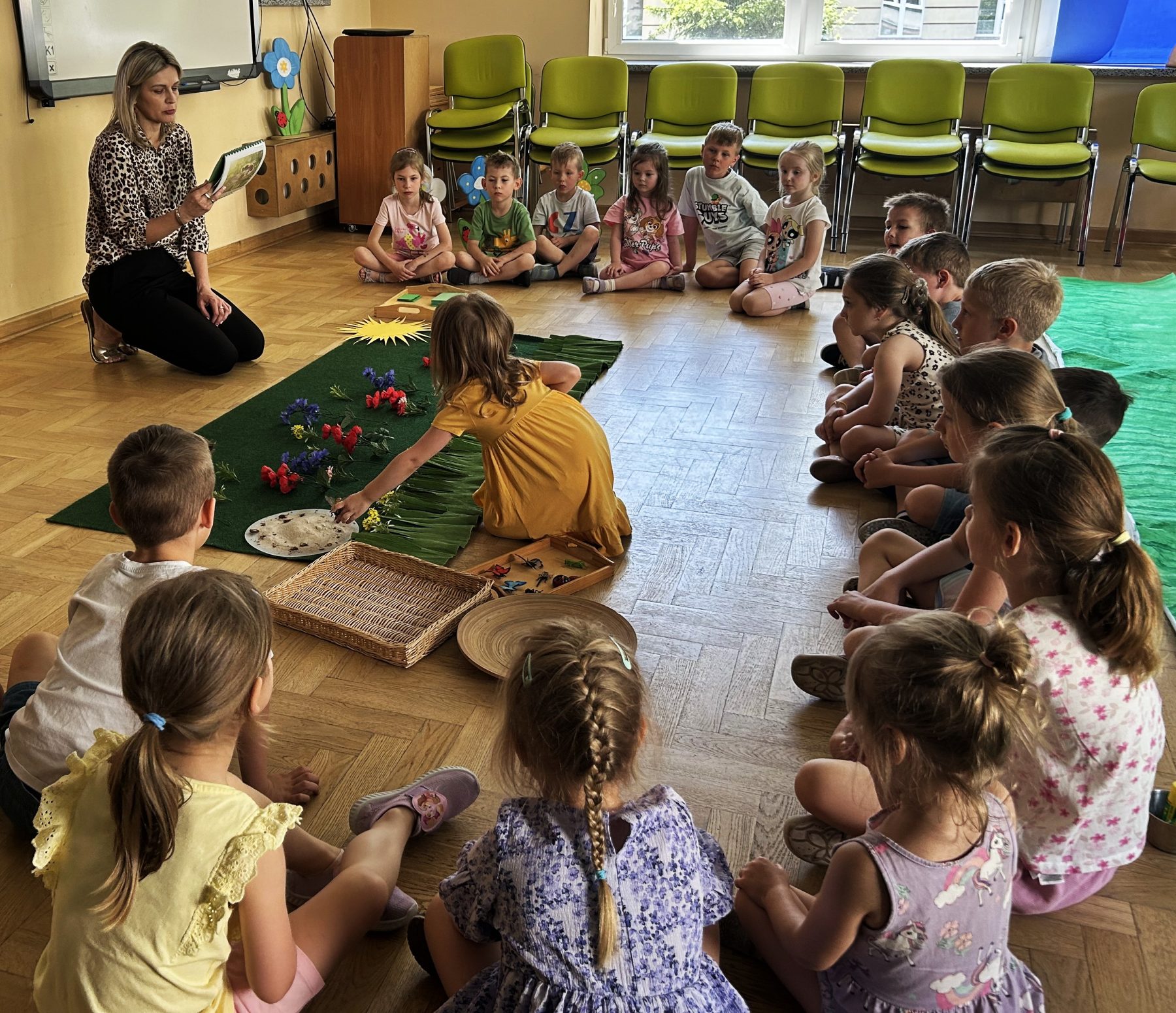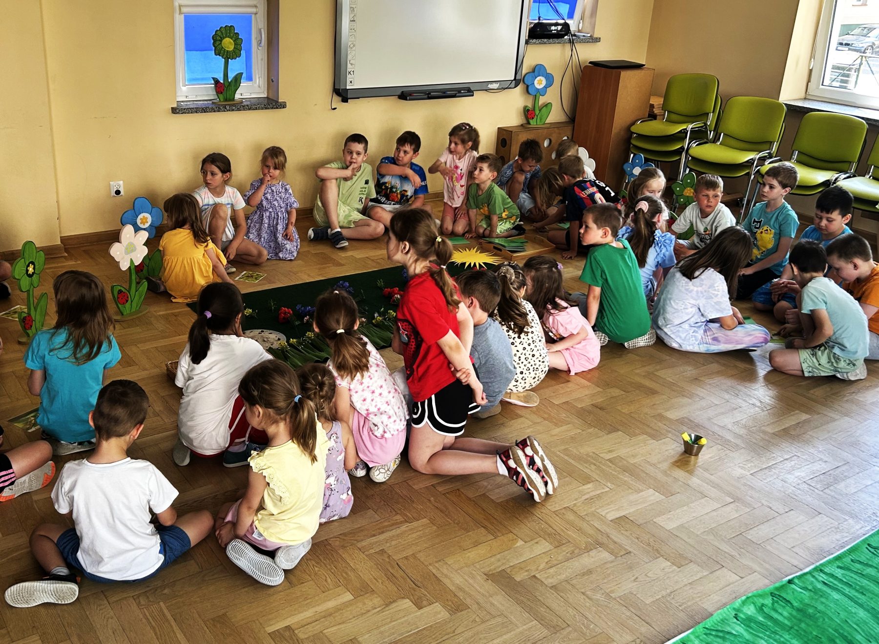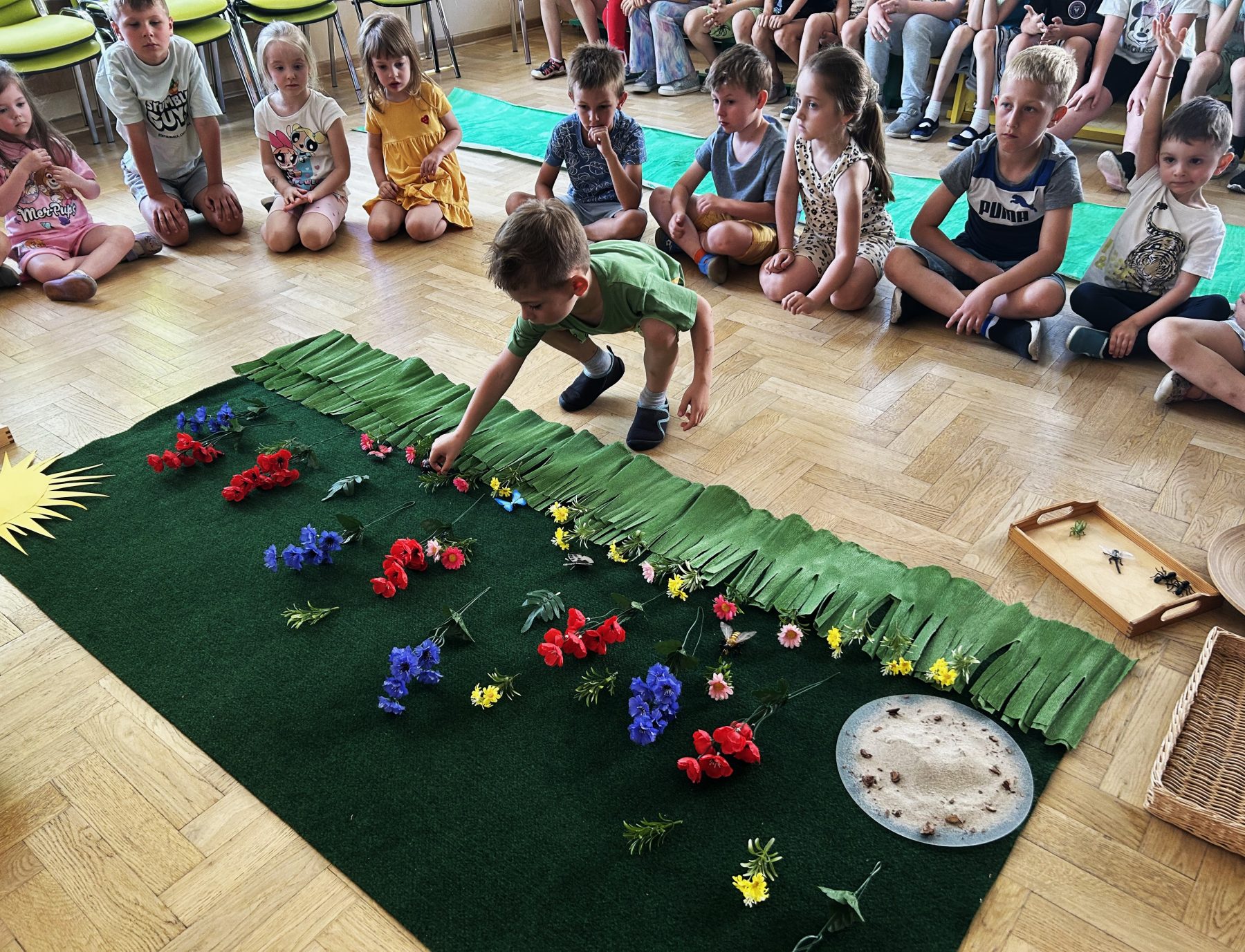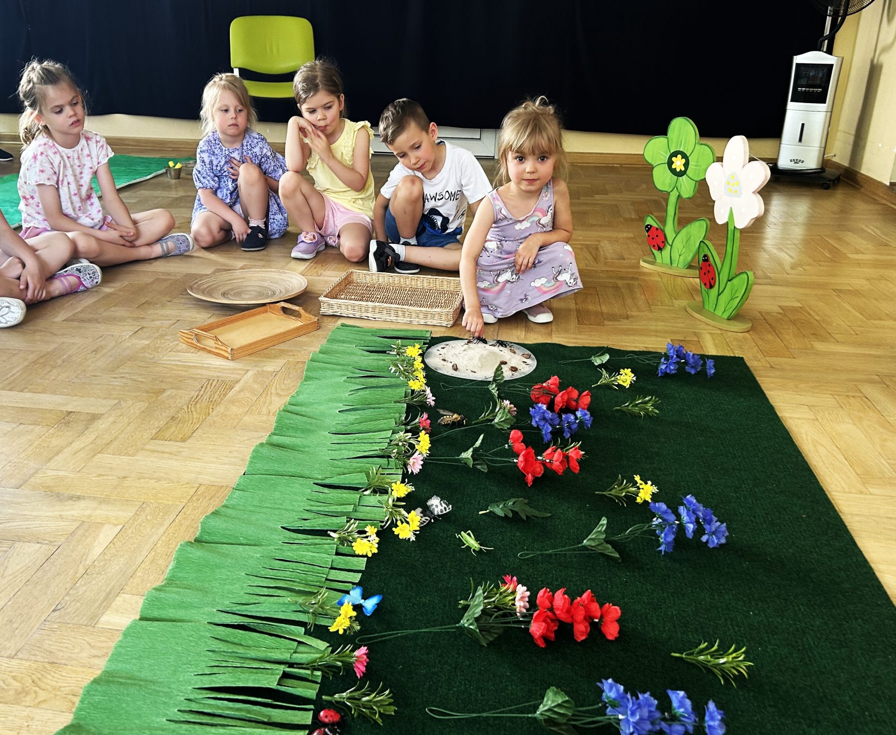 nr 4 im. Sybiraków w Białymstoku. Tematem spotkania było „Życie na łące”. Dzieci pracowały w zespołach, układając puzzle przedstawiające owady, a następnie tworzyły barwne kompozycje plastyczne. Kolorowały kwiaty i owady pastelami oraz wspólnie wyklejały łąkę. Dziękujemy za obecność, zaangażowanie i wspólnie spędzony, pełen radości czas!