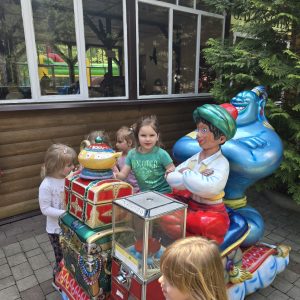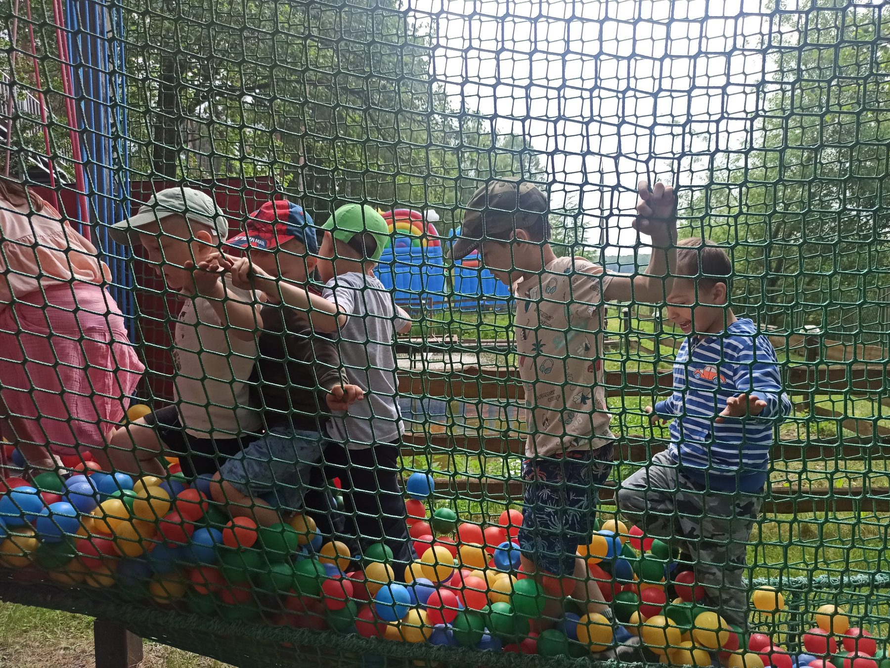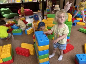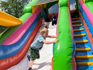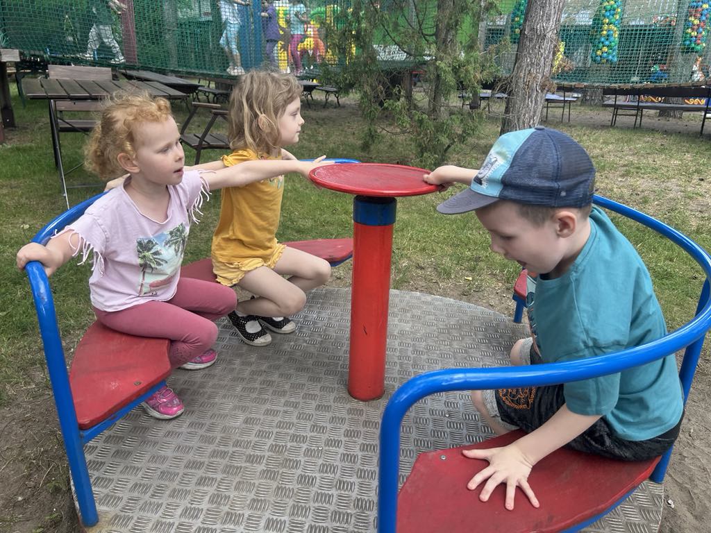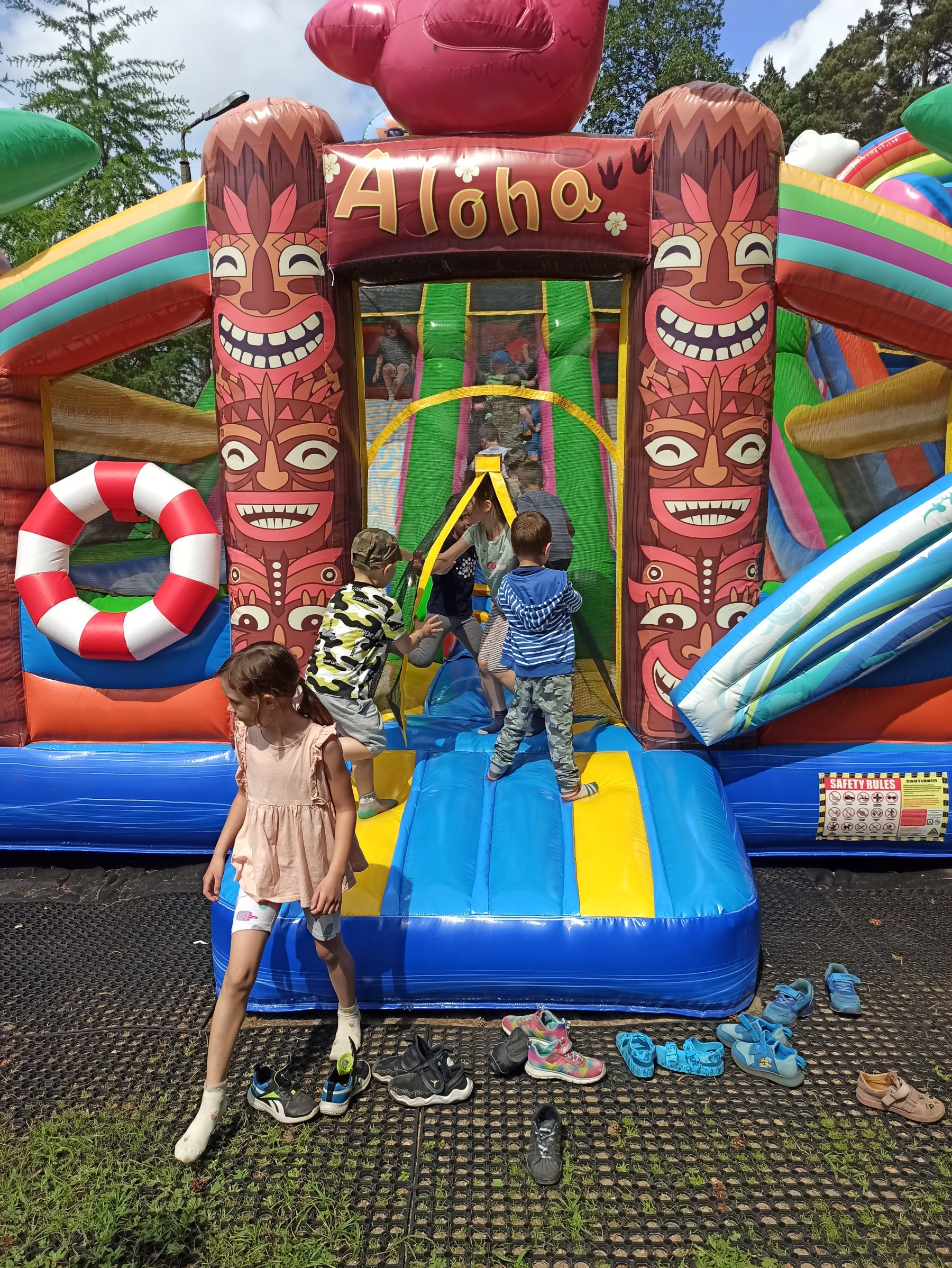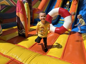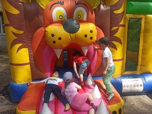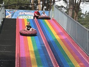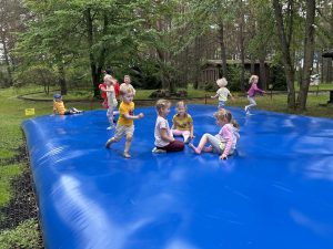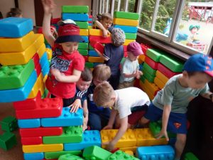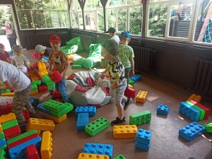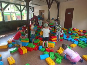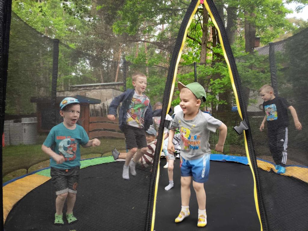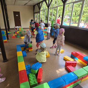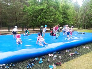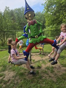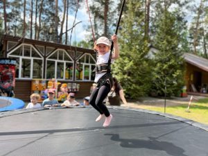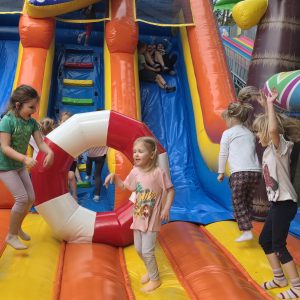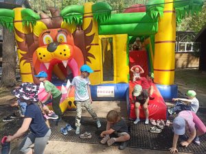 Dzieci świetnie się bawiły, korzystając z licznych atrakcji: Zamku – gdzie mogły poczuć się jak mali rycerze i księżniczki, odkrywając jego zakamarki, Trasy w siatkach – rozwijającej sprawność i koordynację,Trampolin – które dostarczyły mnóstwo radości i energicznych skoków, Dmuchańców – pełnych śmiechu i zabawy, Klockarni – miejsca, gdzie kreatywność nie znała granic! Nie zabrakło również zabaw integracyjnych, które sprzyjały współpracy i wzmacniały przedszkolne przyjaźnie.