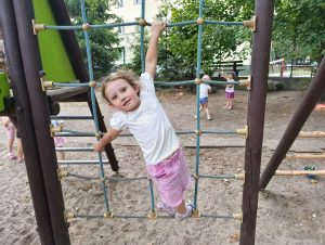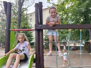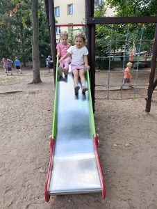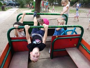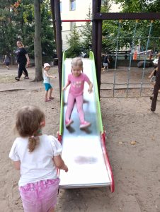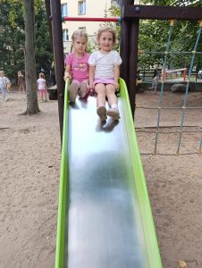 Korzystając z pięknej pogody, spędzaliśmy dużo czasu w naszym ogrodzie przedszkolnym – były zabawy na placu zabaw, bieganie, gry zespołowe i obserwacje przyrody.