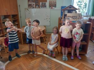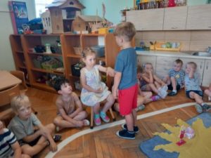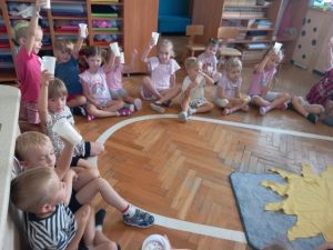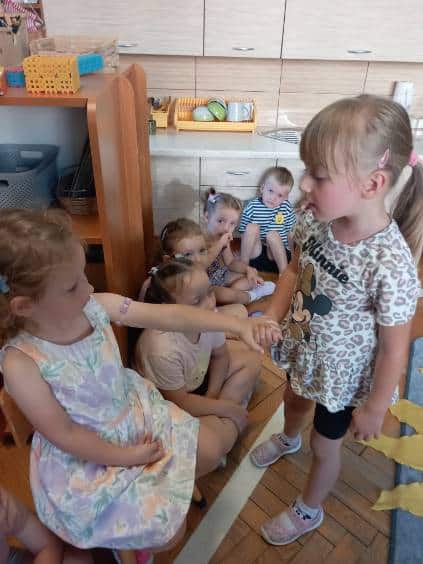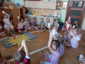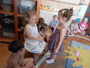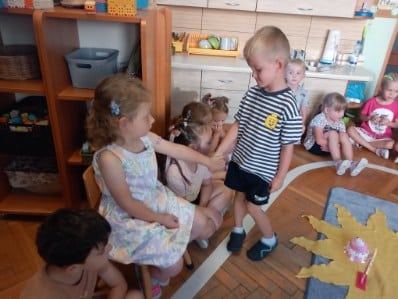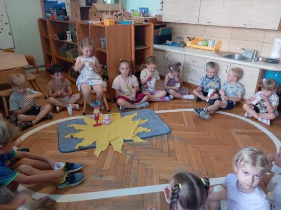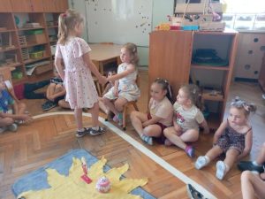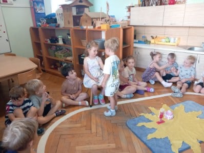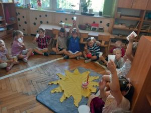Zgodnie z naszą tradycją, wszyscy razem rozłożyliśmy urodzinowe słoneczko a następnie przekazaliśmy Weronice mnóstwo uścisków. Specjalne urodzinowe słoneczko którego każdy promyk zawierał ciepłe słowo lub życzenie od dzieci.