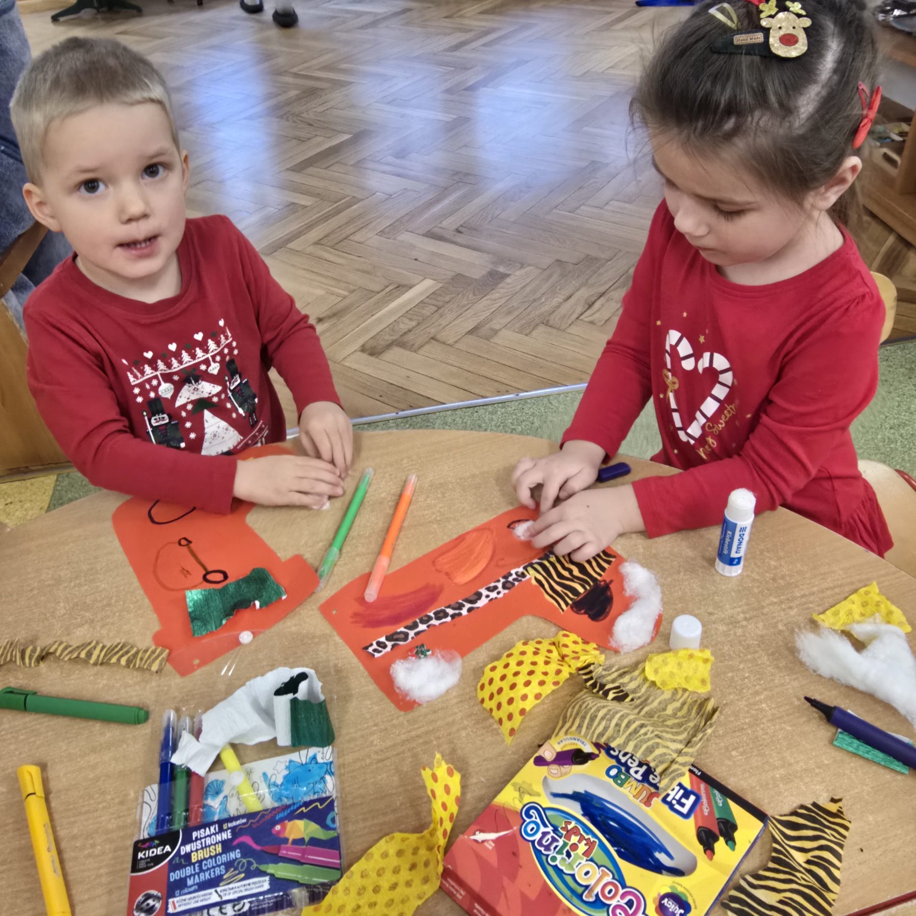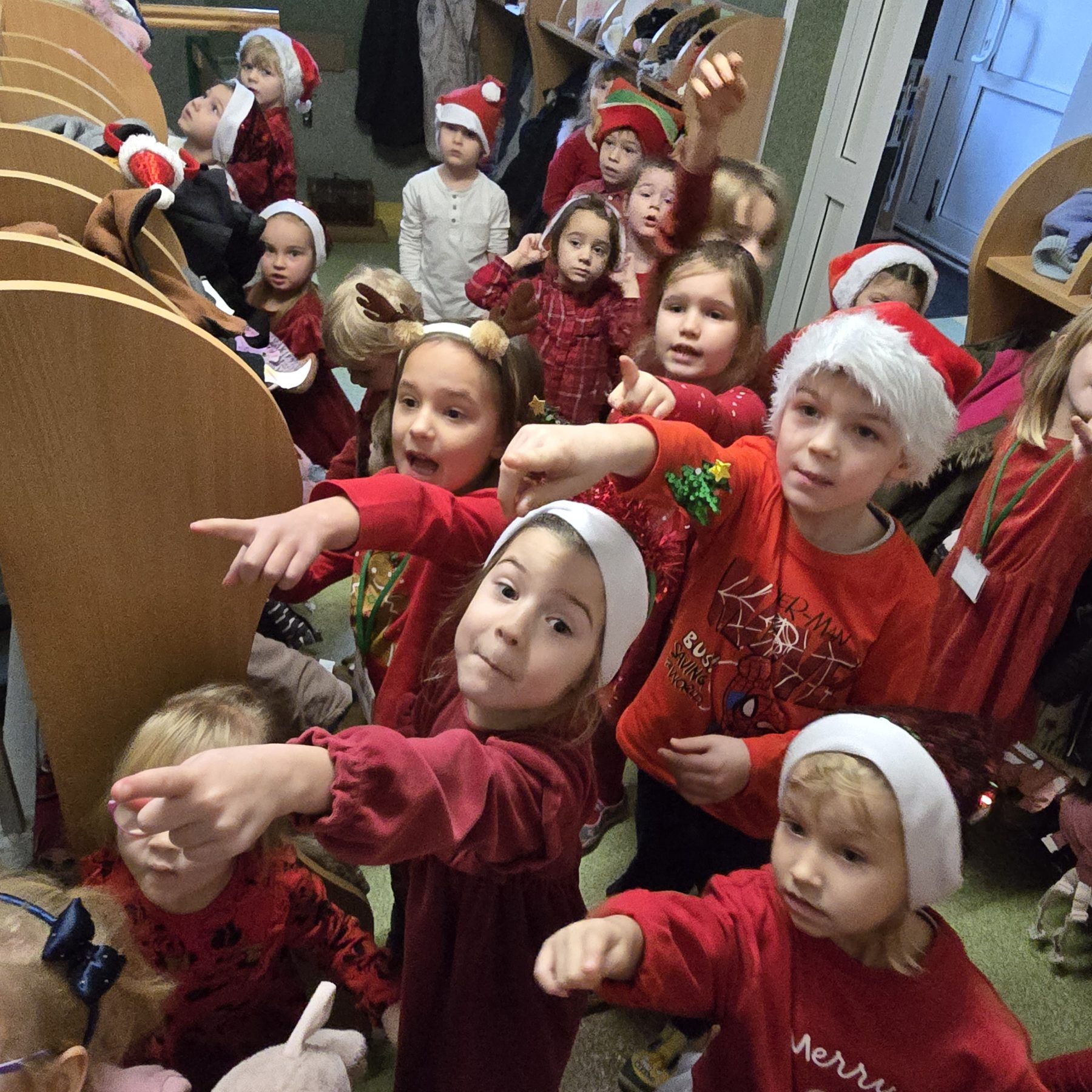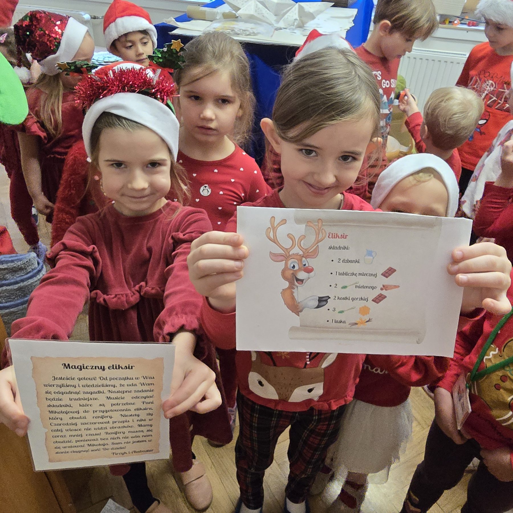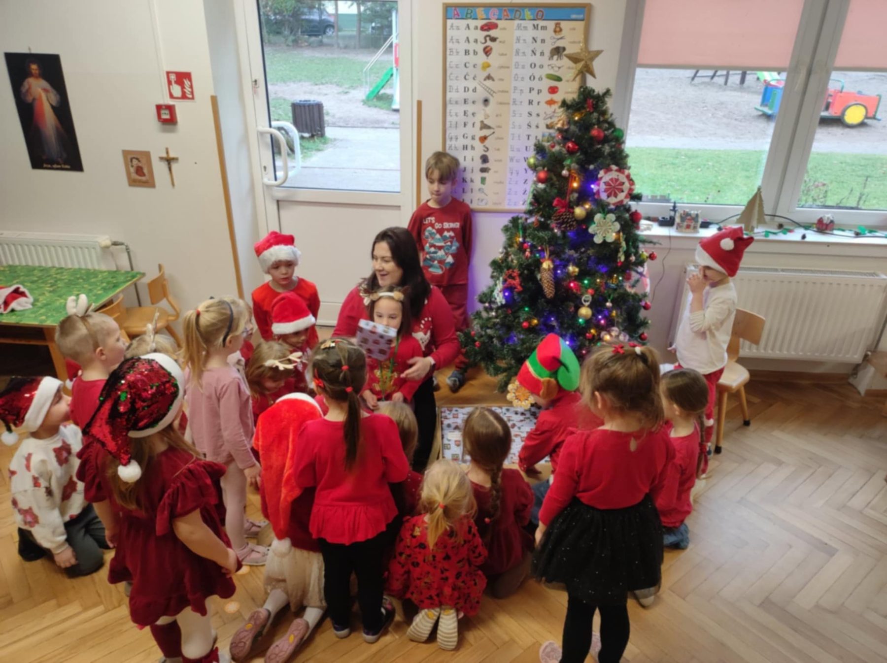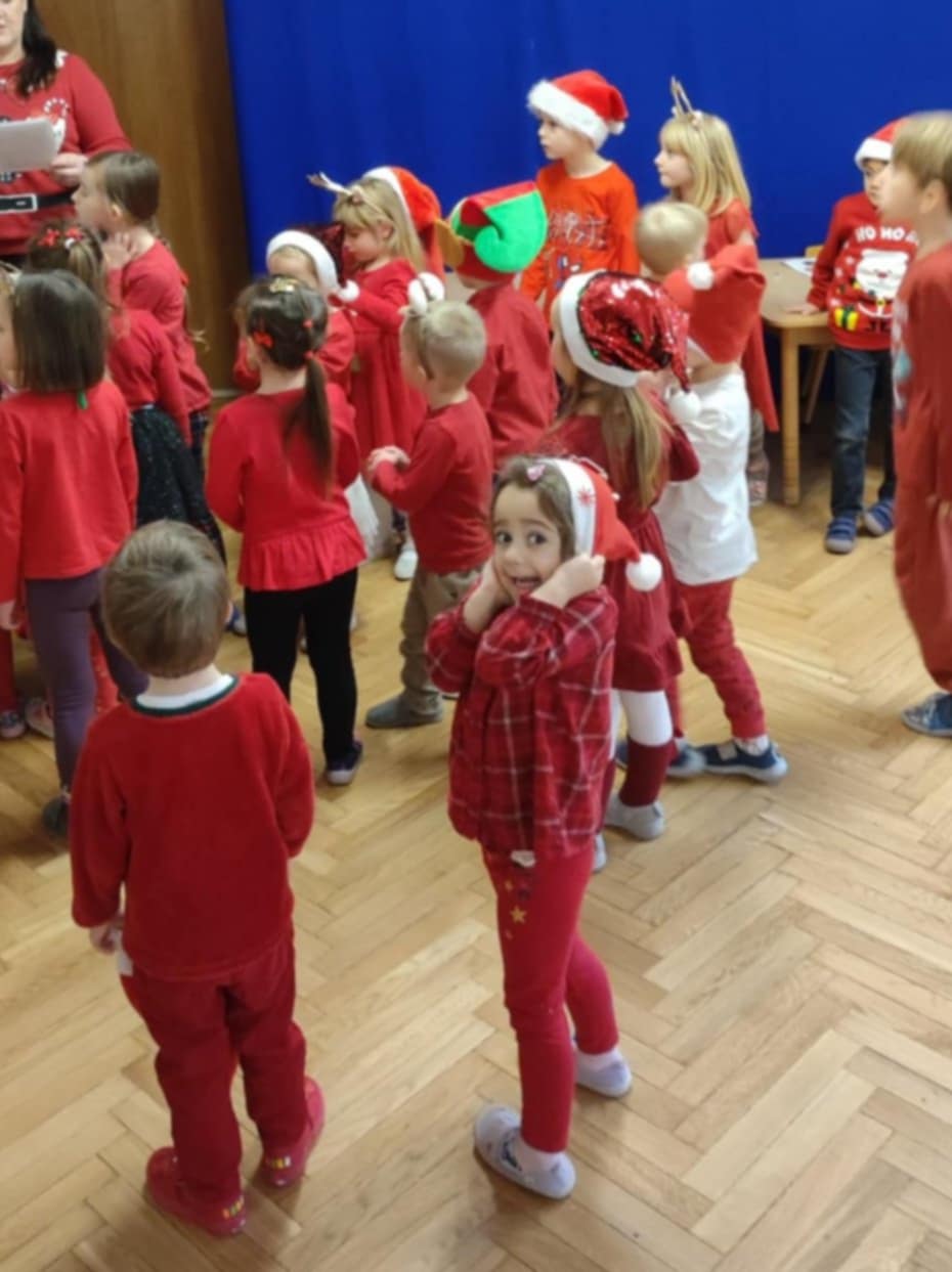 Mikołajkowy dzień rozpoczął się wyjątkowo – wszystkie dzieci przyszły ubrane na czerwono, wprowadzając do przedszkola prawdziwie świąteczną atmosferę. Przedszkolaki z radością tańczyły i śpiewały piosenki o Mikołaju, a następnie wykonywały zadania przygotowane przez panią Mikołajkową. Gdy wszystkie wyzwania zostały ukończone, dzieci odkryły prezenty oraz list od Świętego Mikołaja z wiadomością, że już wkrótce nas odwiedzi. To był dzień pełen emocji i magicznego oczekiwania.
