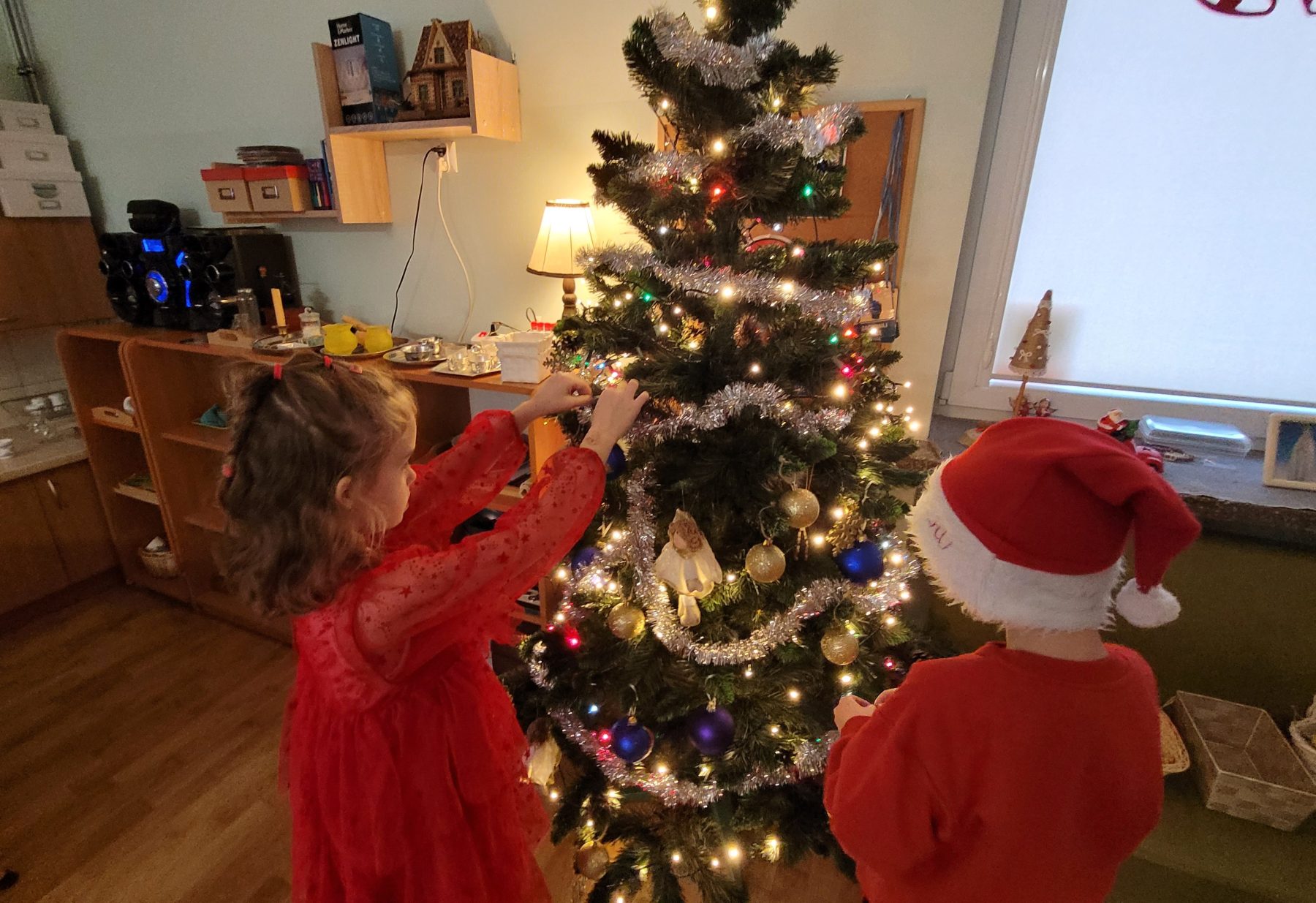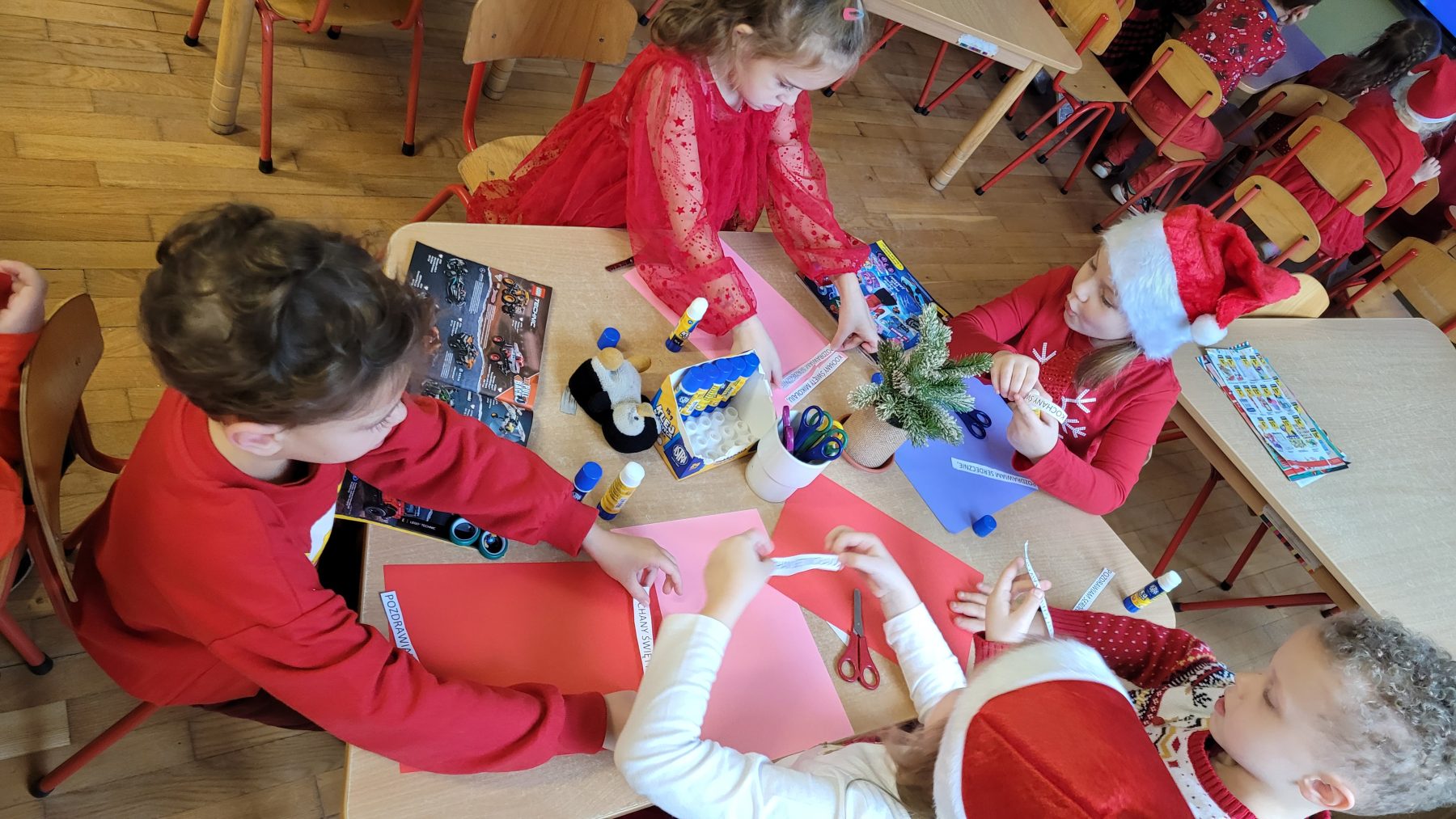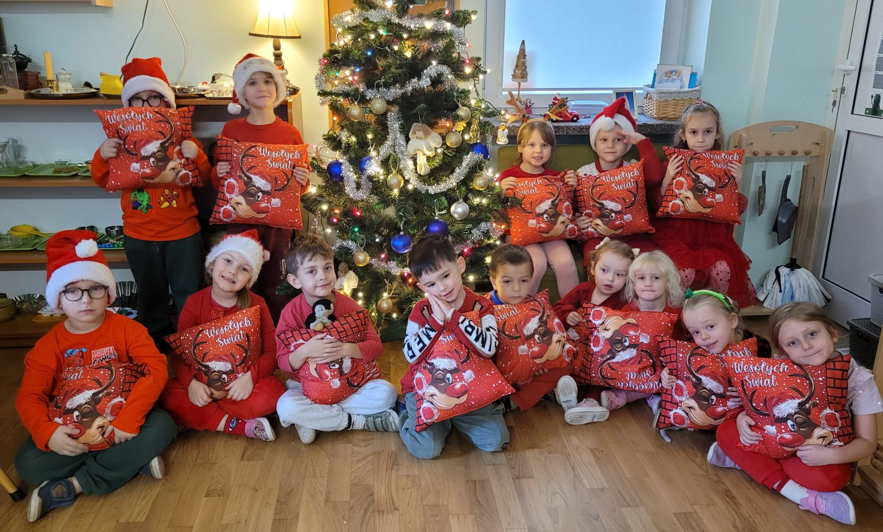 W piątek (05.12.2025 r.) nadszedł długo wyczekiwany przez dzieci dzień. Wszystkie przedszkolaki ubrały się do przedszkola na czerwono, a ich głowy zdobiły mikołajkowe czapki oraz świąteczne opaski. Wspólne zabawy mikołajkowe, słuchanie kolęd, ubieranie choinki, projektowanie listu do św. Mikołaja i wiele innych atrakcji czekało na dzieci w tym dniu. Ale najważniejsze nastąpiło przed obiadem – prezenty od św. Mikołaja.