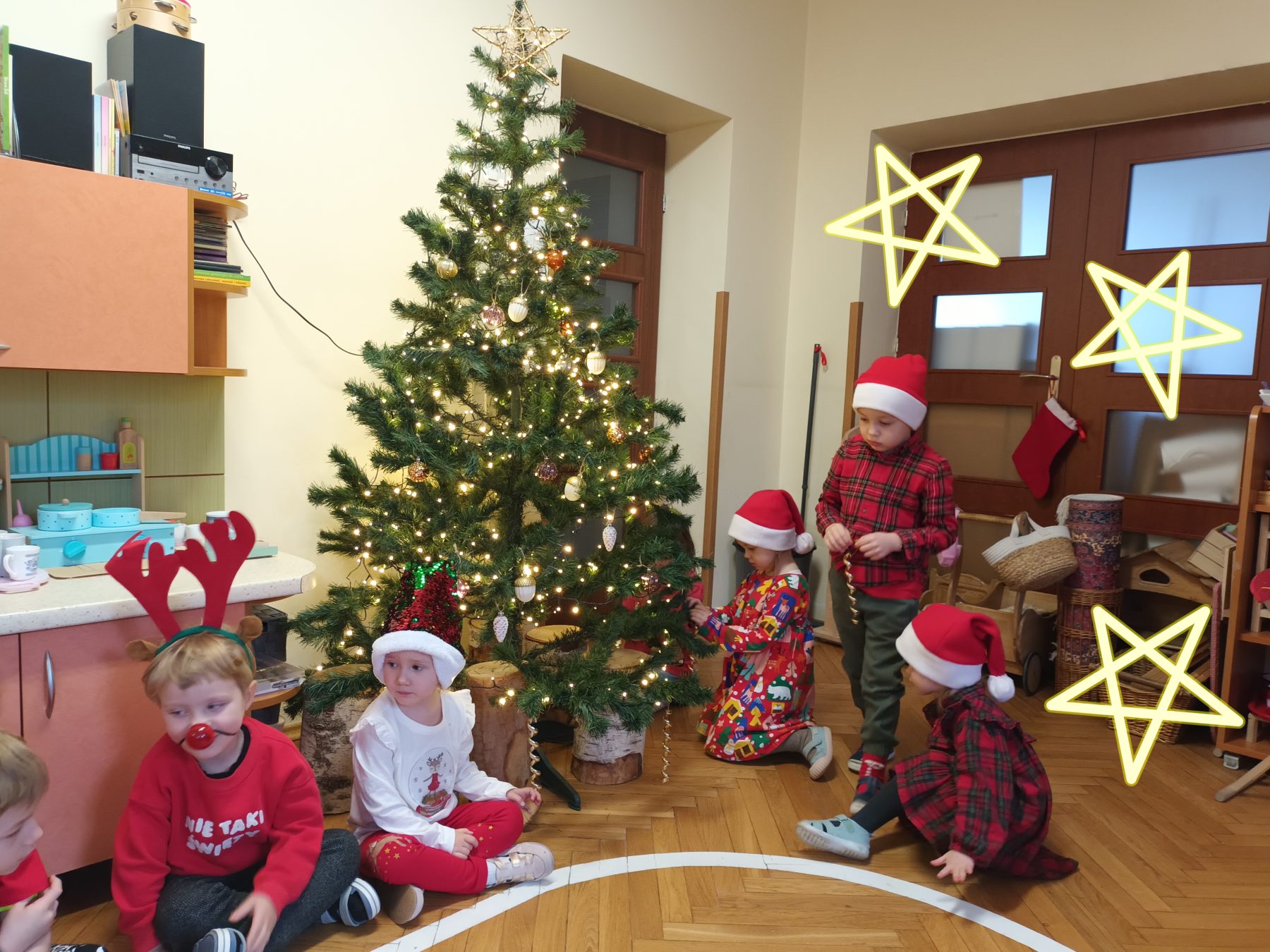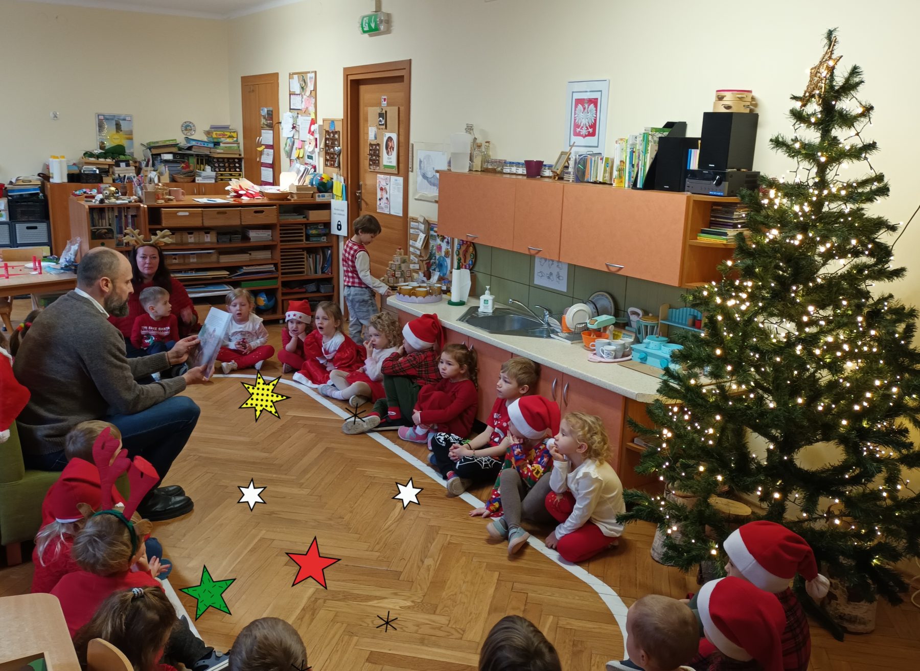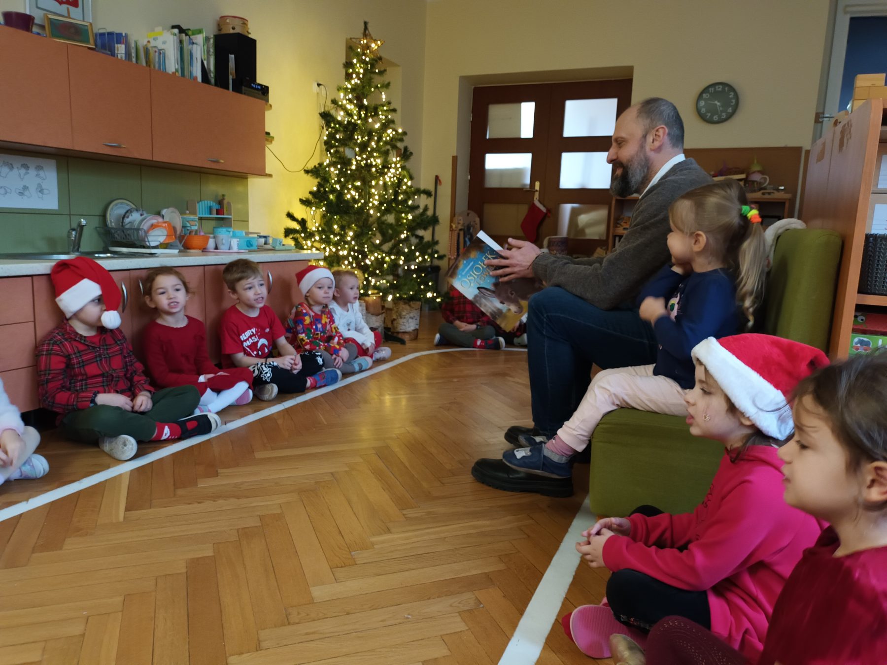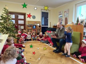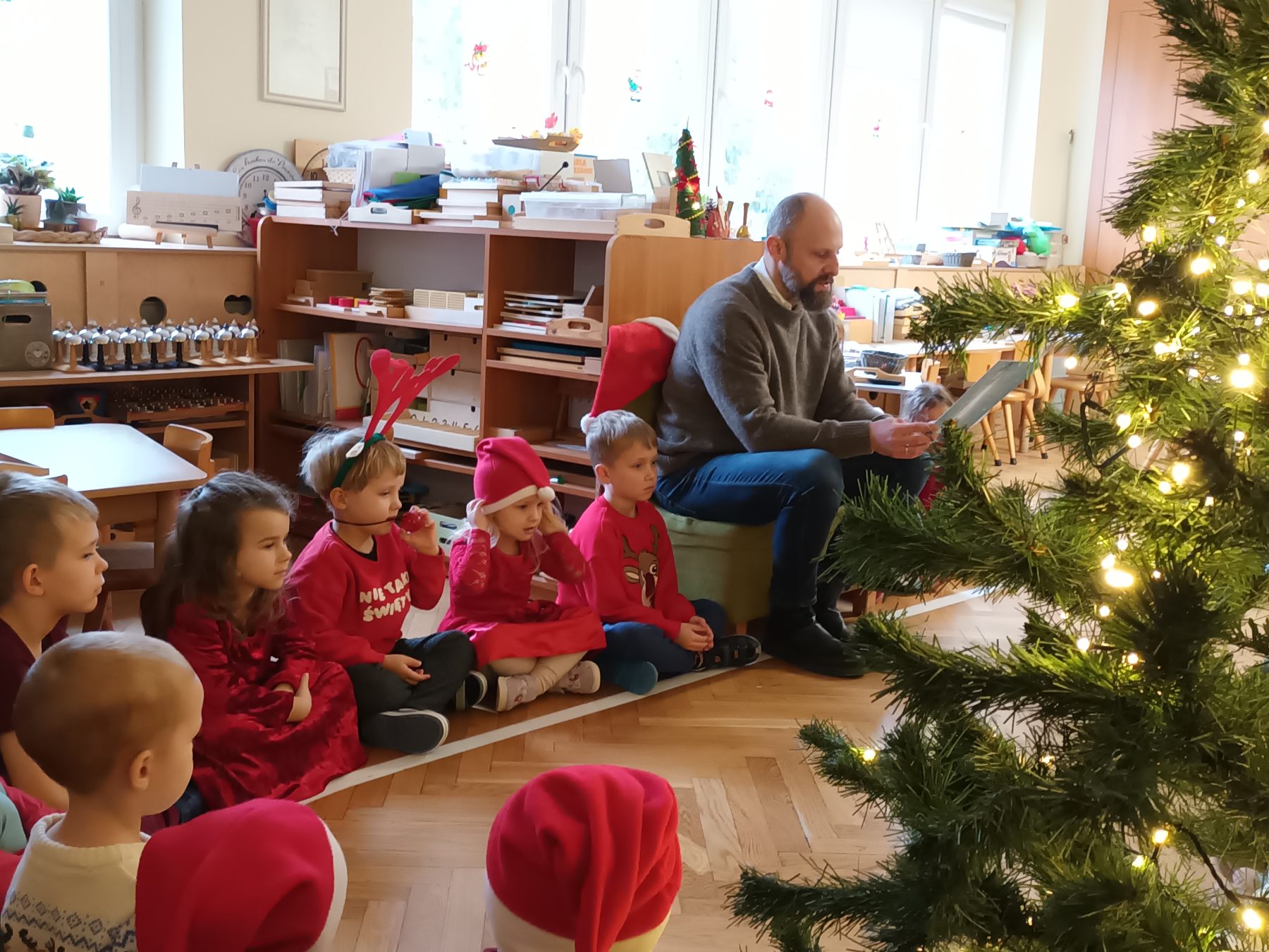Mikołajki w przedszkolu to magiczny dzień pełen radości, zabaw i niespodzianek, celebrowany 6 grudnia, gdzie dzieci często przychodzą w czerwonych czapkach i oczekują wizyty Świętego Mikołaja, który przynosi prezenty. Organizuje się wtedy wspólne zabawy, konkursy, śpiewa piosenki, tworzy ozdoby świąteczne, a także przygotowuje listy do Mikołaja, rozwijając przy tym kreatywność i poczucie wspólnoty. Mikołajki w przedszkolu Montessori łączą tradycję z zasadami metody, skupiając się na wspólnej radości, działaniu i kreatywności. Zamiast tylko na biernym otrzymywaniu, często obejmują zabawy tematyczne, tworzenie ozdób i listów, wspólne śpiewanie kolęd, a prezenty są dostosowane do wieku i preferowane jako sensoryczne lub małe upominki edukacyjne. Wręczane są często za udział w aktywnościach, by promować pomysł dzielenia się i czynienia dobra. Dzieci mogą również samodzielnie przygotowywać dekoracje w sali i prezenty, zgodnie z duchem Montessori. Dziękujemy tacie Estery za wizytę w Grupie V w ramach Akcji Cała Polska Czyta Dzieciom. Przedszkolaki słuchały z bardzo dużym zainteresowaniem opowiadania o Bożym Narodzeniu.