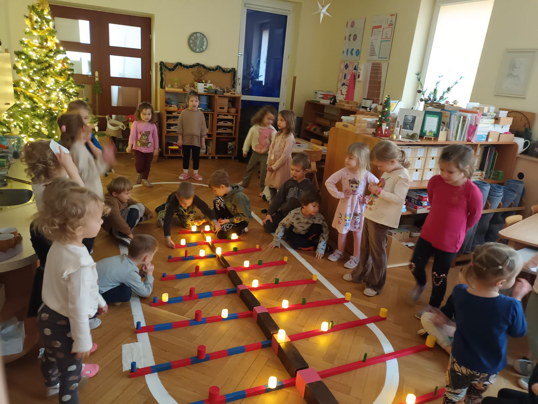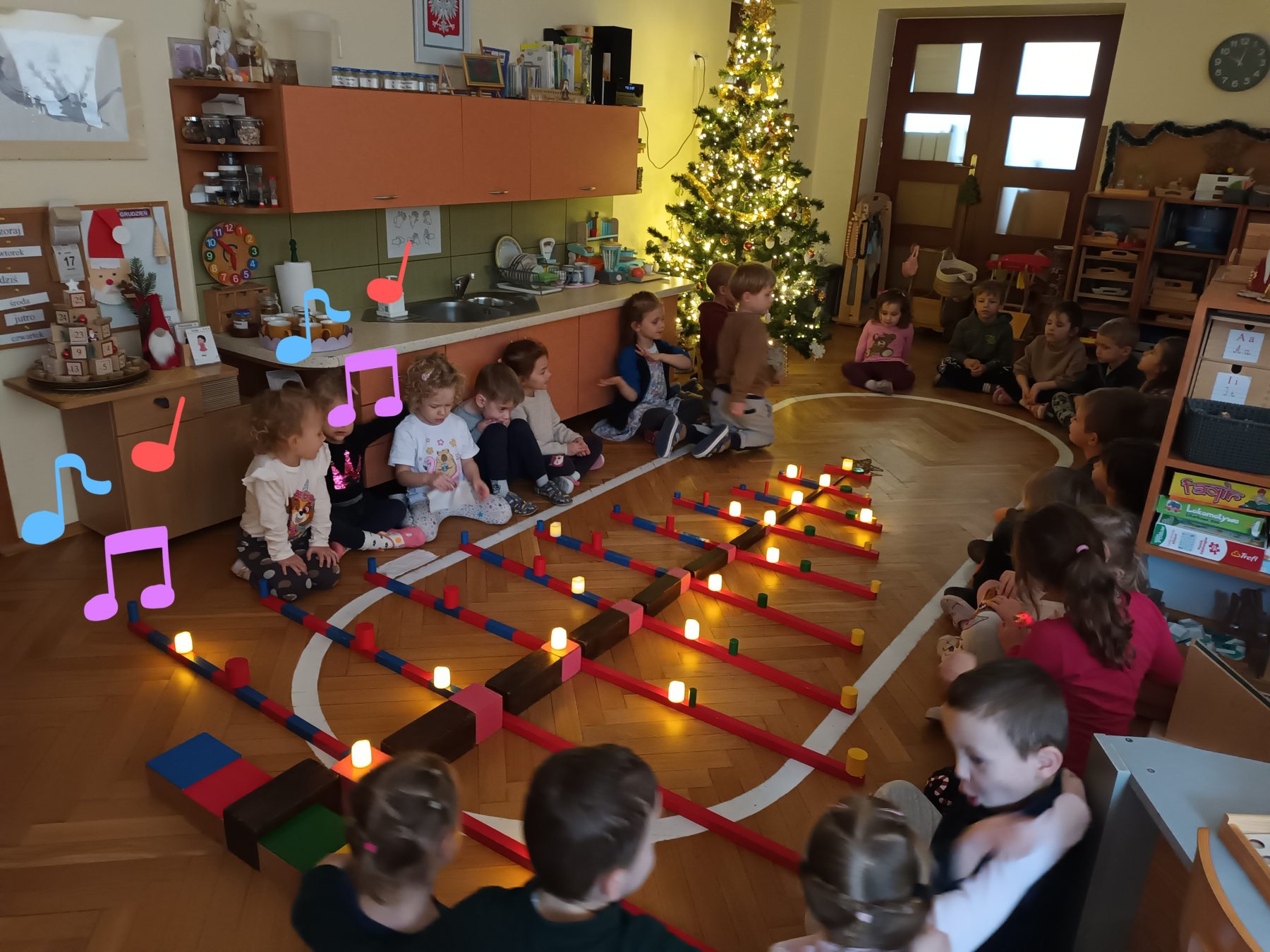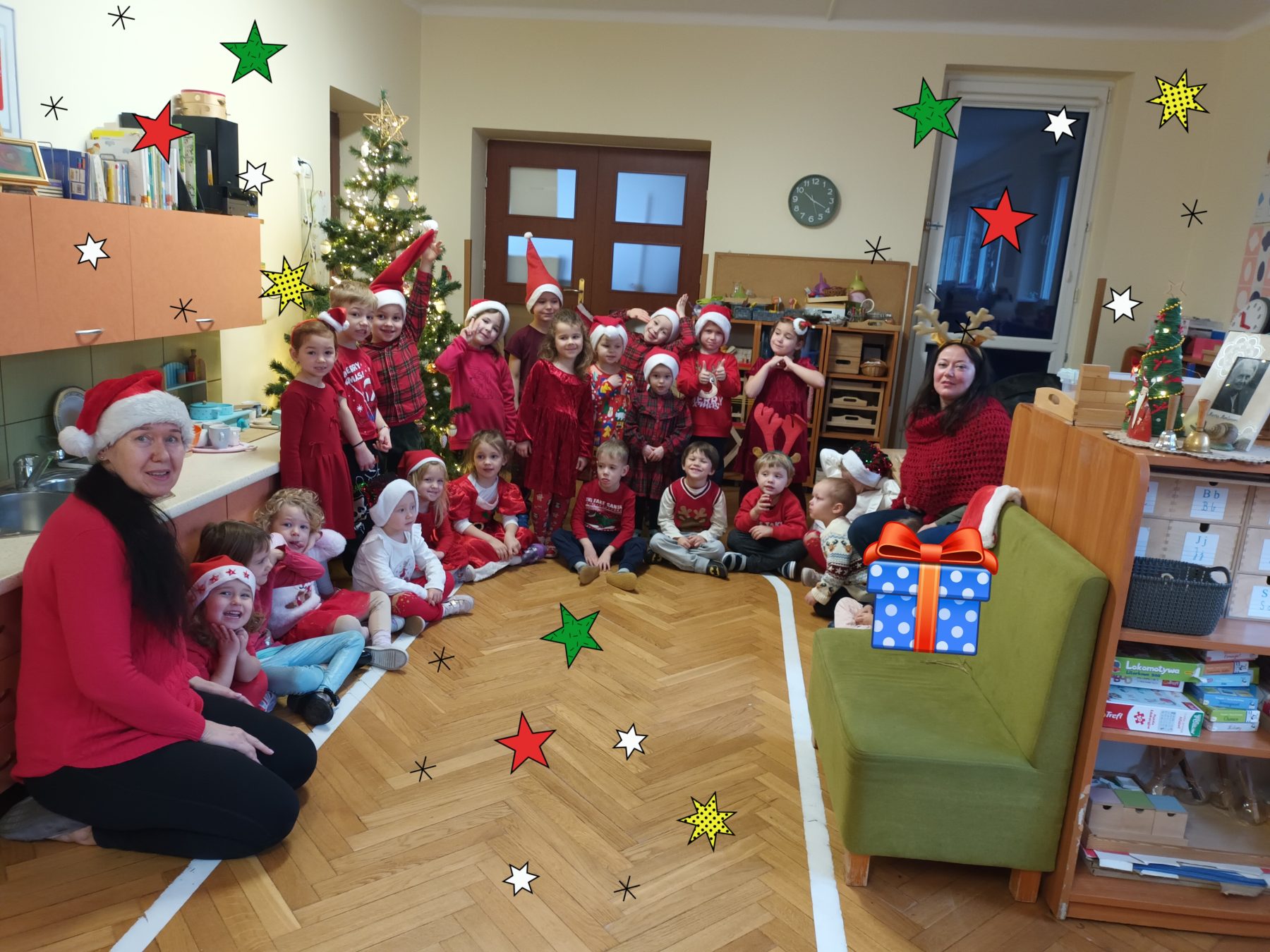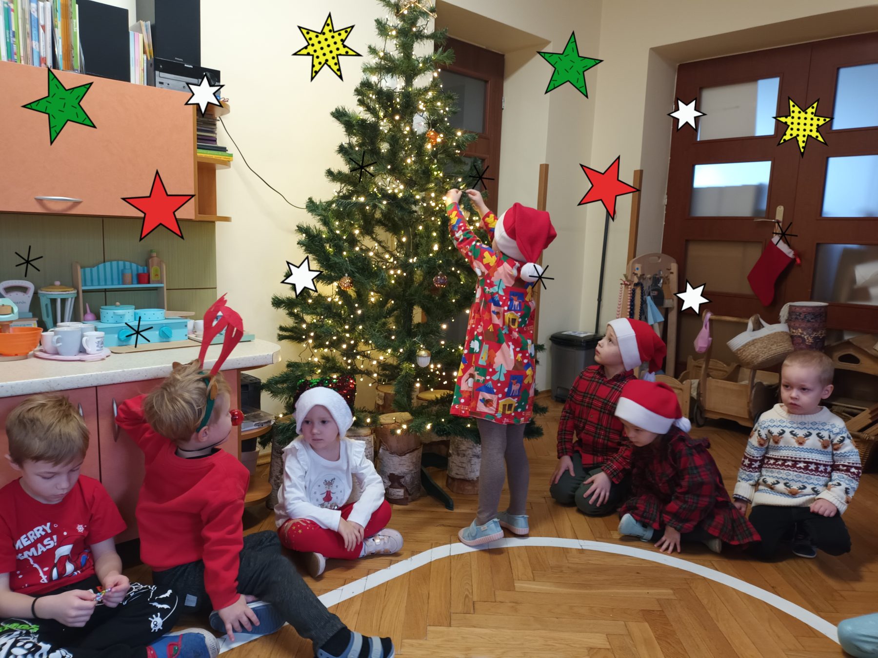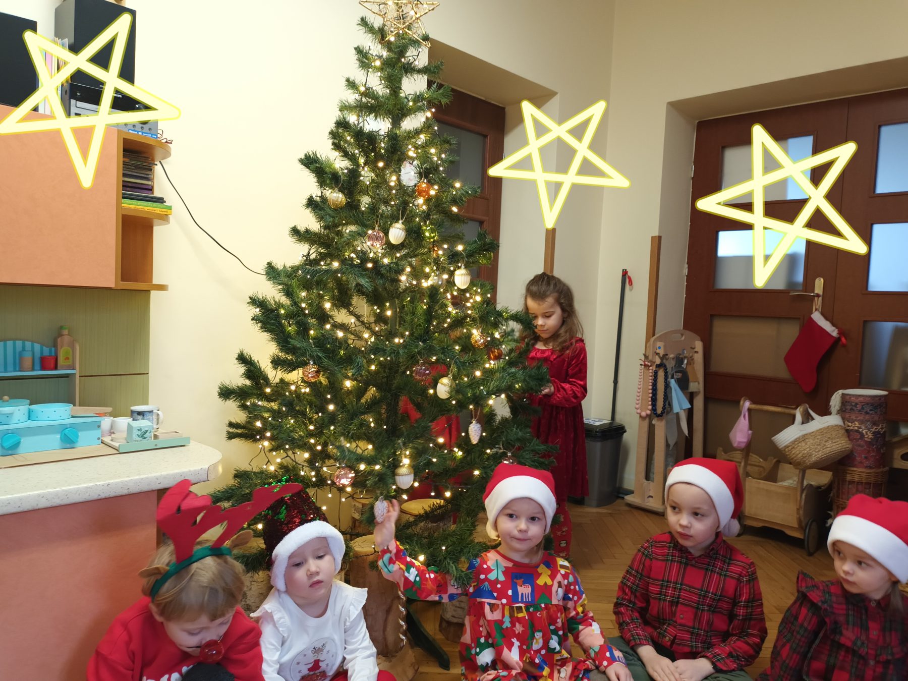Mikołajki w przedszkolu to magiczny dzień pełen radości, zabaw i niespodzianek, celebrowany 6 grudnia, gdzie dzieci często przychodzą w czerwonych czapkach i oczekują wizyty Świętego Mikołaja, który przynosi prezenty. Organizuje się wtedy wspólne zabawy, konkursy, śpiewa piosenki, tworzy ozdoby świąteczne, a także przygotowuje listy do Mikołaja, rozwijając przy tym kreatywność i poczucie wspólnoty. Mikołajki w przedszkolu Montessori łączą tradycję z zasadami metody, skupiając się na wspólnej radości, działaniu i kreatywności. Zamiast tylko na biernym otrzymywaniu, często obejmują zabawy tematyczne, tworzenie ozdób i listów, wspólne śpiewanie kolęd, a prezenty są dostosowane do wieku i preferowane jako sensoryczne lub małe upominki edukacyjne. Wręczane są często za udział w aktywnościach, by promować pomysł dzielenia się i czynienia dobra. Dzieci mogą również samodzielnie przygotowywać dekoracje w sali i prezenty, zgodnie z duchem Montessori. Dziękujemy tacie Estery za wizytę w Grupie V w ramach Akcji Cała Polska Czyta Dzieciom. Przedszkolaki słuchały z bardzo dużym zainteresowaniem opowiadania o Bożym Narodzeniu.