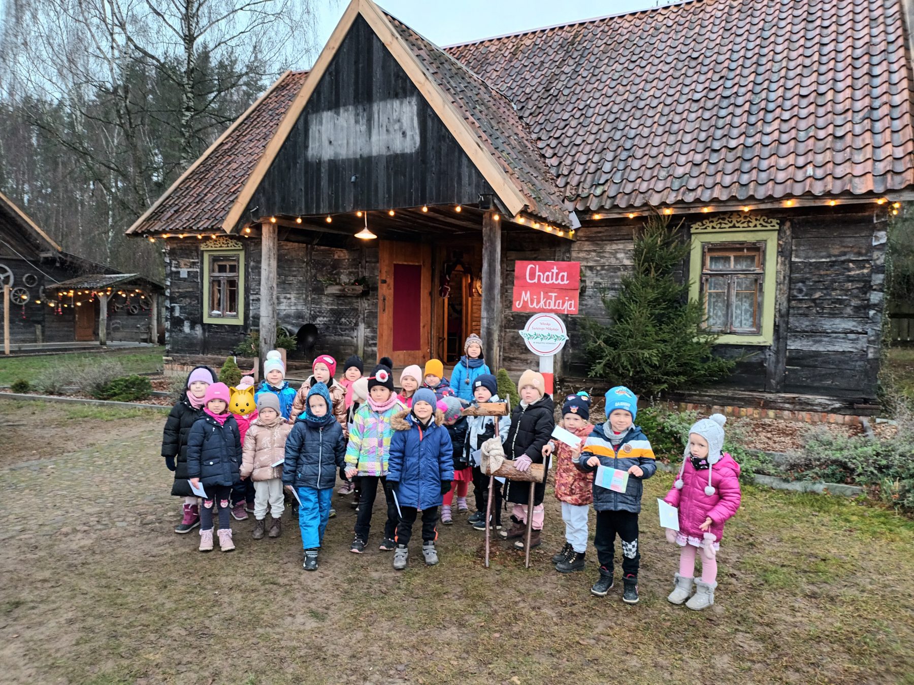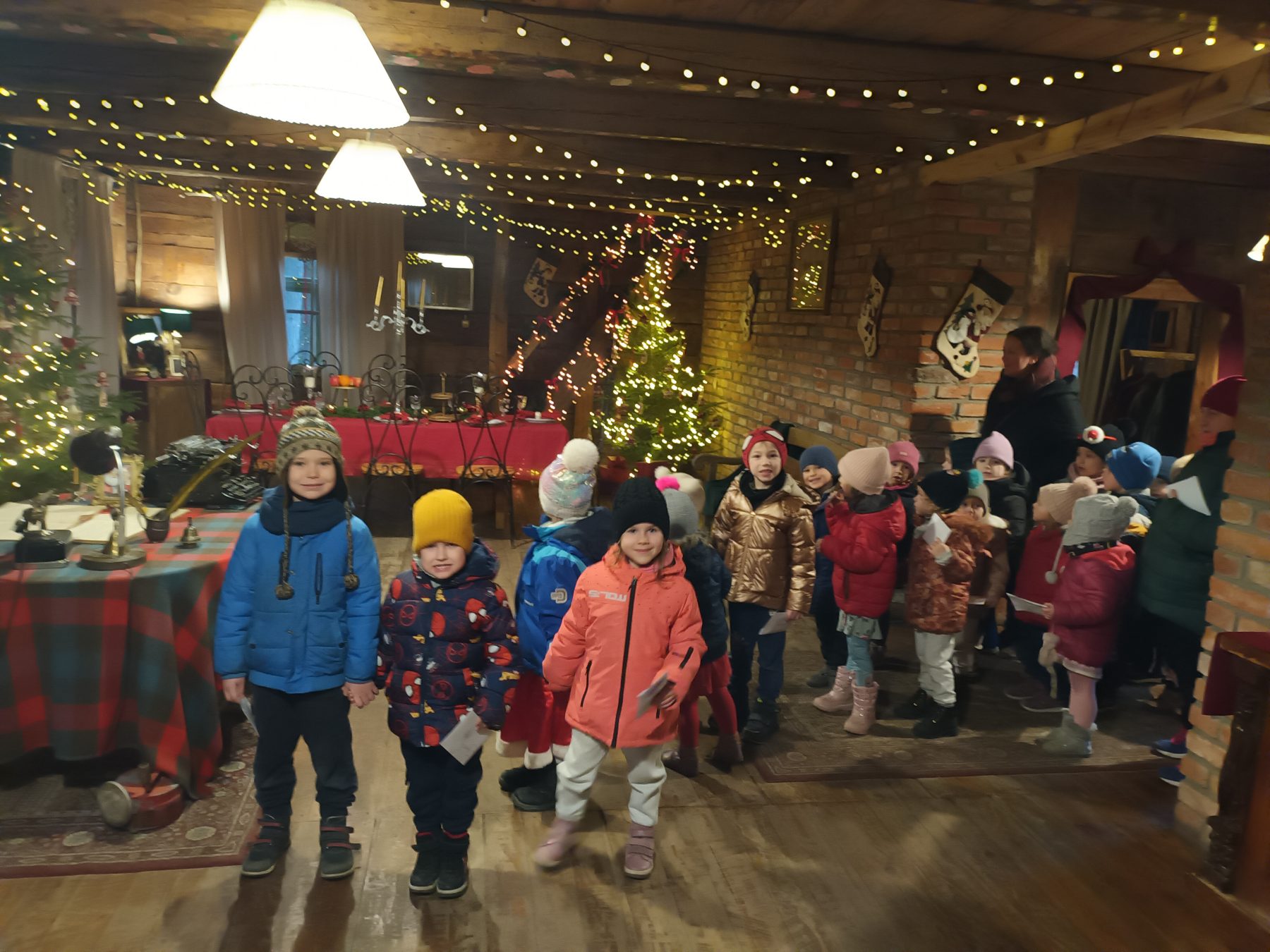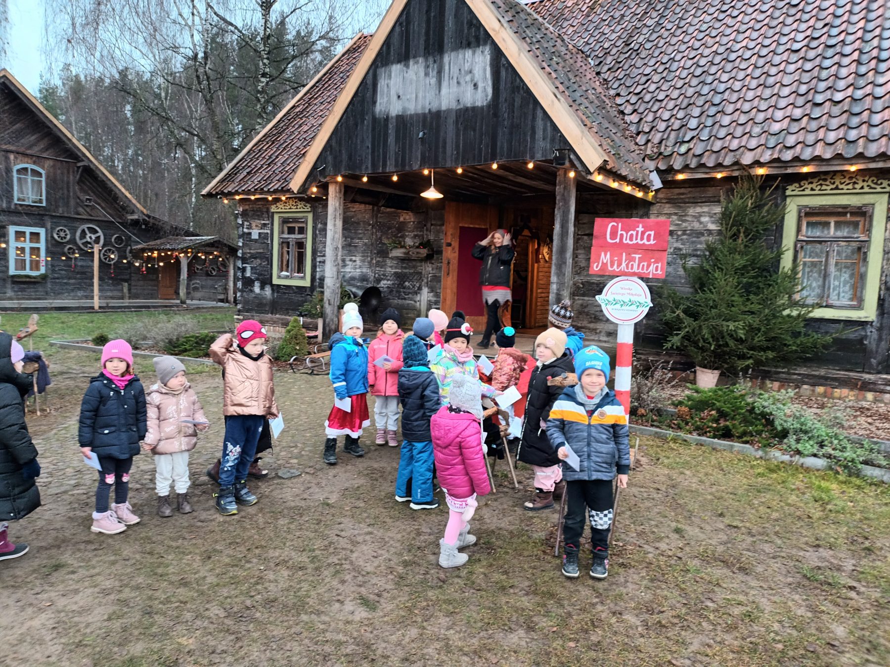Dzieci z Grupy V odwiedziły Wioskę Świętego Mikołaja. Była to wizyta w Świątecznej Krainie pełnej niespodzianek w „Majątku Howieny” w Pomigaczach koło Białegostoku gdzie czekały na przedszkolaki wyjątkowe atrakcje. Spotkanie z Mikołajem w okresie przedświątecznym było dla dzieci dużą niespodzianką. Przedszkolaki mogły narysować listy do Św. Mikołaja, Atrakcją była też wizyta w mikołajowej poczcie. Dzieci odwiedziły też jego chatkę, a sam Mikołaj wręczył dzieciom certyfikaty. Dzieci wałkowały tam ciasto i lepiły z niego pierniki, bawiły się z Elfami i odwiedziły żywą szopkę. Podczas odwiedzin w Wiosce Świętego Mikołaja dzieci mogły poczuć magię zbliżających się Świąt! W programie czekało na dzieci wiele atrakcji, w tym warsztaty z Elfami oraz czas spędzony z Mikołajem. Możliwość zwiedzenia jego chaty oraz wizyta w Świątecznej Krainie pełnej niespodzianek!