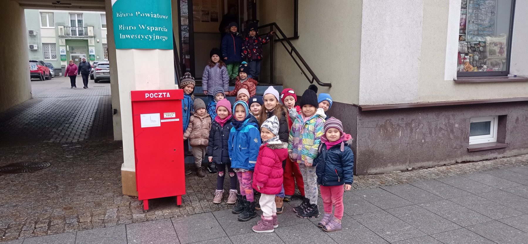Grupa 5 wybrała się do urzędu pocztowego przy ulicy Lipowej. Wizyta na poczcie to świetna lekcja praktyczna, podczas której dzieci poznają instytucję poczty, pracę listonosza i urzędników, widzą, jak list i paczka pokonują drogę od nadawcy do odbiorcy, sortowanie przesyłek i stemplowanie. Dzieci wysłały również pocztówkę świąteczną.