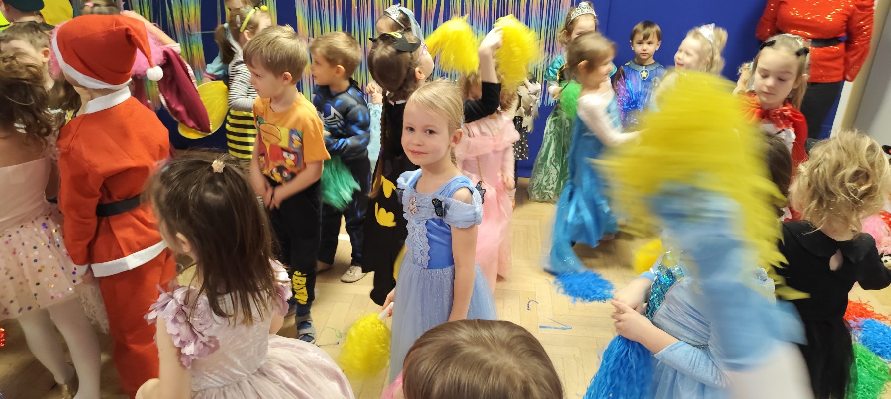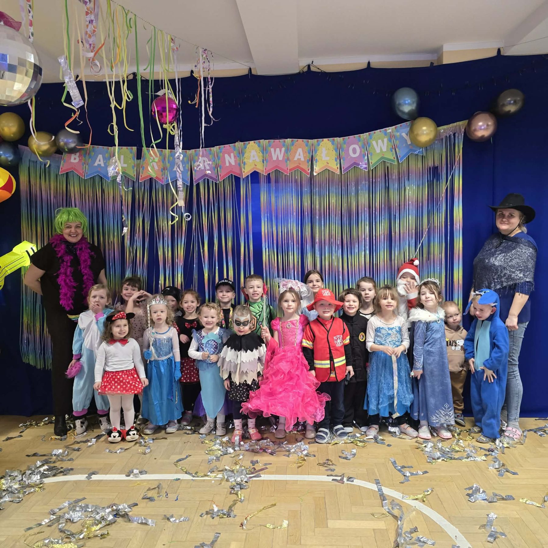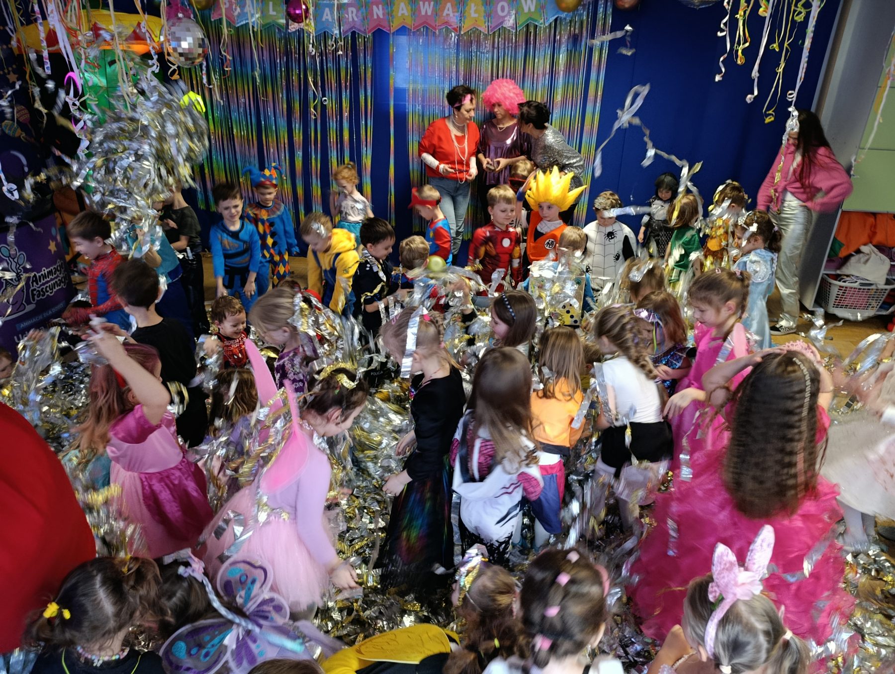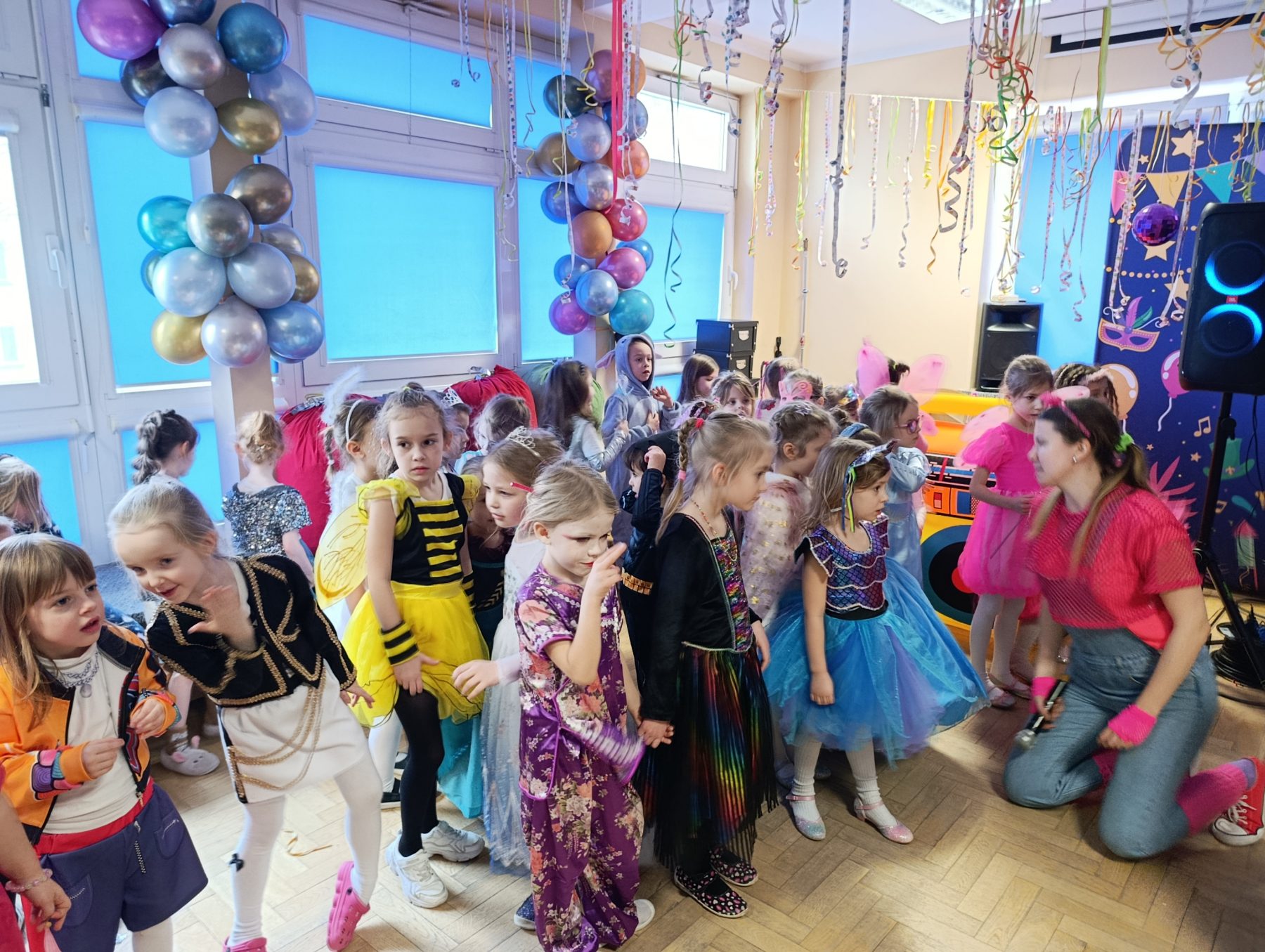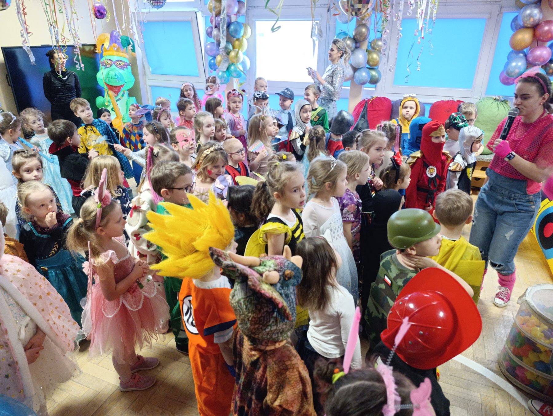 Bal karnawałowy w naszym przedszkolu to prawdziwa feeria kolorów, muzyki i dziecięcej radości! Tego wyjątkowego dnia sale zamieniają się w bajkową krainę pełną księżniczek, superbohaterów, zwierzątek i magicznych postaci. Przy dźwiękach wesołej muzyki dzieci tańczą, śmieją się i biorą udział w radosnych konkursach oraz zabawach ruchowych. W powietrzu wirują kolorowe serpentyny, konfetti i balony, tworząc atmosferę prawdziwej karnawałowej magii. To czas beztroskiej zabawy, rozwijania wyobraźni i wspólnego świętowania, który na długo pozostaje w dziecięcych wspomnieniach.