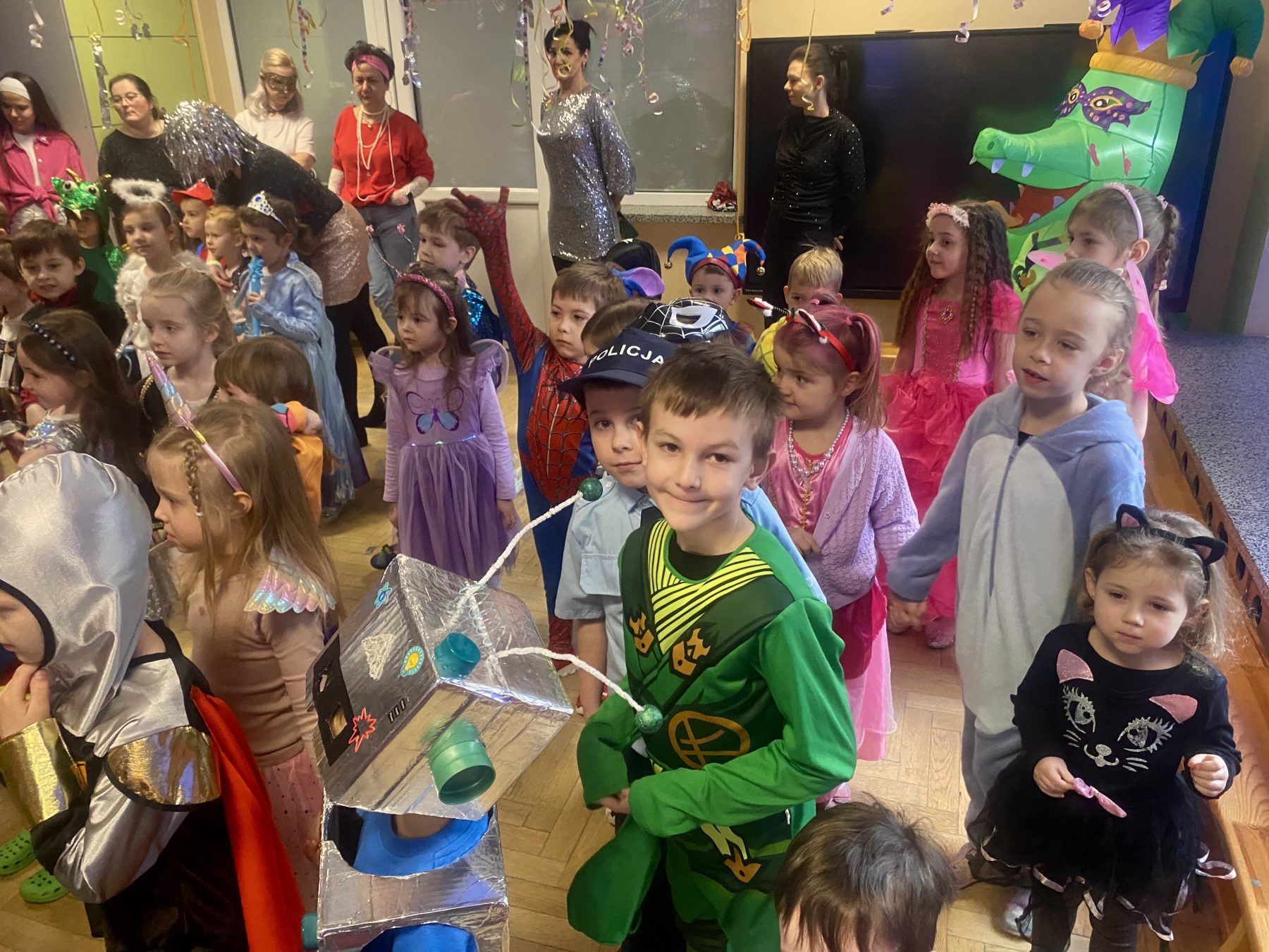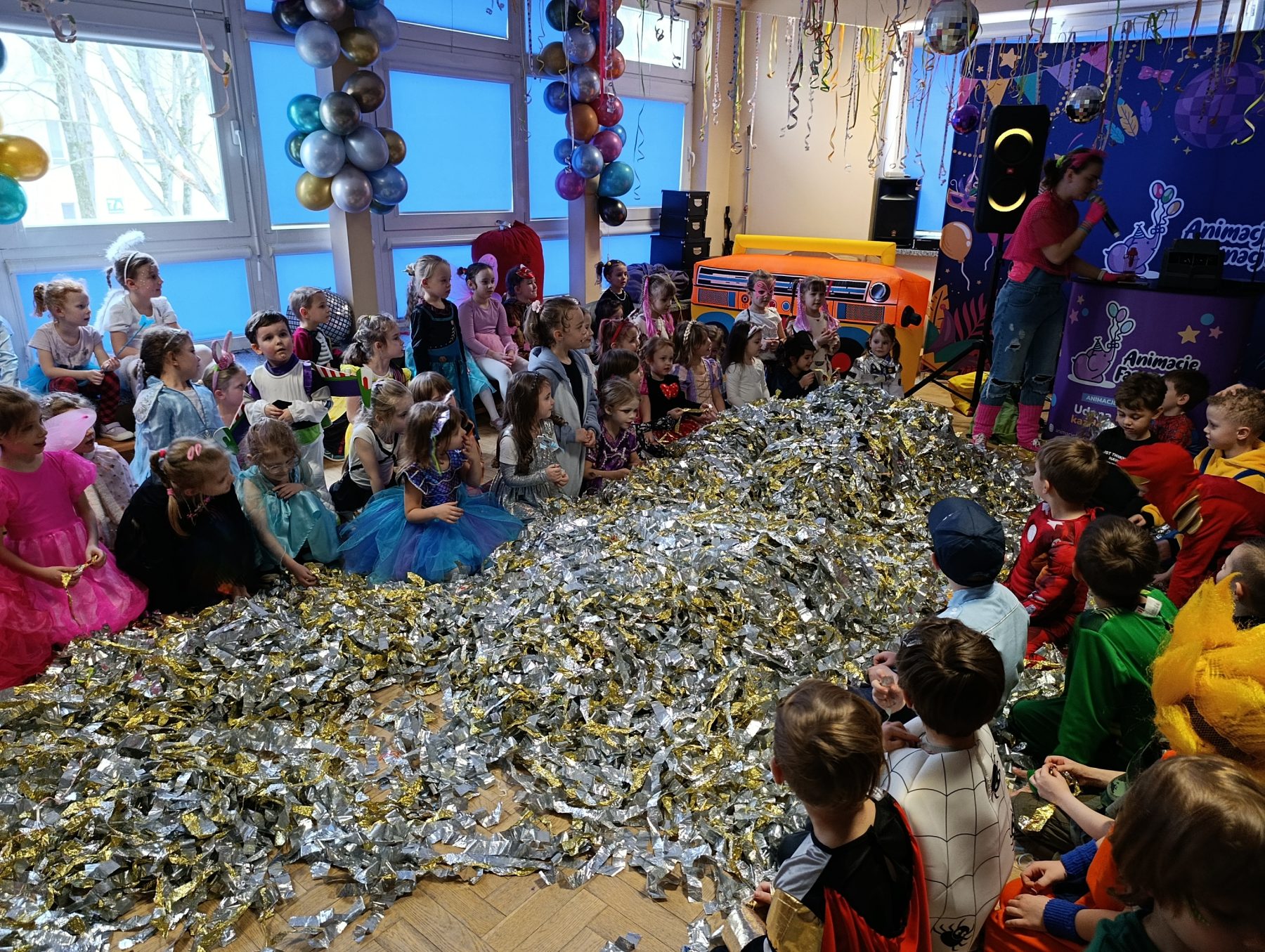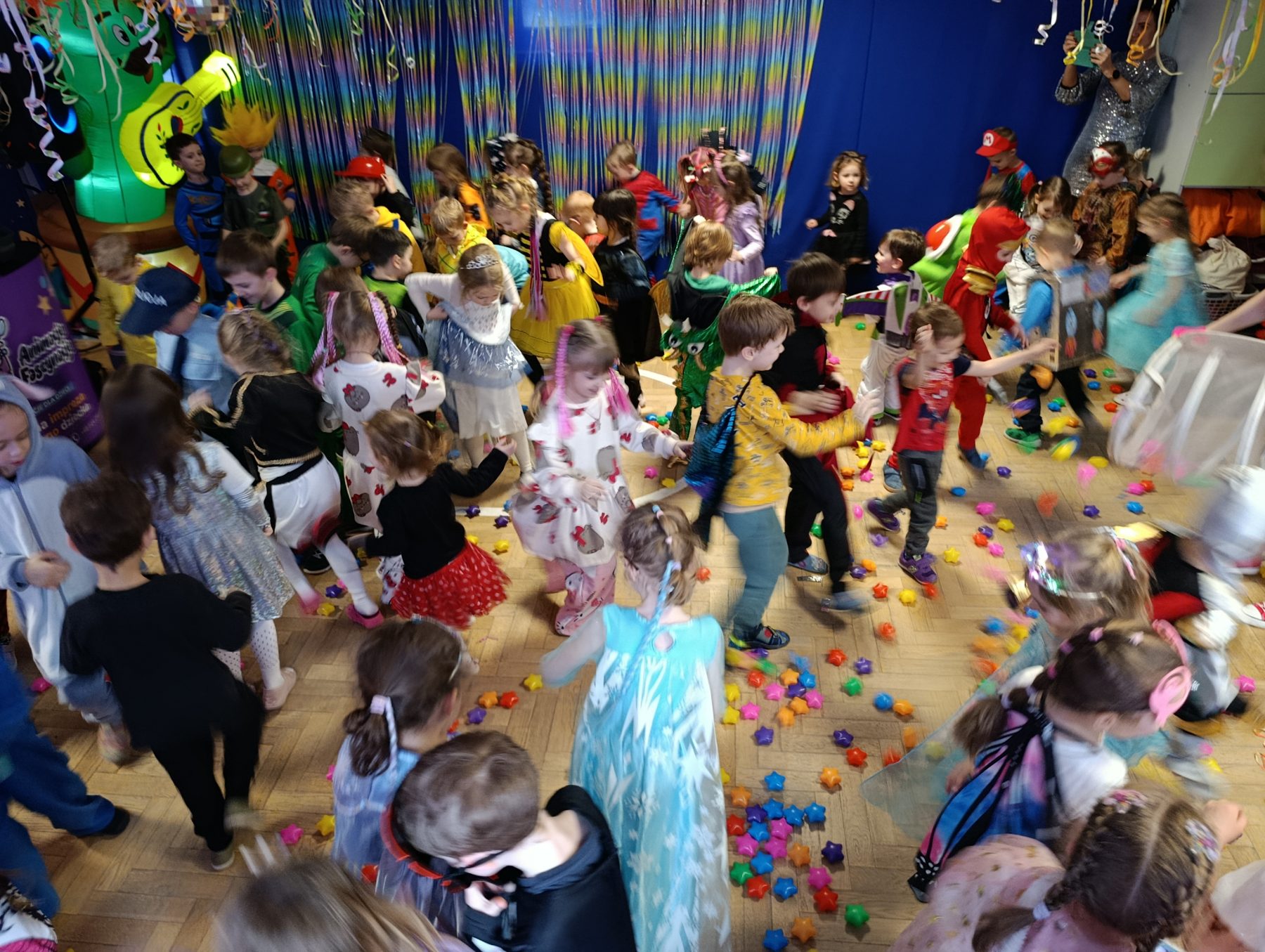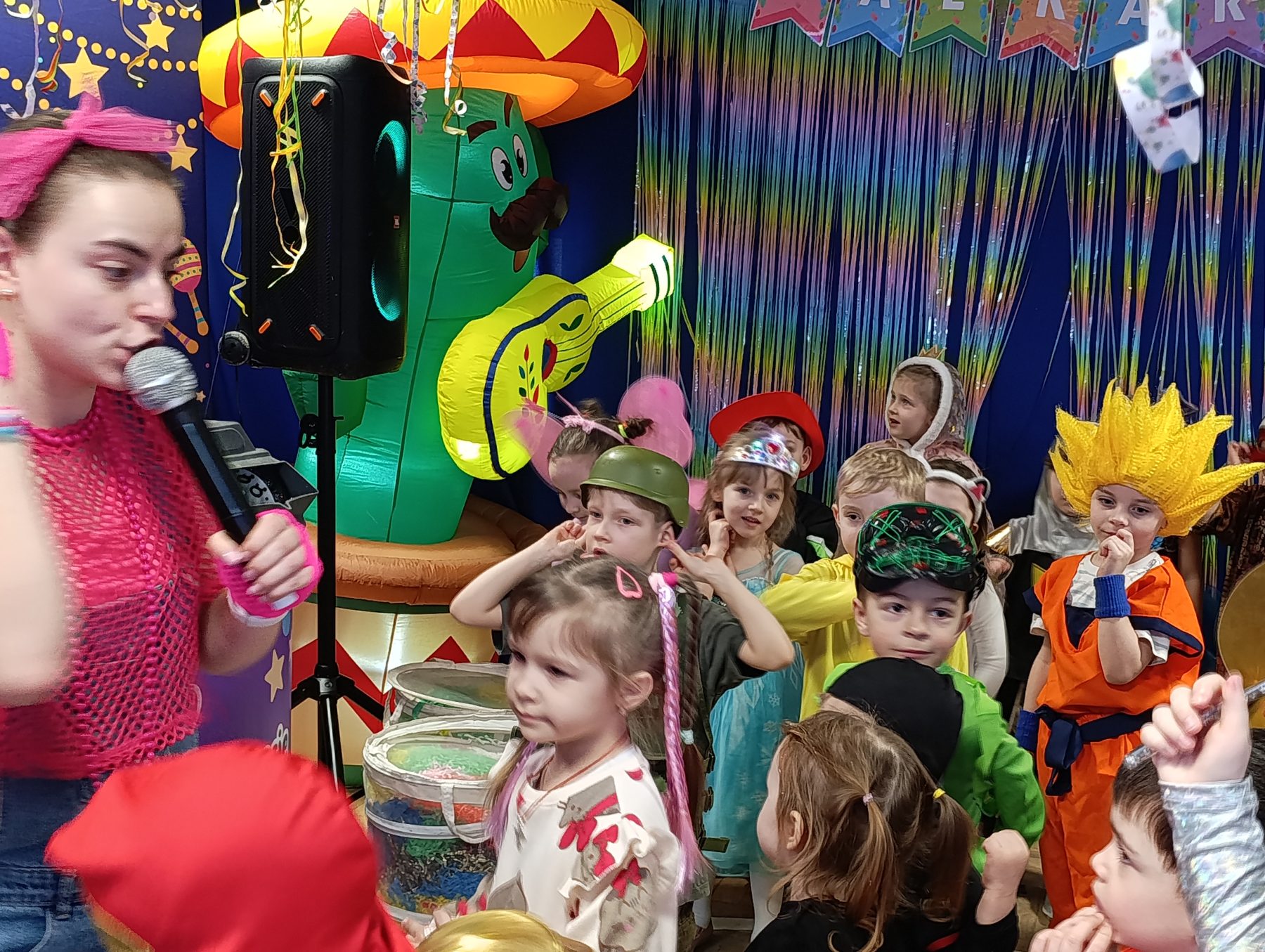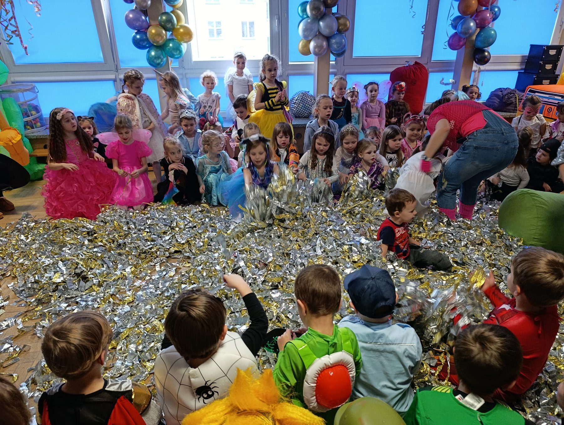 Bal karnawałowy w naszym przedszkolu to prawdziwa feeria kolorów, muzyki i dziecięcej radości! Tego wyjątkowego dnia sale zamieniają się w bajkową krainę pełną księżniczek, superbohaterów, zwierzątek i magicznych postaci. Przy dźwiękach wesołej muzyki dzieci tańczą, śmieją się i biorą udział w radosnych konkursach oraz zabawach ruchowych. W powietrzu wirują kolorowe serpentyny, konfetti i balony, tworząc atmosferę prawdziwej karnawałowej magii. To czas beztroskiej zabawy, rozwijania wyobraźni i wspólnego świętowania, który na długo pozostaje w dziecięcych wspomnieniach.