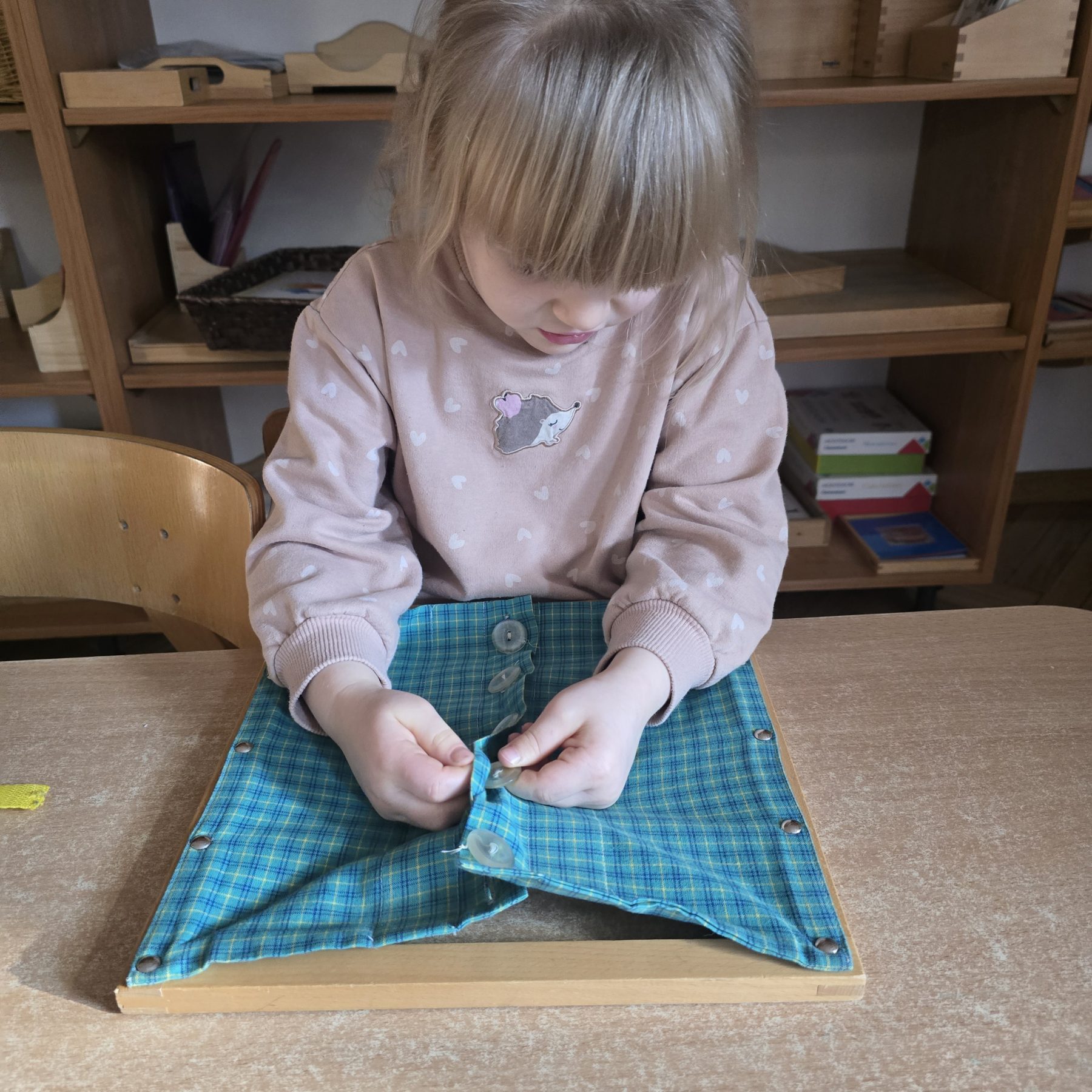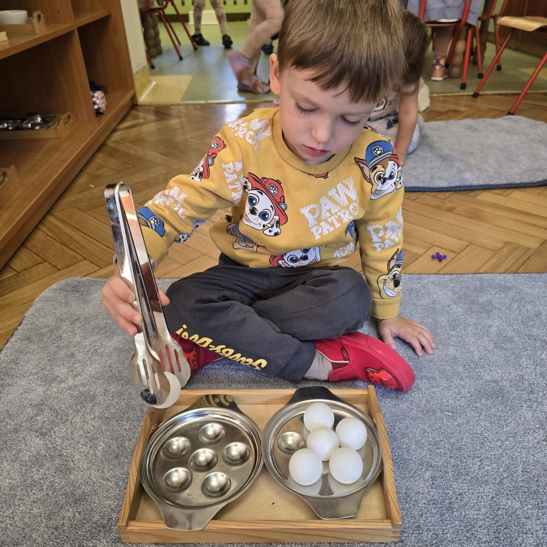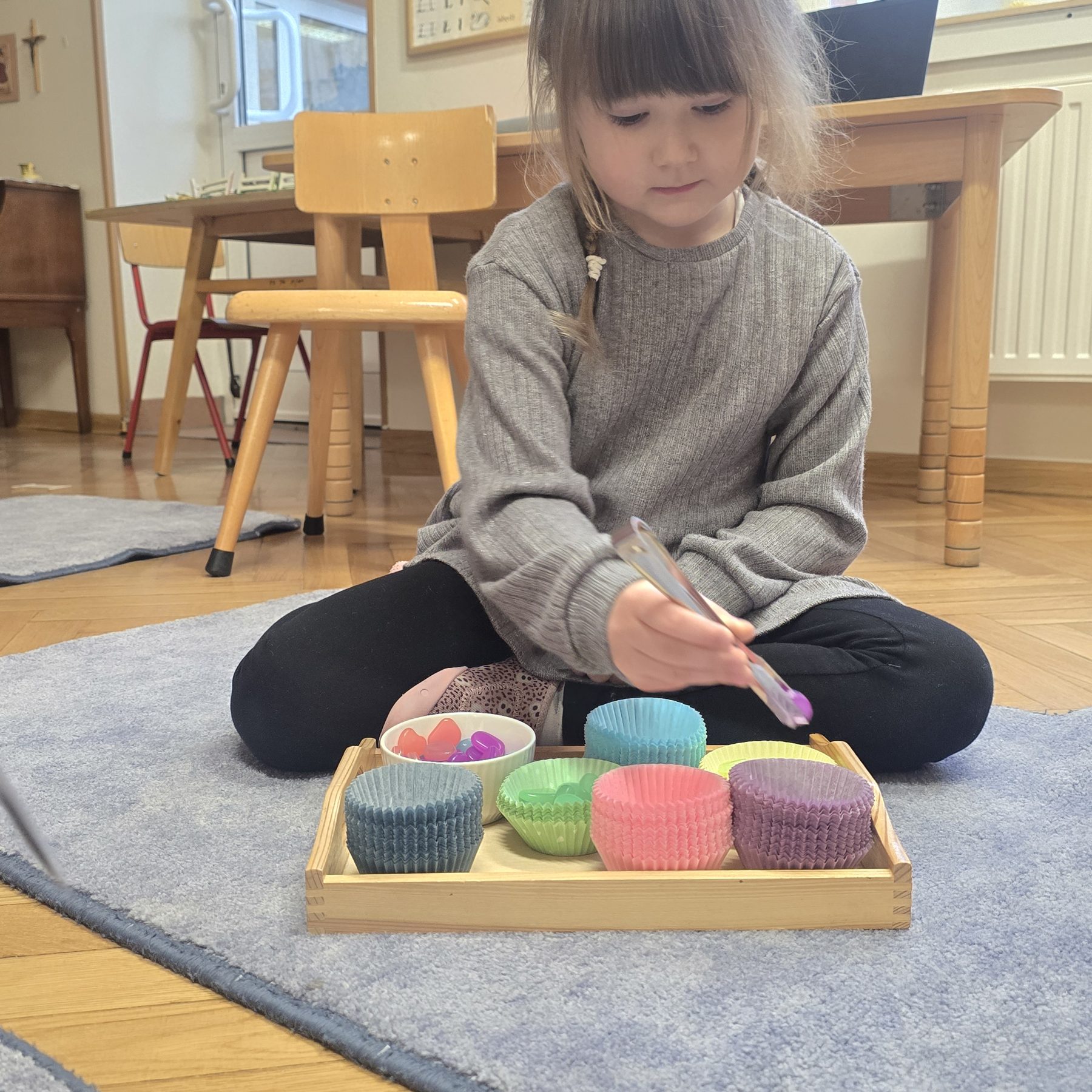 Praca własna to czas, w którym dzieci samodzielnie wybierają materiał i aktywność, pracują w swoim tempie oraz rozwijają zainteresowania zgodnie z indywidualnymi potrzebami. W specjalnie przygotowanym otoczeniu uczą się koncentracji, wytrwałości oraz odpowiedzialności za podjęte zadanie. Dzięki pracy własnej dzieci rozwijają samodzielność, wiarę we własne możliwości oraz wewnętrzną motywację do nauki. Uczą się planowania, podejmowania decyzji i doprowadzania rozpoczętych działań do końca. To fundament budowania pewności siebie, kompetencji społecznych oraz radości z odkrywania świata.