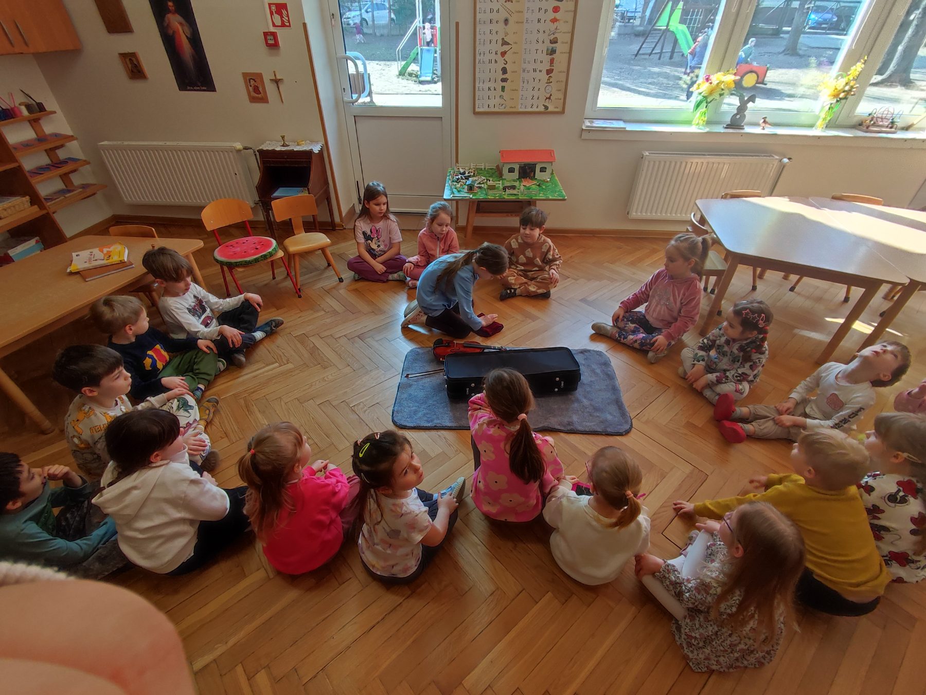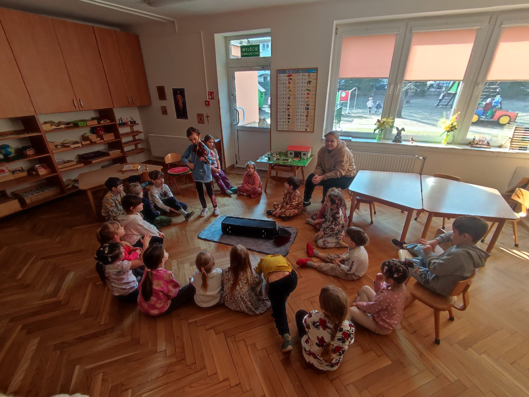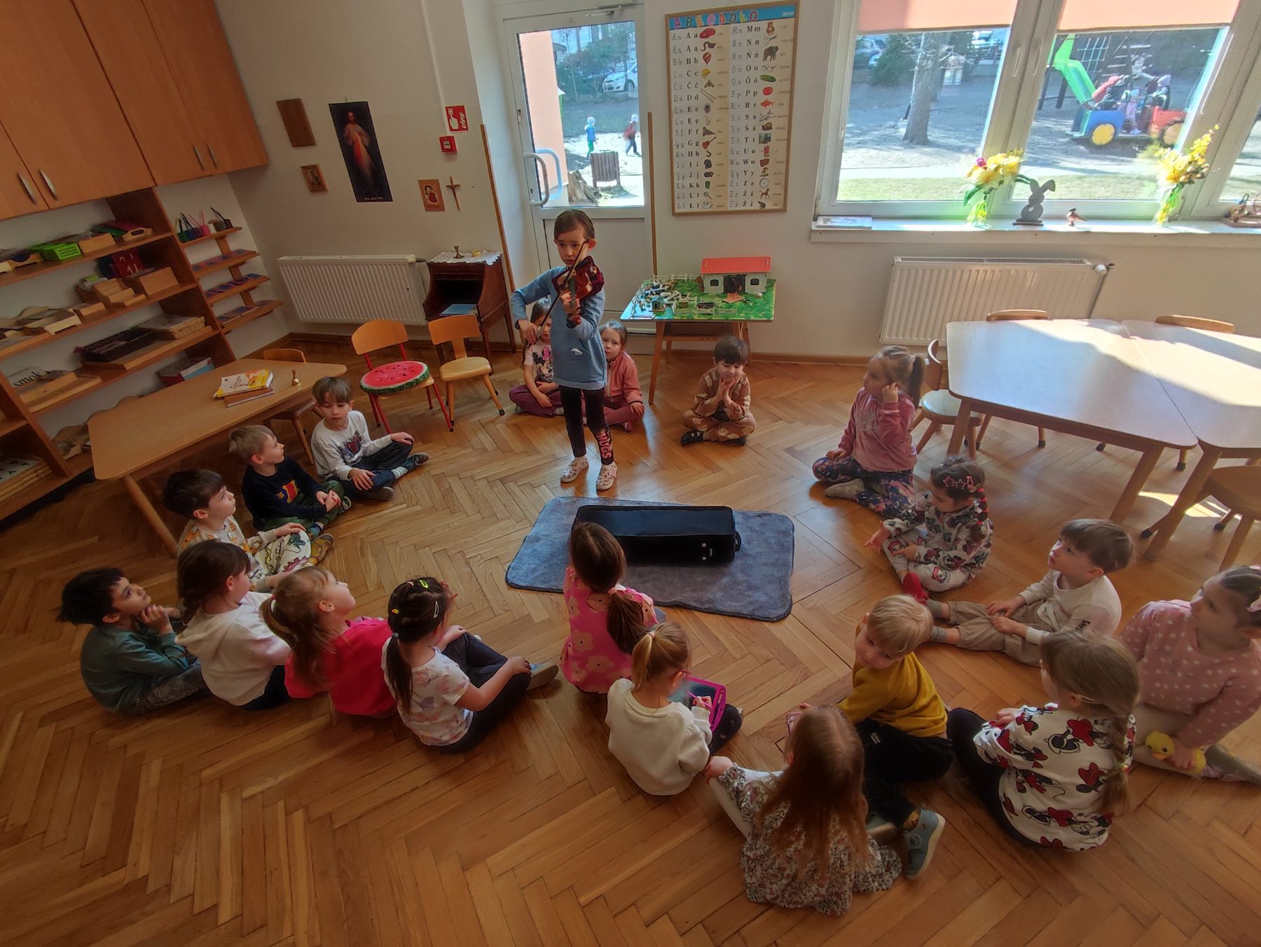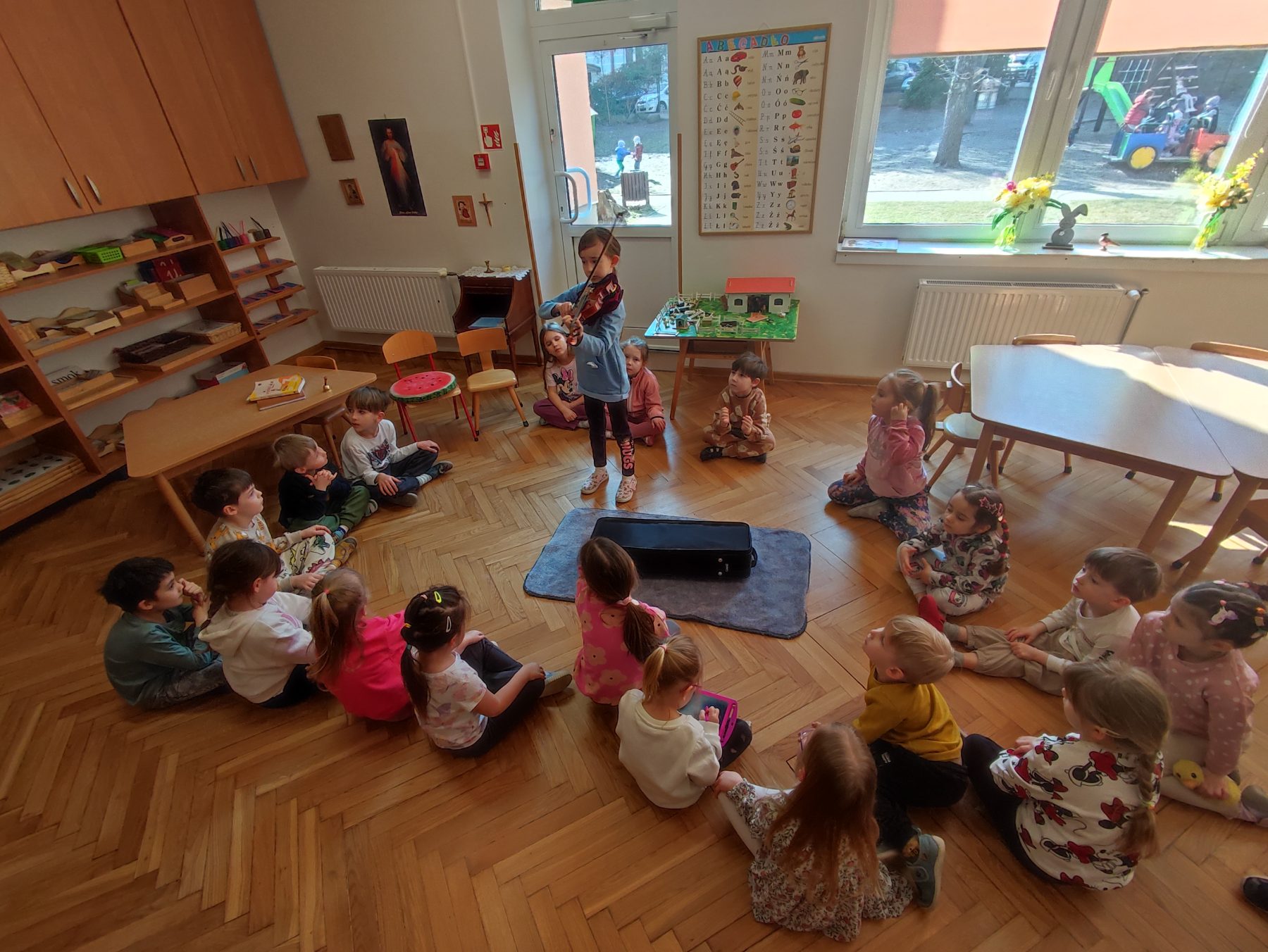 W czwartej grupie mieliśmy dziś wyjątkowe wydarzenie – Pola, która ćwiczy grę na skrzypcach, przyniosła do przedszkola swój instrument. Dziewczynka zaprezentowała dzieciom zawartość futerału, opowiadając o skrzypcach oraz pokazując m.in. smyczek i kalafonię, której używa się do nacierania smyczka. Pola z odwagą wystąpiła przed kolegami i koleżankami, dzieląc się swoją pasją do muzyki. Jesteśmy bardzo dumni, że w naszej grupie mamy tak zdolną i utalentowaną dziewczynkę.