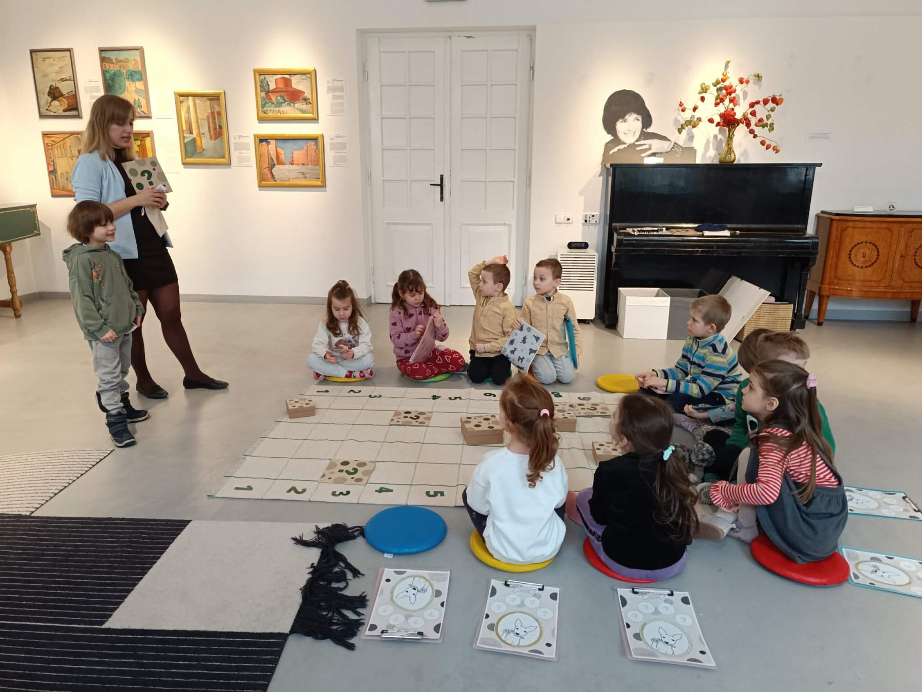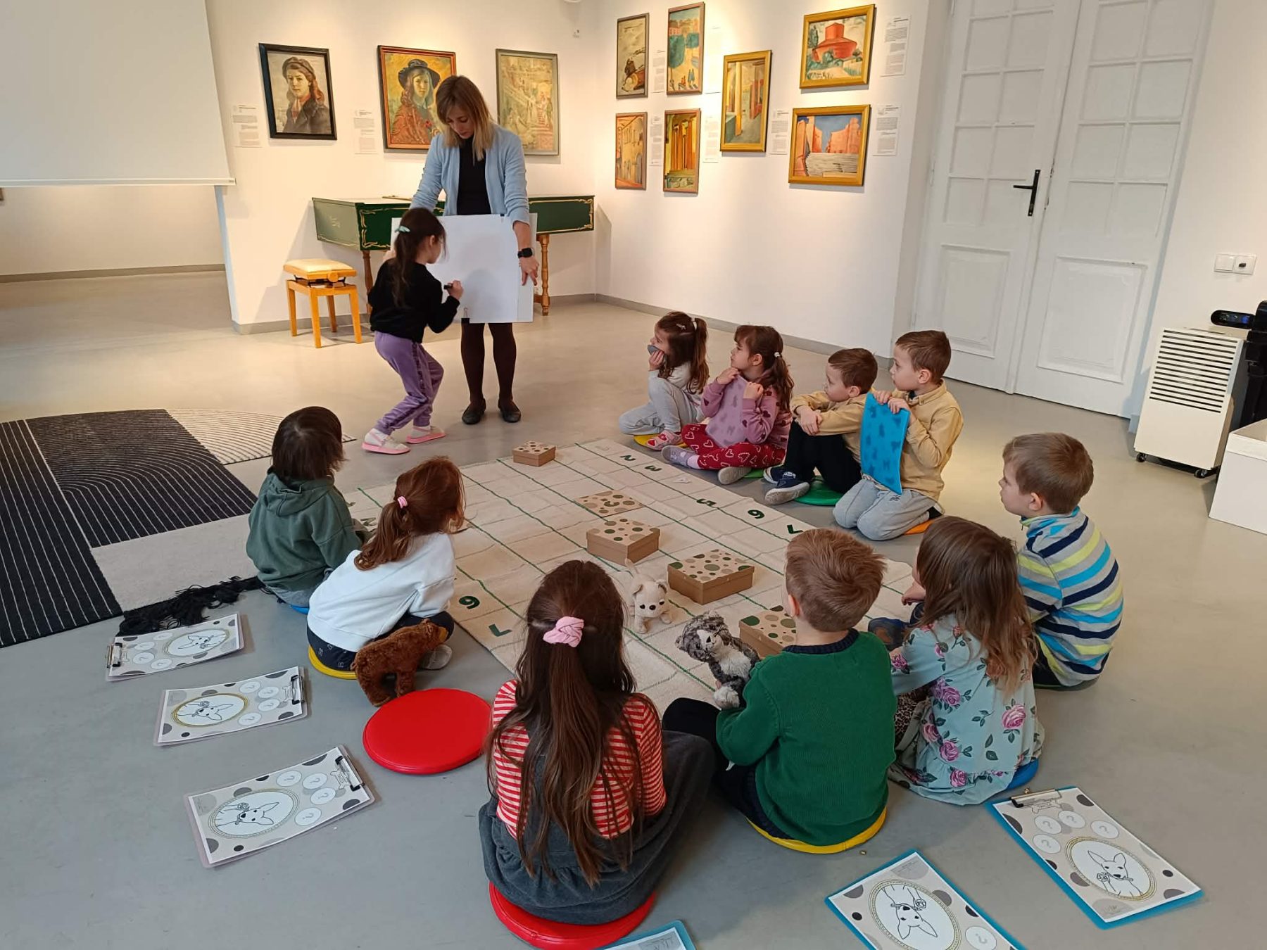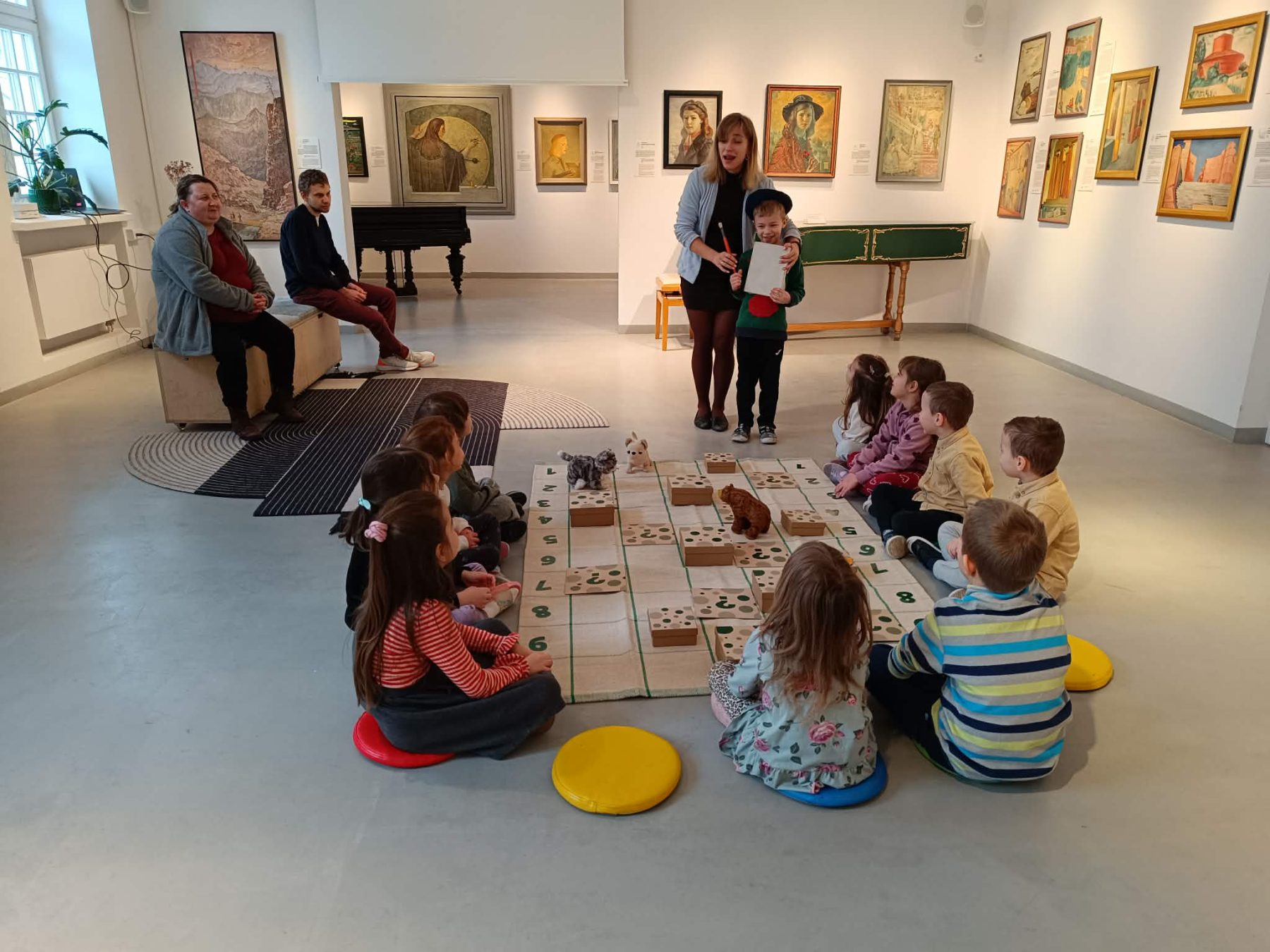 To było wyjątkowe spotkanie, podczas którego przestrzeń wystawowa stała się polem do gry! Na uczestników czekały zadania i łamigłówki wprowadzające w świat sztuki. Dzięki nim dzieci poznały bliżej rodzinę Sleńdzińskich i ich zwierzęta, w szczególności ulubionego pupila malarza – ratlerka o imieniu Tańcia. Dzieci zdobyły także wiedzę na temat warsztatu pracy artysty i różnych dziedzin sztuki. Czy Tańcia dotrze do mety? To wszystko w rękach uczestników! Powodzenia! Brawo ! Udało się!