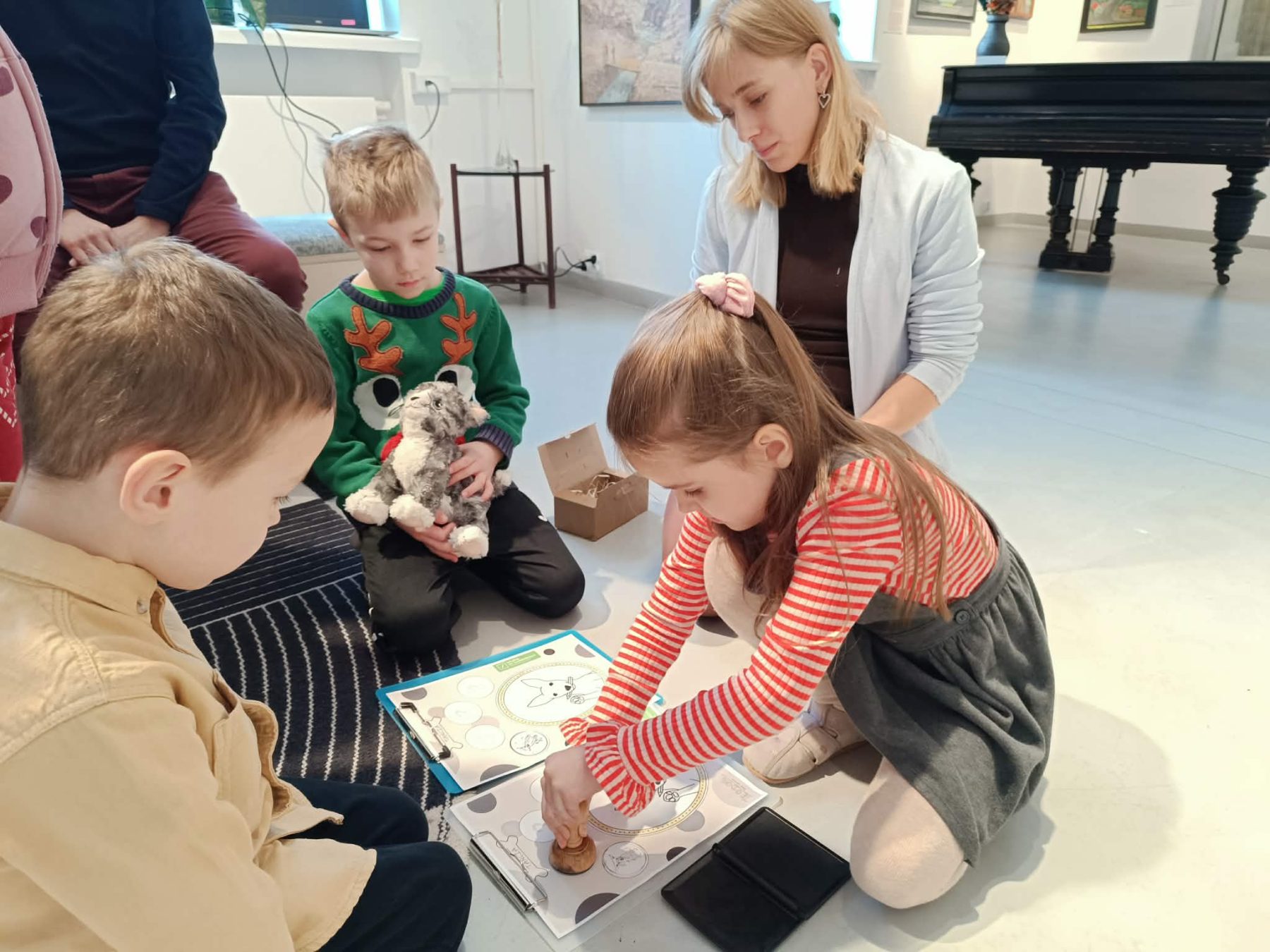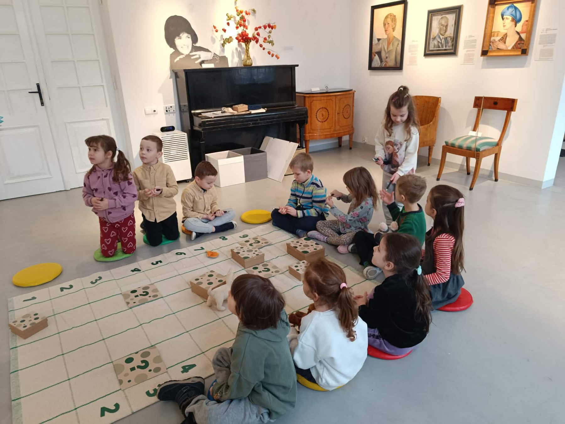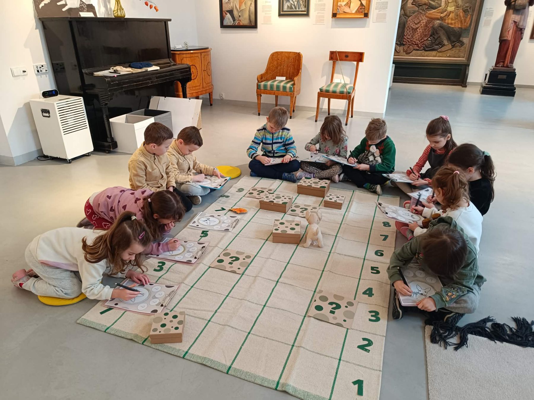 To było wyjątkowe spotkanie, podczas którego przestrzeń wystawowa stała się polem do gry! Na uczestników czekały zadania i łamigłówki wprowadzające w świat sztuki. Dzięki nim dzieci poznały bliżej rodzinę Sleńdzińskich i ich zwierzęta, w szczególności ulubionego pupila malarza – ratlerka o imieniu Tańcia. Dzieci zdobyły także wiedzę na temat warsztatu pracy artysty i różnych dziedzin sztuki. Czy Tańcia dotrze do mety? To wszystko w rękach uczestników! Powodzenia! Brawo ! Udało się!