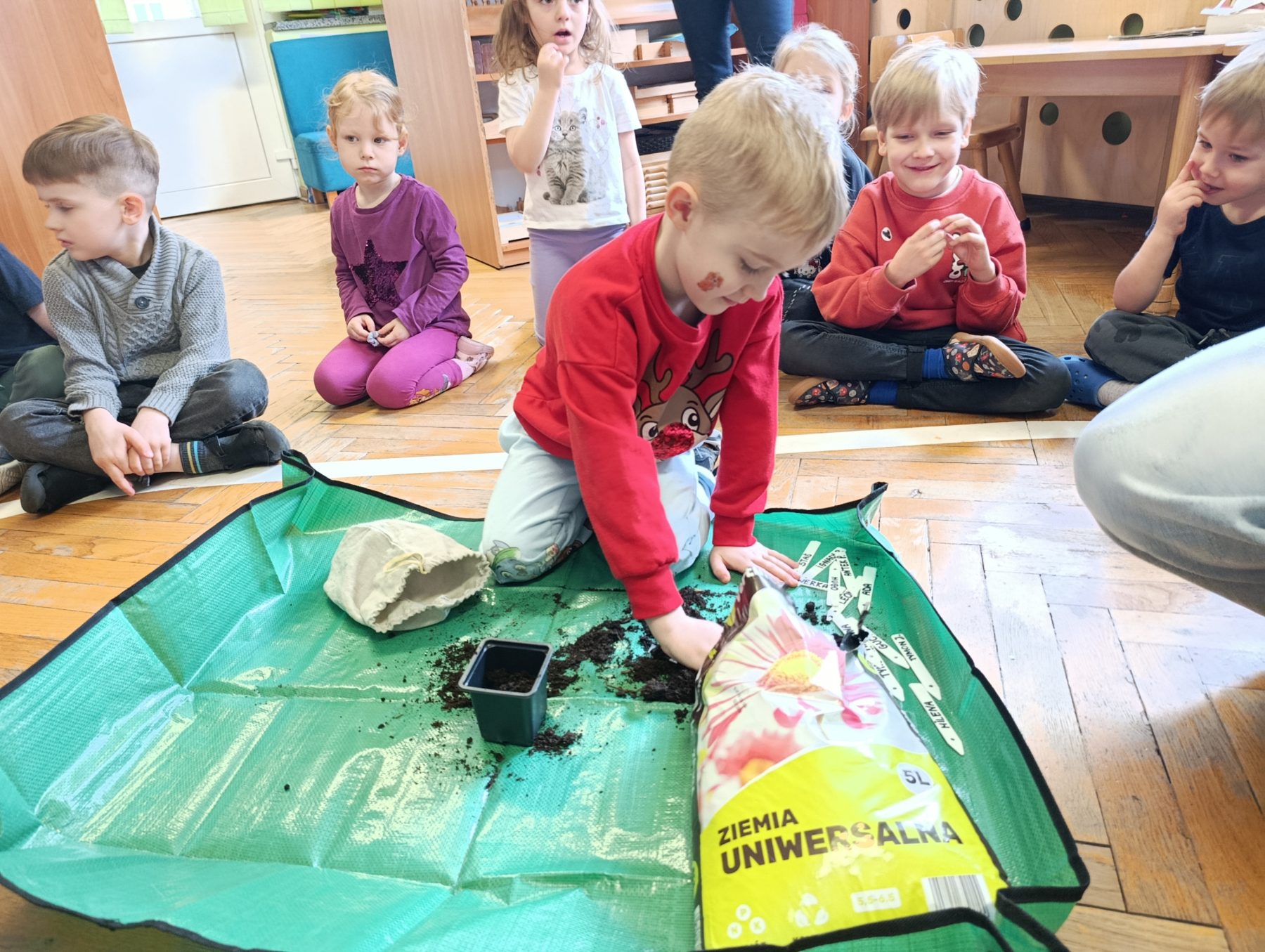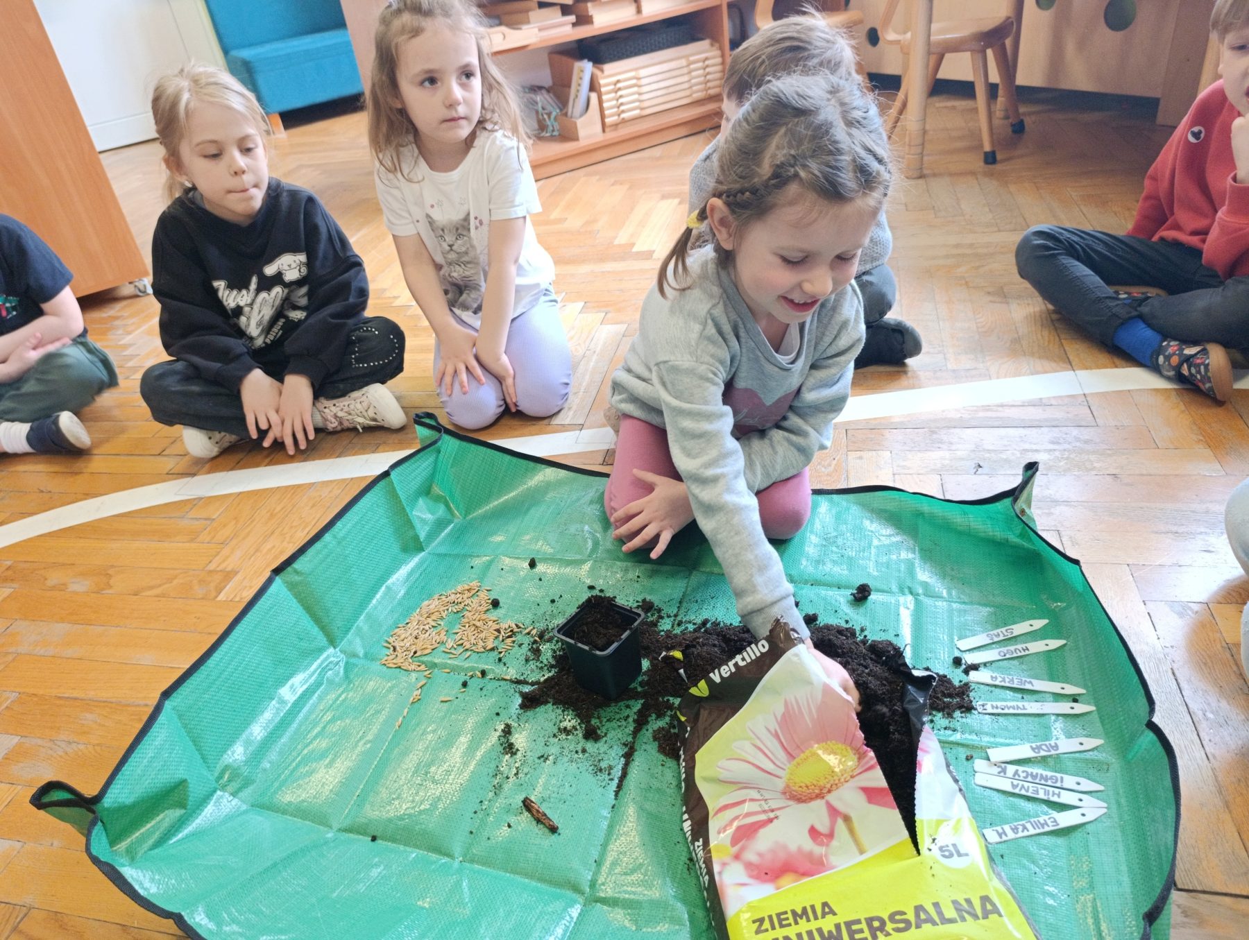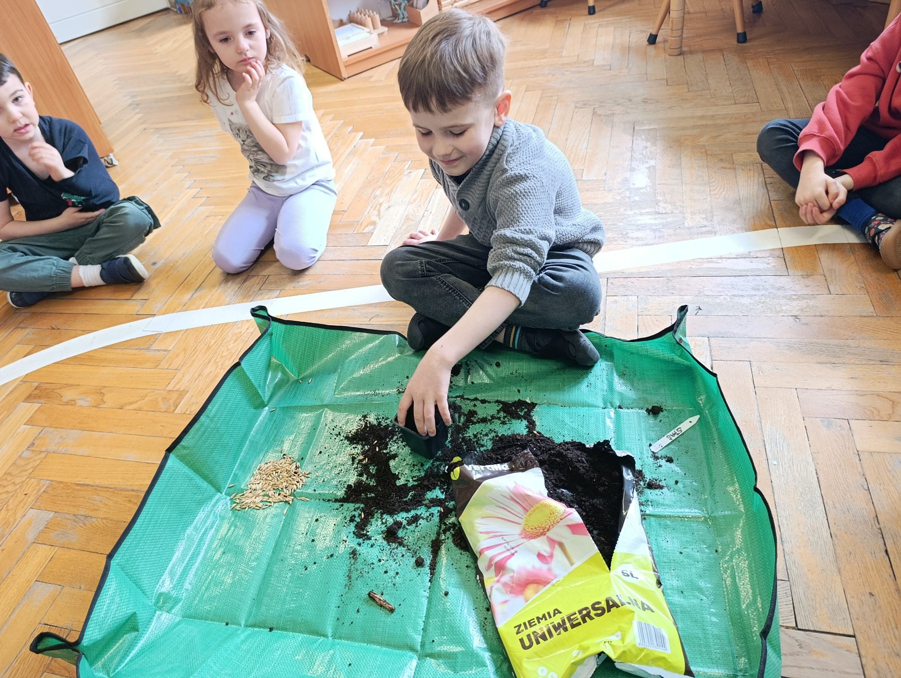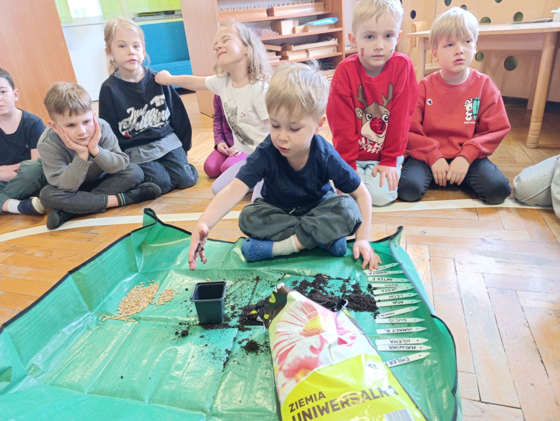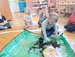 W dniu dzisiejszym w naszym przedszkolu odbyły się zajęcia przyrodnicze, podczas których dzieci miały okazję samodzielnie wysiać owies. Każde dziecko otrzymało swoją doniczkę, ziemię oraz nasiona, dzięki czemu mogło krok po kroku poznać proces sadzenia roślin.