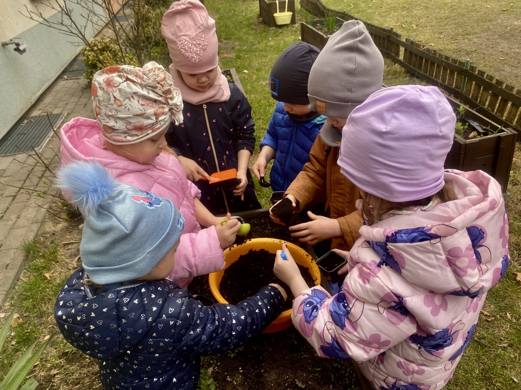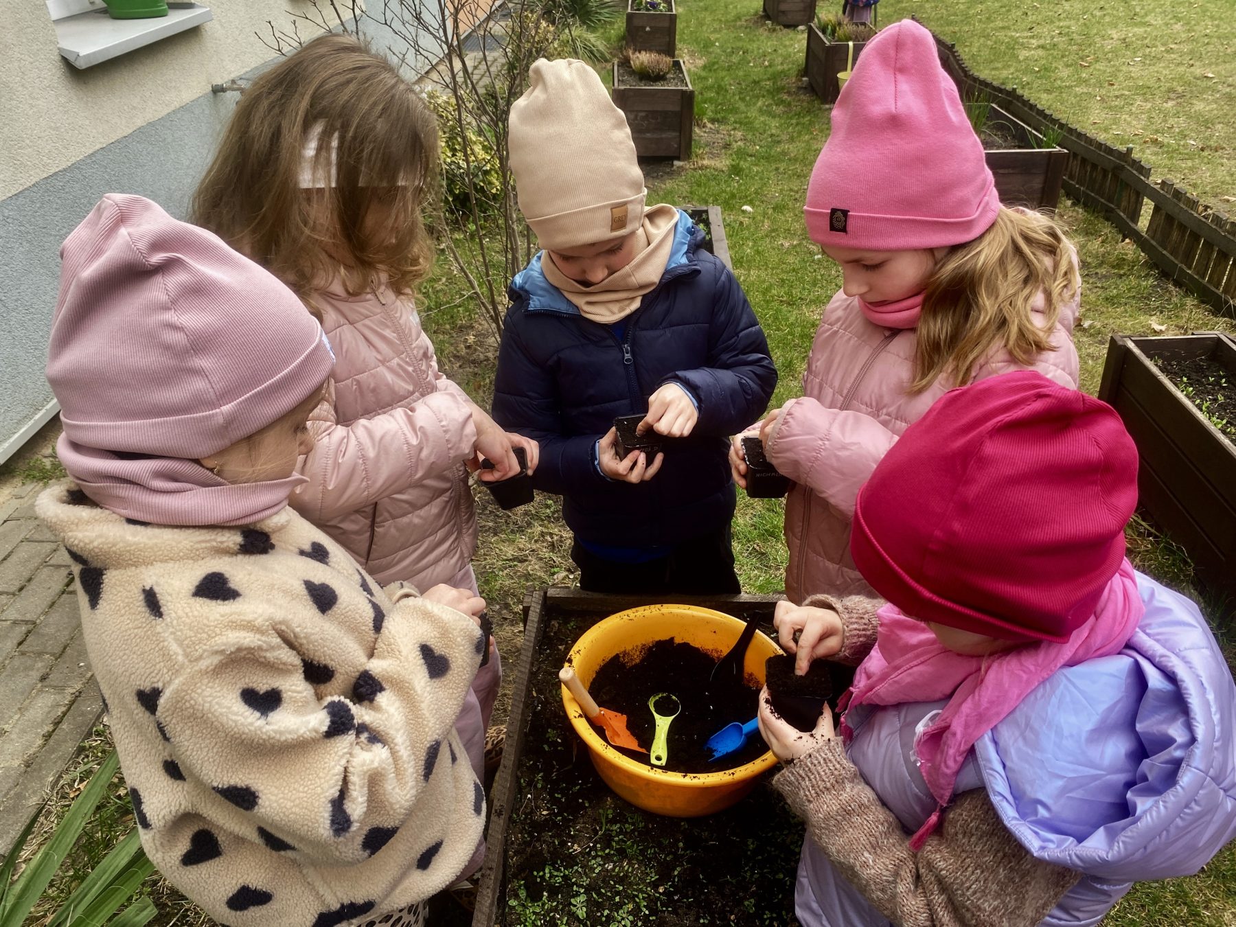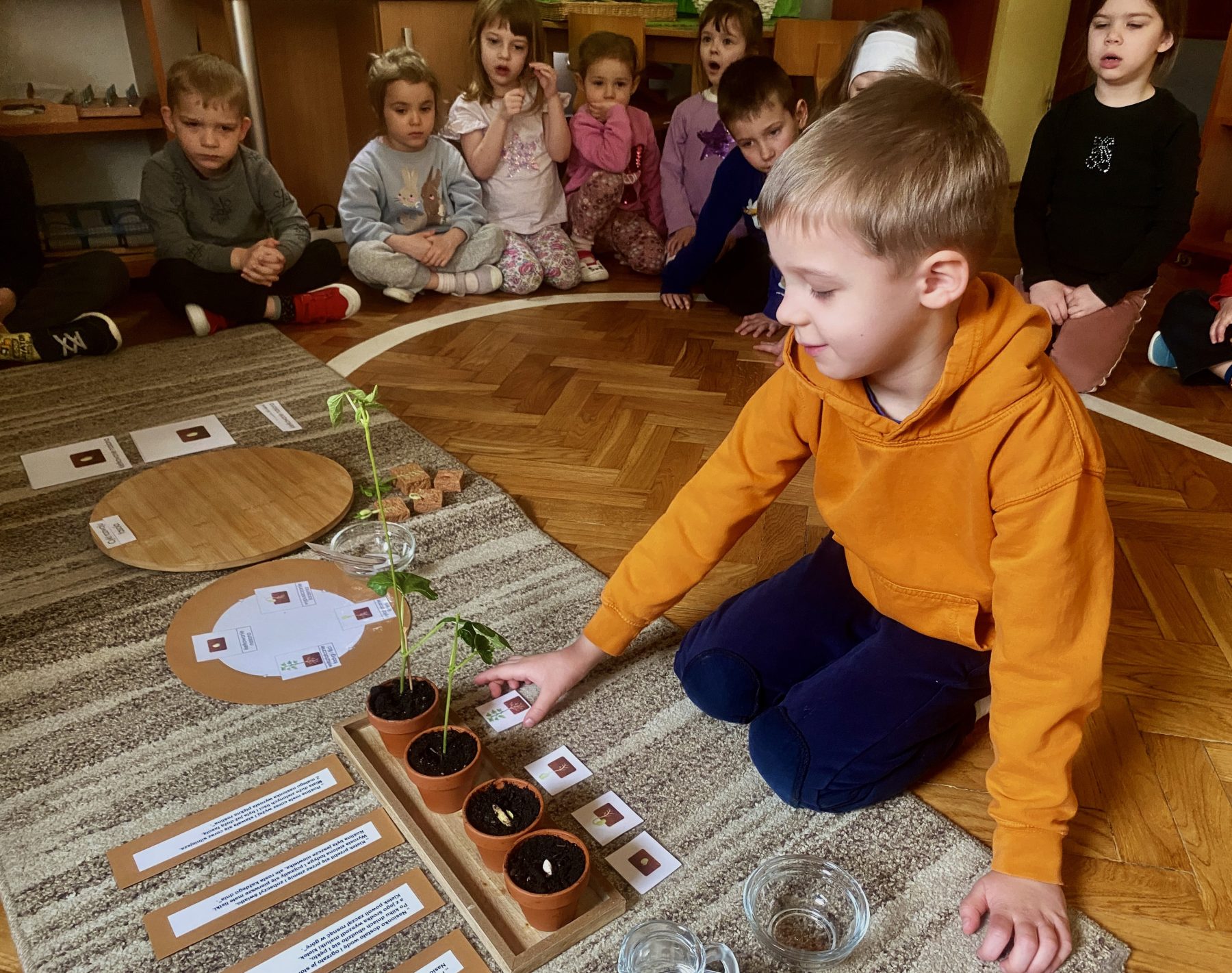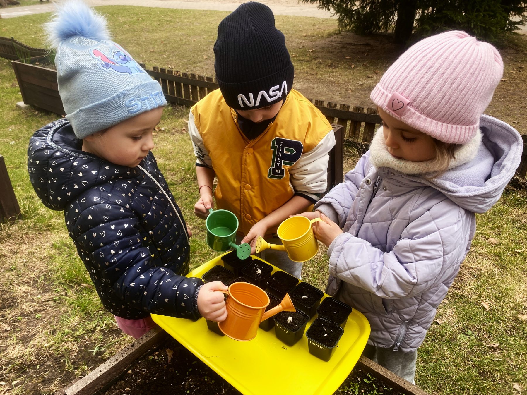 Podczas zajęć w przedszkolu dzieci dowiedziały się na czym polega praca ogrodnika. Oglądały ilustracje i opisywały, czym się zajmuje oraz jakie ma obowiązki. Poznały narzędzia ogrodnicze i dowiedziały się, do czego służą. Następnie przedszkolaki zapoznały się z etapami rozwoju fasoli – od nasionka, przez kiełkowanie, aż po roślinę z listkami. Na zakończenie każde dziecko posadziło własną fasolę oraz podlało ją wodą, aby mogła rosnąć.