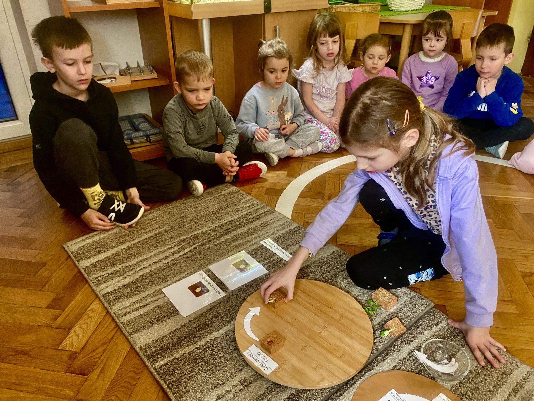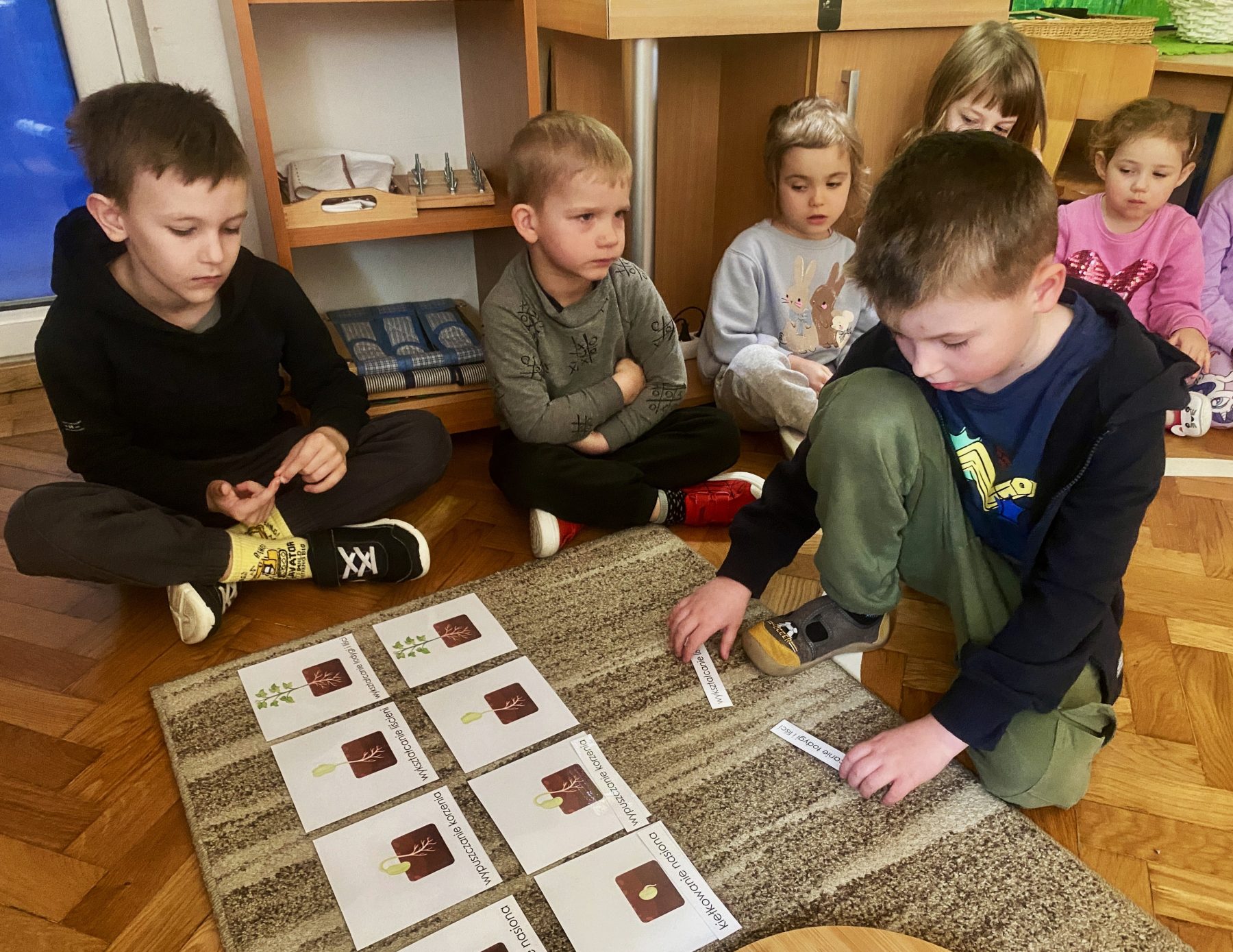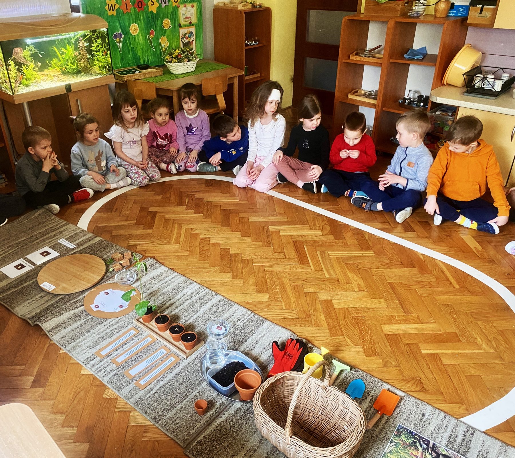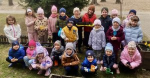 Podczas zajęć w przedszkolu dzieci dowiedziały się na czym polega praca ogrodnika. Oglądały ilustracje i opisywały, czym się zajmuje oraz jakie ma obowiązki. Poznały narzędzia ogrodnicze i dowiedziały się, do czego służą. Następnie przedszkolaki zapoznały się z etapami rozwoju fasoli – od nasionka, przez kiełkowanie, aż po roślinę z listkami. Na zakończenie każde dziecko posadziło własną fasolę oraz podlało ją wodą, aby mogła rosnąć.