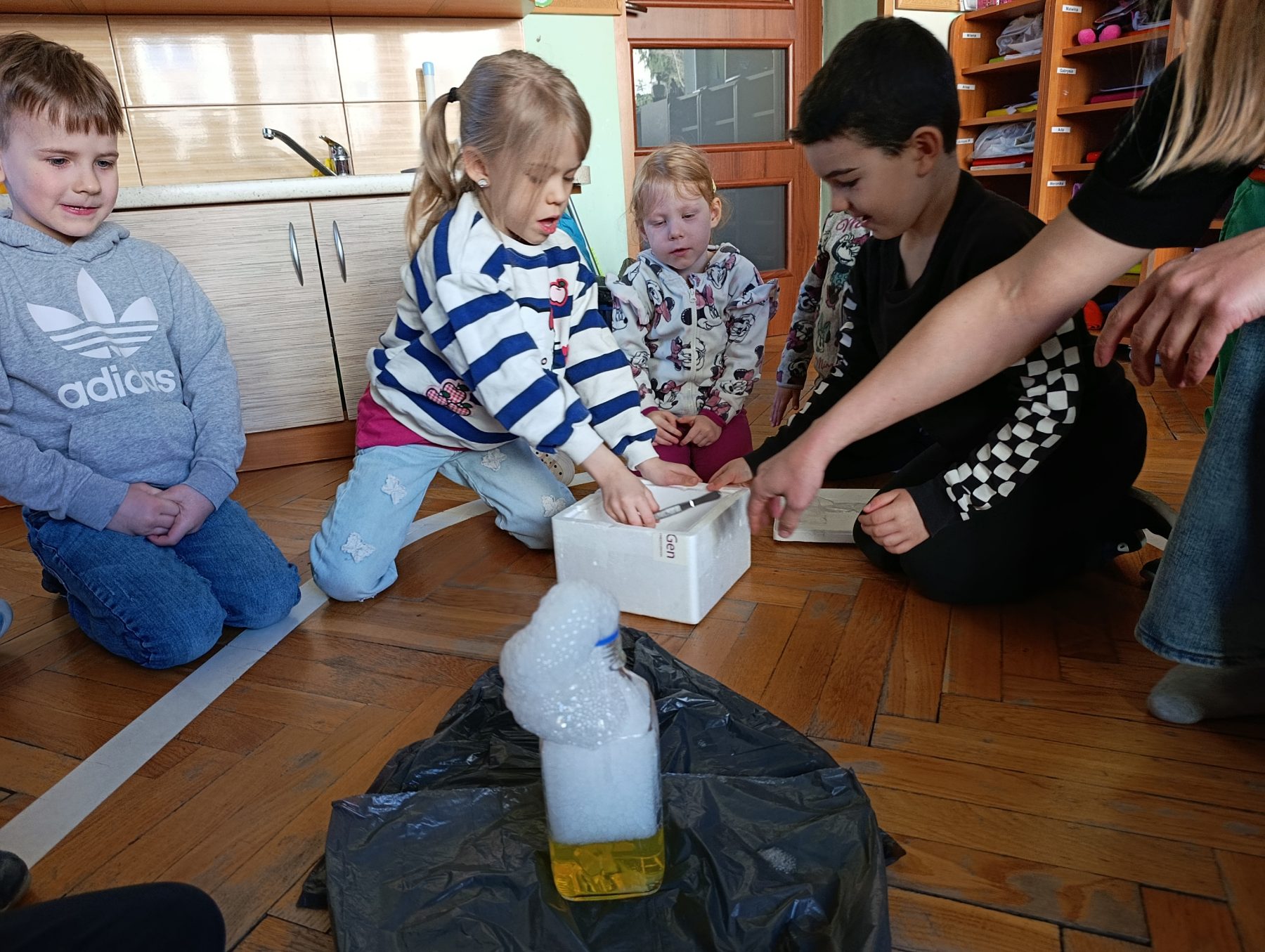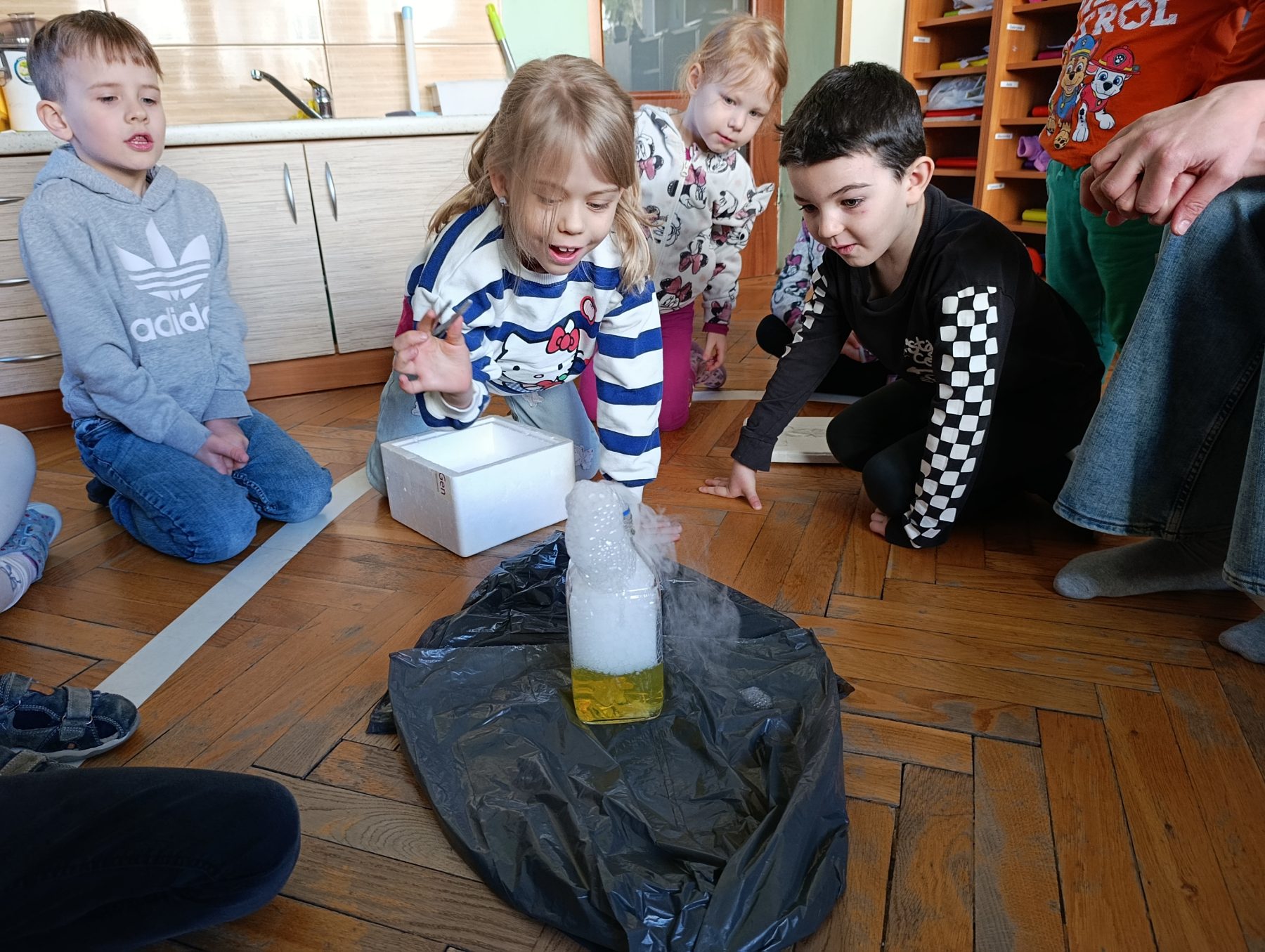 Mama Krzysia przygotowała dla dzieci niezwykłe zajęcia pełne ciekawych eksperymentów. Przedszkolaki miały okazję poczuć się jak mali naukowcy! Pierwszym doświadczeniem był eksperyment w słoiku. Do wody dodaliśmy błękit bromotymolowy, a następnie suchy lód. Dzieci z zaciekawieniem obserwowały, jak zmienia się kolor cieczy oraz jak powstaje tajemnicza mgła. Po dodaniu płynu do naczyń pojawiła się efektowna, pieniąca się reakcja, która wzbudziła wiele radości i zachwytu.