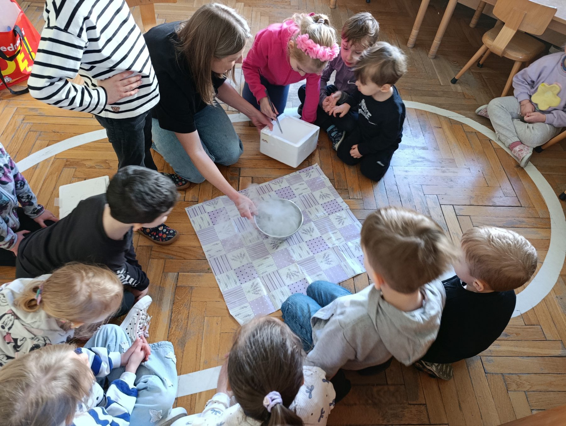 Kolejnym zadaniem było porównanie zwykłego lodu i suchego lodu. Dzieci sprawdzały, który z nich „znika” szybciej. Dzięki temu dowiedziały się, że suchy lód nie topnieje jak zwykły, lecz zamienia się bezpośrednio w gaz.