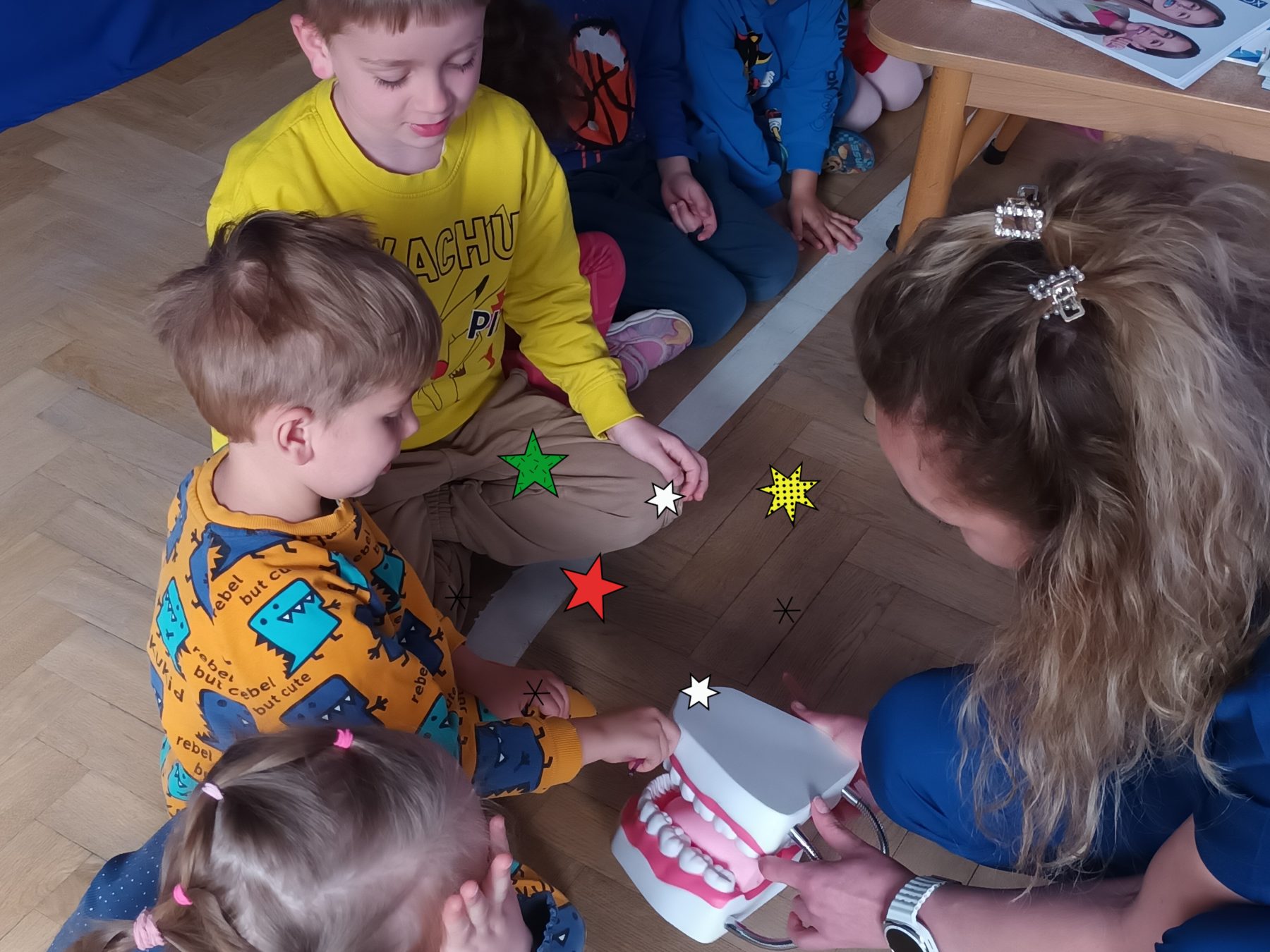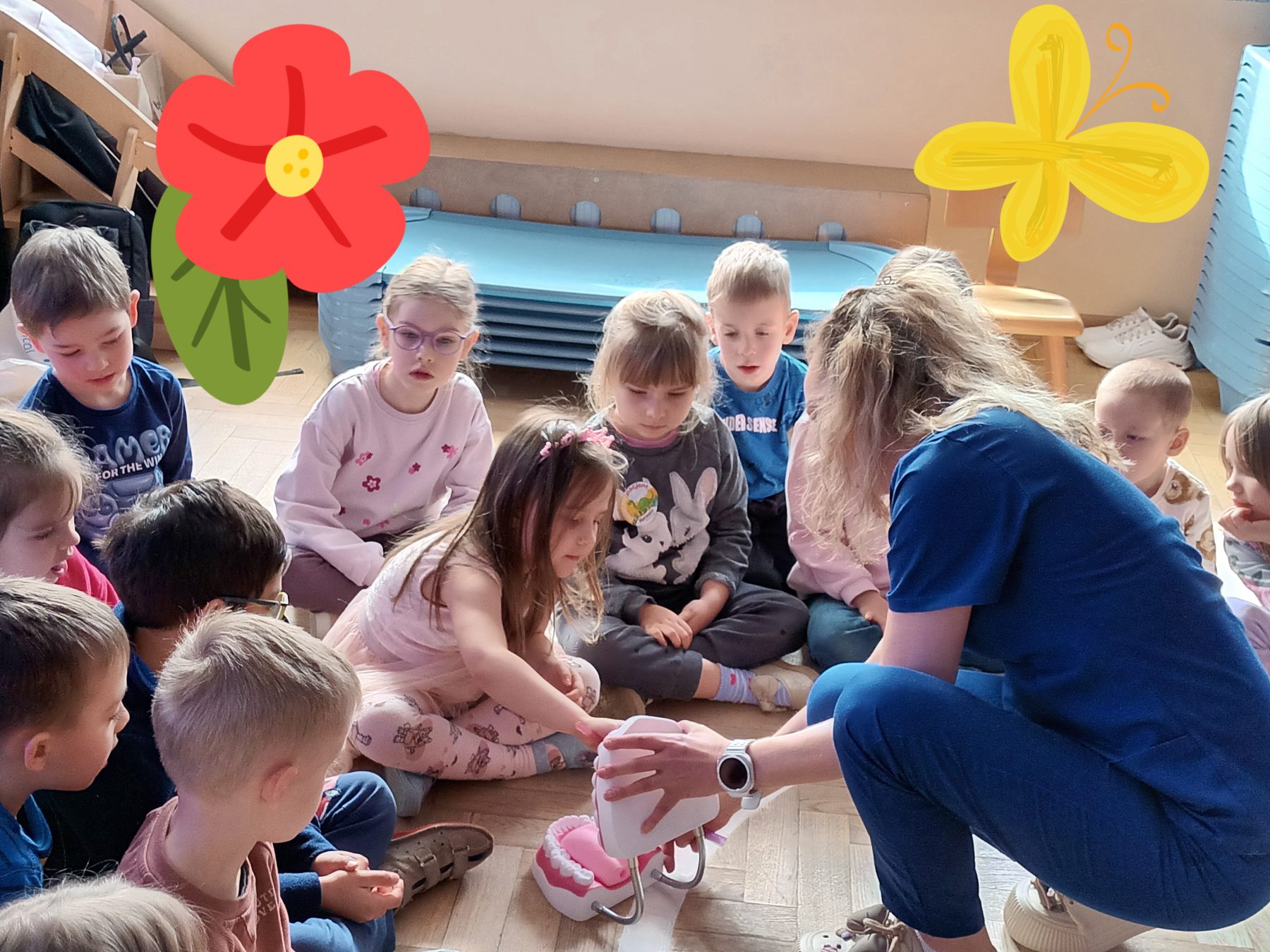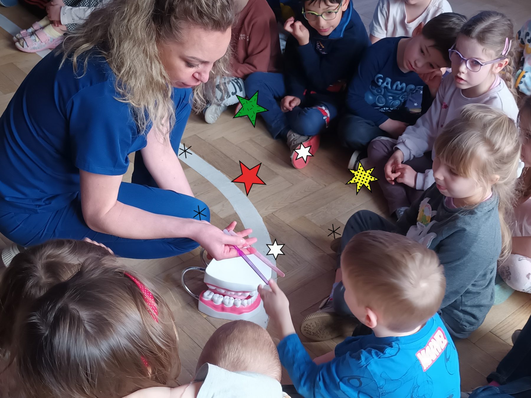 1 kwietnia w naszym przedszkolu w Grupie V i VI odbyło się spotkanie ze stomatologiem. Przedszkolaki z ogromnym zaciekawieniem wysłuchały pogadanki na temat właściwej higieny jamy ustnej. Dowiedziały się co to jest próchnica, dlaczego psują się zęby oraz w jaki sposób i ile czasu należy je czyścić. Dużym zainteresowaniem cieszył się model szczęki, na którym dzieci według wskazówek Pani doktor ćwiczyły prawidłowe szczotkowanie zębów. Dzieci zostały zapoznane z zasadami właściwego szczotkowania zębów i dbania o higienę jamy ustnej. Przedszkolaki dowiedziały się, jakie ruchy należy wykonywać szczoteczką, aby jak najdokładniej czyścić zęby. Pani doktor zachęcała dzieci do spożywania zdrowych i wartościowych produktów oraz owoców i warzyw jak i ograniczania słodyczy. Mamy nadzieję, że od tej pory już nikt, nie będzie bał się wizyty u stomatologa, a jak należy dbać o zęby dzieci zapamiętają na zawsze. Na zakończenie spotkania dzieci otrzymały naklejki i kolorowanki. Dziękujemy Pani doktor za edukacyjne spotkanie.