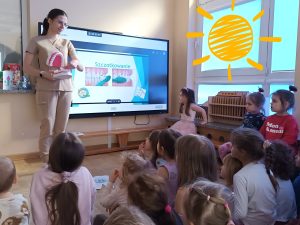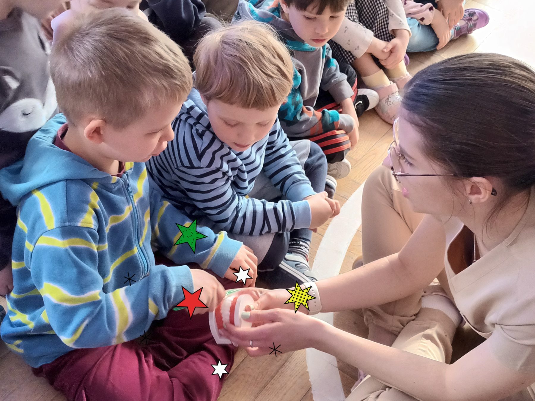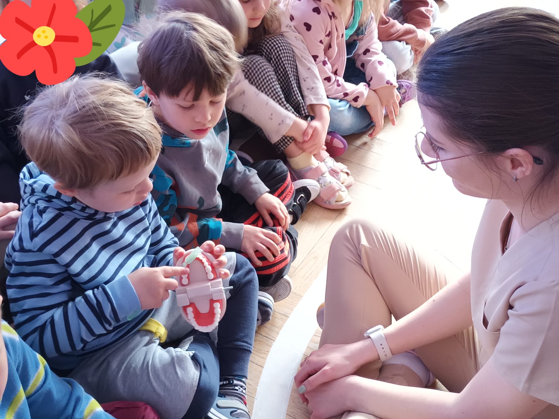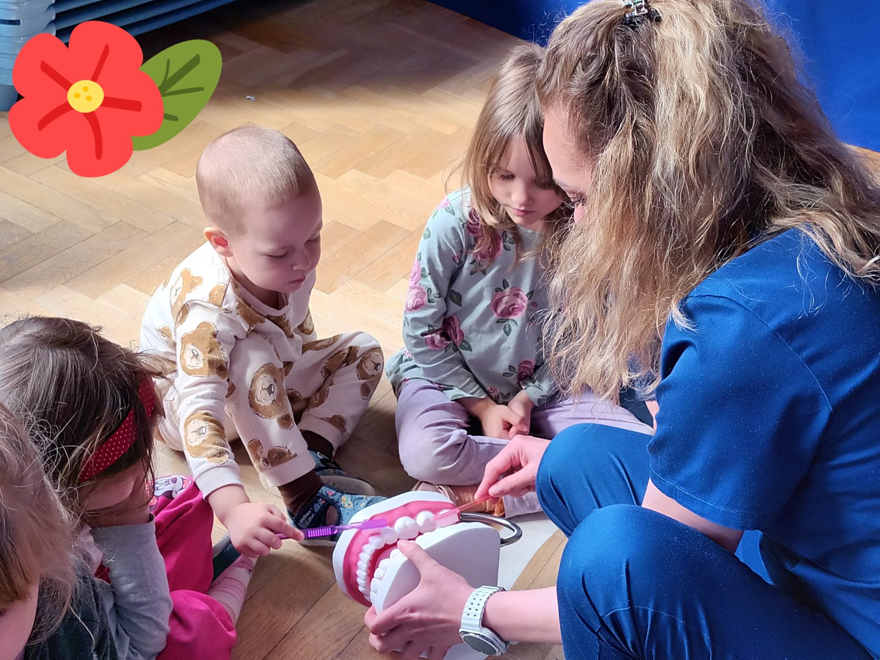1 kwietnia w naszym przedszkolu w Grupie V i VI odbyło się spotkanie ze stomatologiem. Przedszkolaki z ogromnym zaciekawieniem wysłuchały pogadanki na temat właściwej higieny jamy ustnej. Dowiedziały się co to jest próchnica, dlaczego psują się zęby oraz w jaki sposób i ile czasu należy je czyścić. Dużym zainteresowaniem cieszył się model szczęki, na którym dzieci według wskazówek Pani doktor ćwiczyły prawidłowe szczotkowanie zębów. Dzieci zostały zapoznane z zasadami właściwego szczotkowania zębów i dbania o higienę jamy ustnej. Przedszkolaki dowiedziały się, jakie ruchy należy wykonywać szczoteczką, aby jak najdokładniej czyścić zęby. Pani doktor zachęcała dzieci do spożywania zdrowych i wartościowych produktów oraz owoców i warzyw jak i ograniczania słodyczy. Mamy nadzieję, że od tej pory już nikt, nie będzie bał się wizyty u stomatologa, a jak należy dbać o zęby dzieci zapamiętają na zawsze. Na zakończenie spotkania dzieci otrzymały naklejki i kolorowanki. Dziękujemy Pani doktor za edukacyjne spotkanie.